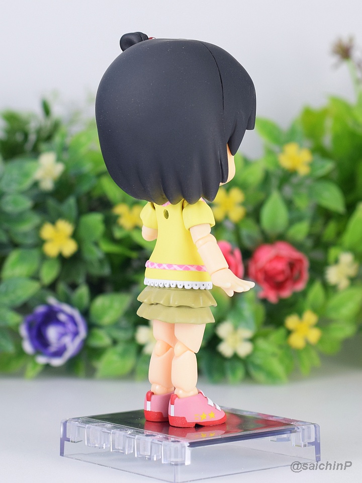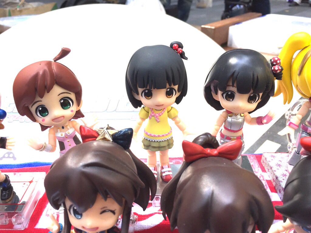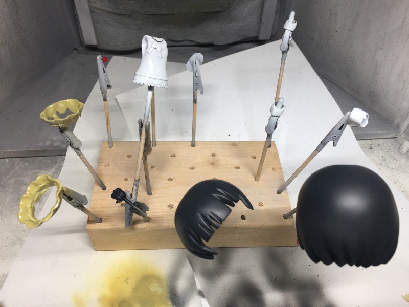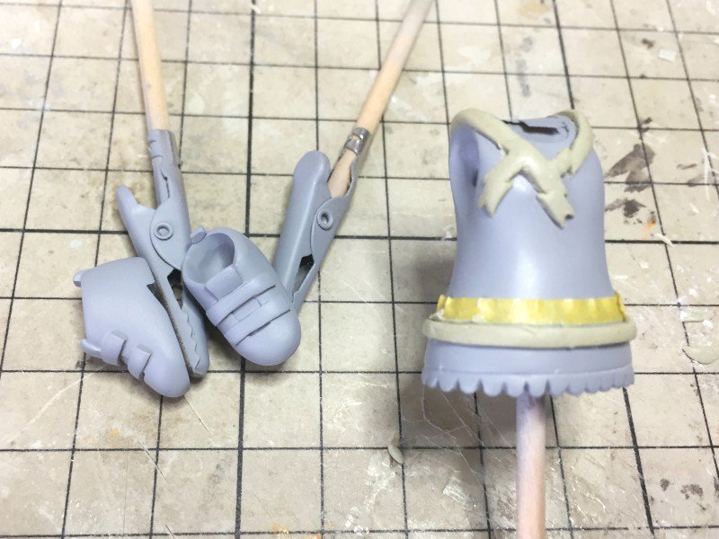ライブの前後は全国からPが集まるのでオフ会的にお互いに自作キューポッシュを持ち寄って見せ合ったりしています。 私もせっかくの5周年ライブなので新作として育ちゃんを作って持っていくことにしました。 ミリシタの私服です。 製作期間は5/23~6/1となっています、平日2~3時間、土日は5~6時間くらい作業してた感じなので30時間くらいでしょうか。 スク水ボディーを芯にして、マジックスカルプというエポパテで盛って作っています。 顔パーツは雪歩のものを無改造で使用。 ツールクリーナーで塗装を落としてから腰部分で分割して真鍮線で軸打ちしてワンピースをパテ盛りしていきます。 パテを多くこねてしまった場合は細部パーツにも盛っていきます。 ワンピース下側の2段のフレア部分は段ごとに別パーツで作って作業性と塗装時のマスキングの手間を省いています。 フリル部分もモールドを追加しています。 胴体と並行して髪の毛パーツも作ります、春香の髪パーツを加工してパテ盛りしています。 胴体と髪でお互いの部位のパテの硬化時間待ちの間にそれぞれ作業すると効率的ですね。 髪の毛を盛り削り、パテが余ったら髪のお団子というかおさげ髪や靴に盛っています。 半袖パーツは二の腕と直径の合うドライバーの軸にパテを持って硬化させた中空パイプ状の物を芯にして着脱可能にしています。 塗装時にマスキングしなくていいのと、未接着で多少上下にずらせるので肩部分の可動域確保の効果もあります。 靴パーツのディテールはパテの半硬化時になるべくヘラで形を出すようにしています。 胴体のリボンはまずサフ吹きして表面処理を済ませてからエポパテを盛って作業しています。 ボディーに凹凸があると表面処理が面倒になりますから。 各パーツにサフ吹きをしたあと、エアブラシで塗装していきます。 髪の毛パーツだけは影色に黒、基本色にジャーマングレー、ハイライトにダークシーグレーでグラデーションを入れてますがぱっと見だとわかりにくいです。 服部分は各色ベタ塗りでキューポッシュのフォーマットに準じています。 肩の関節パーツだけはガイアのマルチプライマーを吹いたあとにサフは吹かずに服と同色で塗装していますが動かすとすぐ塗装が剥がれますね。 髪留めは裁縫用のまち針の頭部分がちょうどよかったので赤は成型色で白い水玉は先端の丸いスパチュラ(ネイル用のドットペンが手持ちにないので代用)でちょいちょいと塗料を乗せています。 靴は基本色はエアブラシとマスキングで塗装、濃い赤部分はラッカー一発筆塗り、星マークはエナメル塗料で筆塗りしました、今回の筆塗りはここだけです。 リボン部分はチェック模様なのピンクを下地に吹いたあとでマスキングテープの細切りを斜めに貼って一度白を吹いたあとテープを剥がして再度交差するように逆向きにテープを貼って白を吹き付けています。 最後にクレオスのプレミアムトップコートのつや消しを吹いて完成。 短い製作期間なりによくできてよかったです。 将来的にはLTP08メンバー「ぐっすり艦隊」が揃えられたらいいかなーって ライブ前にはこんな感じで集まりました(6/2の様子)、ほとんど自作という熱量の高さです。