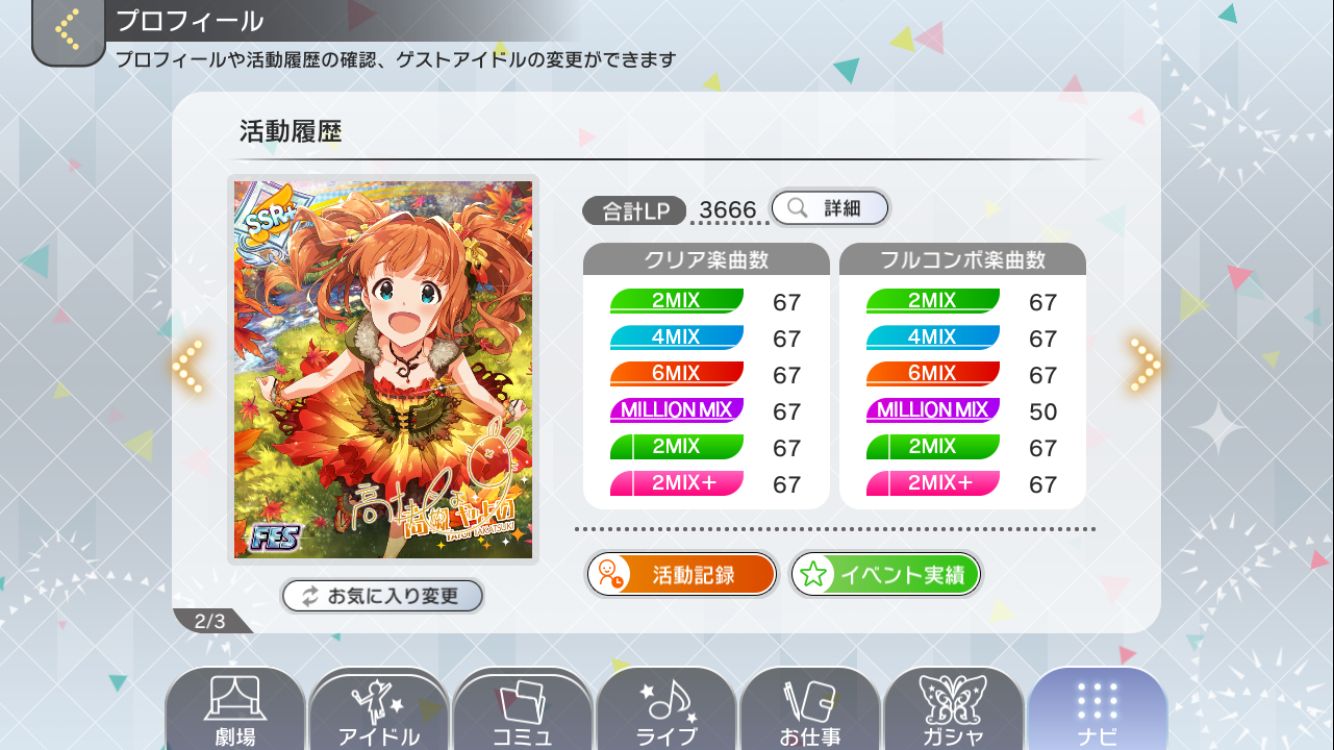 メモ用にプレイデータも貼っておきます。 基本的に5人ユニットのうち、やよい4+伊織または真美という感じでやっていましたがプレイ日数517で割ると1日に200くらい親愛を上げていたことになります。 現在は伊織の親愛が45000で真美が16000、その他のアイドルは2000~7000くらいです。 SSRを持っていないとユニットに入れにくいので低くなってしまいがち。 やよいは回復スキルのカードが未実装なのでオールやよい編成だと私の音ゲースキルでは楽曲Lv17以上の曲が危ないのです。 ミリシタはやよい、伊織、真美の上位イベントがもう済んで(3つとも上位入賞しました)いるし、FESもやよいおり同時にきて終わっているしで、来月予定の限定やよいを取ってしまえば当分はジュエルをひたすら貯める感じになりそうです。 関連 ミリシタやよいチャレンジ「全力投球!スポーツパークガシャ」編 ミリシタ用にiPadを導入 ミリシタのやよいイベントを走ってみた PR |