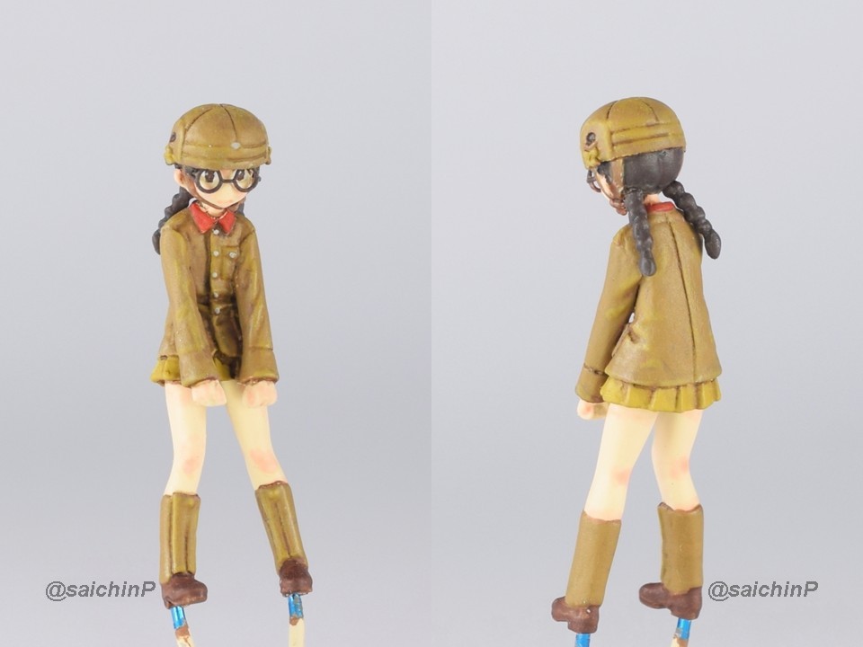 福田ちゃんフィギュアは肌色だけはラスキウスのホワイトピーチを吹きましたがあとはラッカー系の筆塗りとウェザリングカラーのスミ入れです。
