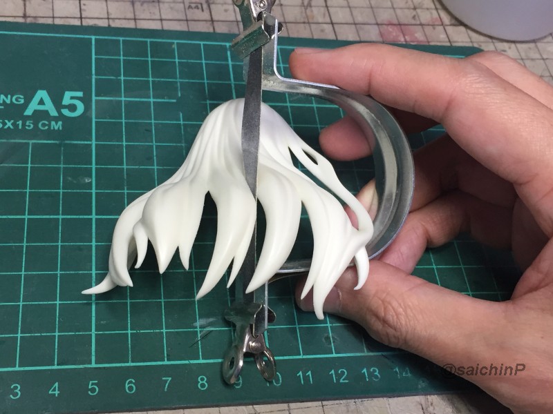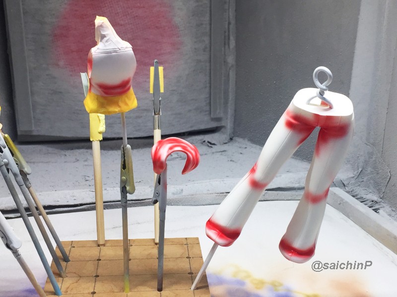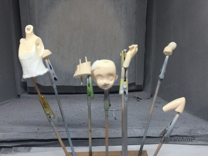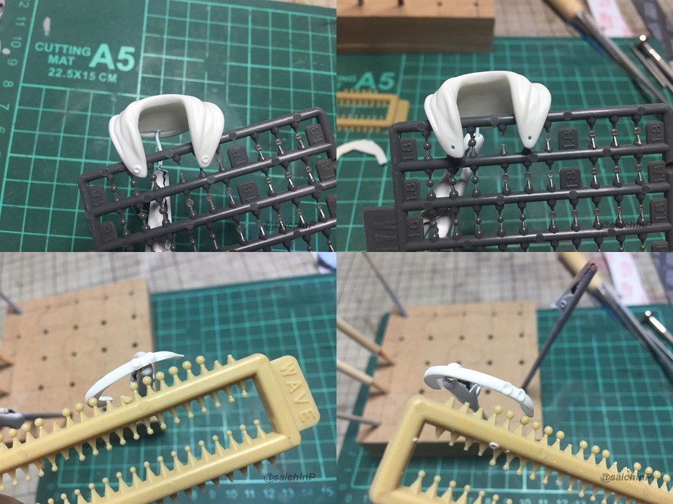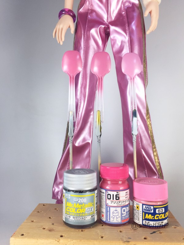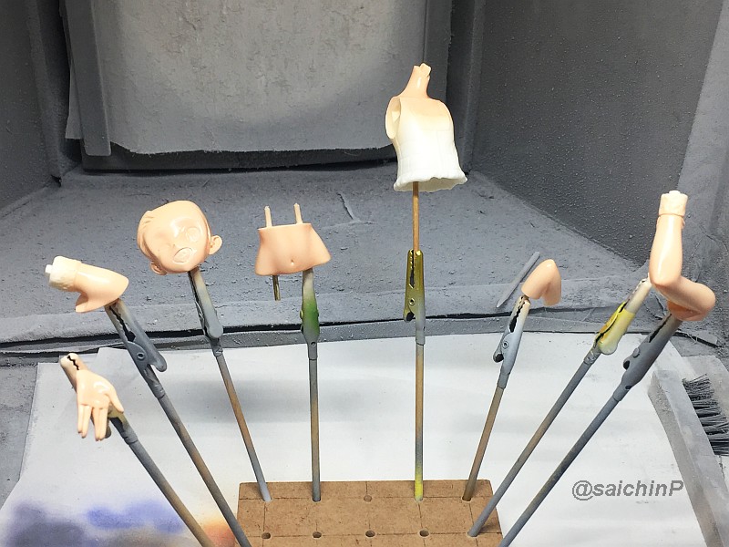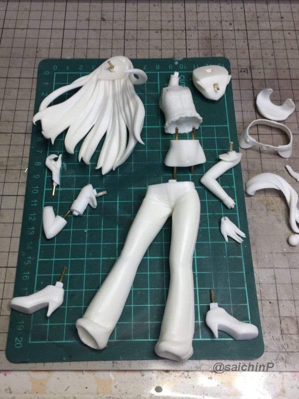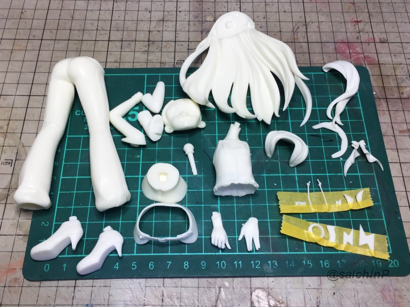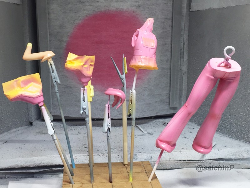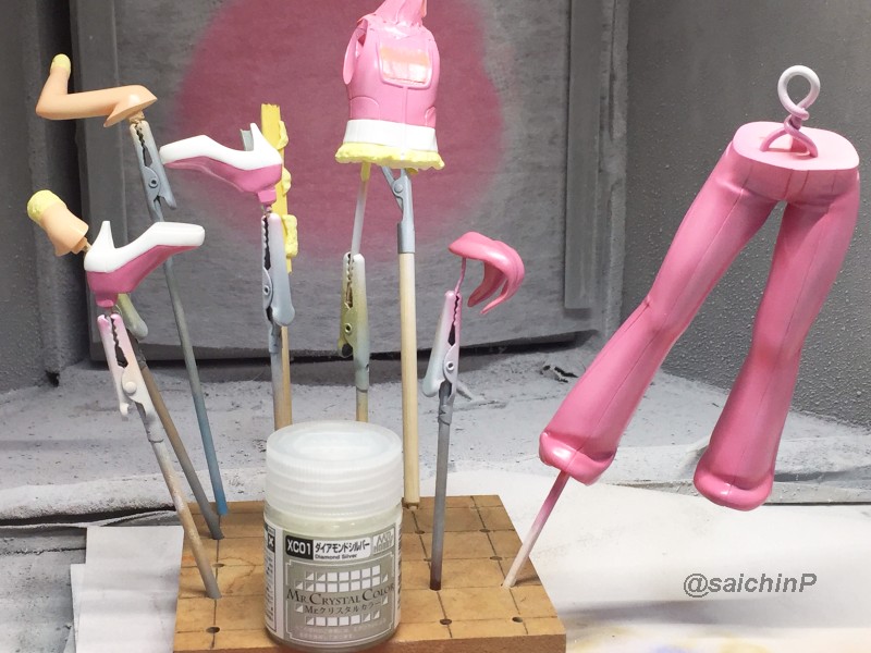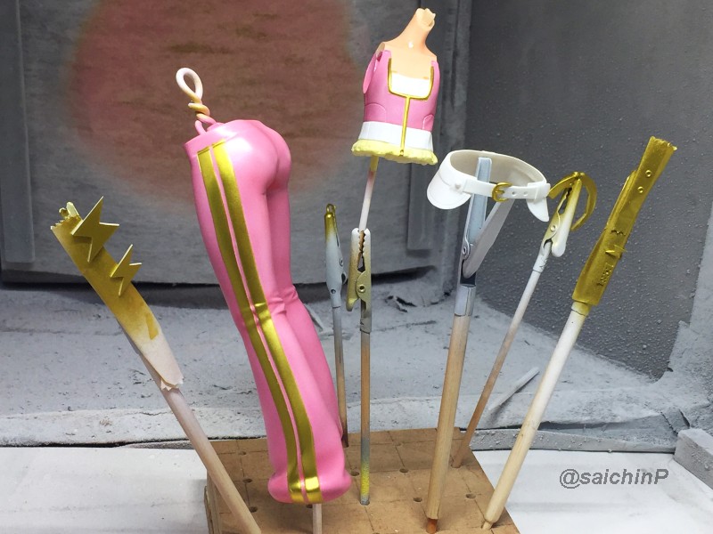 完成編はこちらの記事になります。 伊織誕生日なのでガレージキットを組みました2020 作業開始は3/27 パーツチェックとか洗浄、細かいパーツは後半に使うのでなくさないようにテープに貼ってまとめてます。 パーティングラインの処理、髪の毛パーツはこういう器具を作って磨くと便利。 市販品だとwaveからフレックスヤスリホルダーというのが出てます。 軸打ちは2mmの真鍮線でなるべく貫通させて精度を出すように心がけています。 細かいところは0.5mmの虫ピンとかも使用。 この状態で自立して感動。 ディテールアップ、主に塗り分けの利便性の為にwaveやコトブキヤのリベットパーツに置き換えています。 あと、全体のスジ彫りも深く彫ってスミ入れしなくても陰影がつくようにしています。 肌色パーツはサフレスにするのでガイアのマルチプライマーを吹きました。 口を練り消しでマスキングして塗装。 白目を白と影色の薄いグレーで吹いてマスキング。 肌色の下地はラスキウスのホワイトピーチ。 肌の全体にクリアーペールレッドを吹いた後に影や関節部などを濃いめに吹き重ね。 そして髪やリストバンドの塗り分けマスキング。 髪の毛の塗装。 影色にレッドブラウンを吹いてから基本色になる調色した伊織ブラウンを吹きました。 薄めに吹き重ねていって下地の白が透ける感じにした部分がハイライトになります。 衣装のピンク色の検討、ドールが同じ衣装なので参考にしました。 テストピースの右がクレオス63ピンク+ラフシルバー、真ん中ガイア16ブリリアントピンク+ラフシルバー。 結局、右と真ん中を混色した左ので決定。 ピンク1+ブリリアントピンク2+ラフシルバー2くらいの比率。 衣装は白サフ下地で影部分に赤を吹いてから、調色したメタリックピンクを吹きます。 仕上げに上からパール(クレオスのダイアモンドシルバー)を吹きます。 ハイライト部分に多めに吹き重ねてキラキラ感を増しています。 衣装の金色部分をマスキングして塗装。 足部分みたいな長い曲線はタミヤの曲線用マスキングテープが便利。 金色はガイアのエルドランゴールド。 細部パーツの塗装、腕輪はホワイトシルバー下地からのクリアーレッド吹き重ねでキャンディー塗装にしてみました。 眉毛とアイラインはエナメル筆塗り、はみ出したら爪楊枝で削ったりエナメル溶剤を含ませた面相筆で修正。 瞳デカールは4セット付属していたので安心。 瞳は1発OKでアイラインは2ミスでした。 IORIネックレスは付属の金属線を丸めています、パーカーの穴は別パーツ化の効果出てます。 ベースは百均で買ったコースターを裏返してニスを塗って仕上げてます。 仕上げに肌と髪につや消しクリアー(クレオスの水性プレミアムトップコート)を吹きました。 衣装はキラキラ重視でコートしてません。 顔はタミヤのウェザリングマスターのHセットで薄化粧しています。 そして完成! 4月末には撮影まで済ませて5/5の誕生日を待つだけでした。 関連 伊織誕生日なのでガレージキットを組みました2020 音無小鳥 シャイニーフェスタ水着Ver. 制作編 PR |