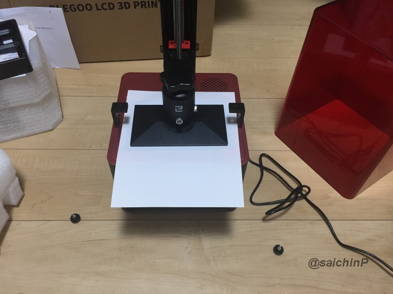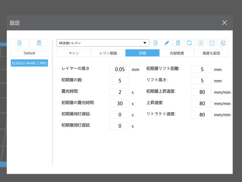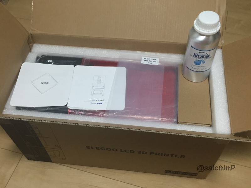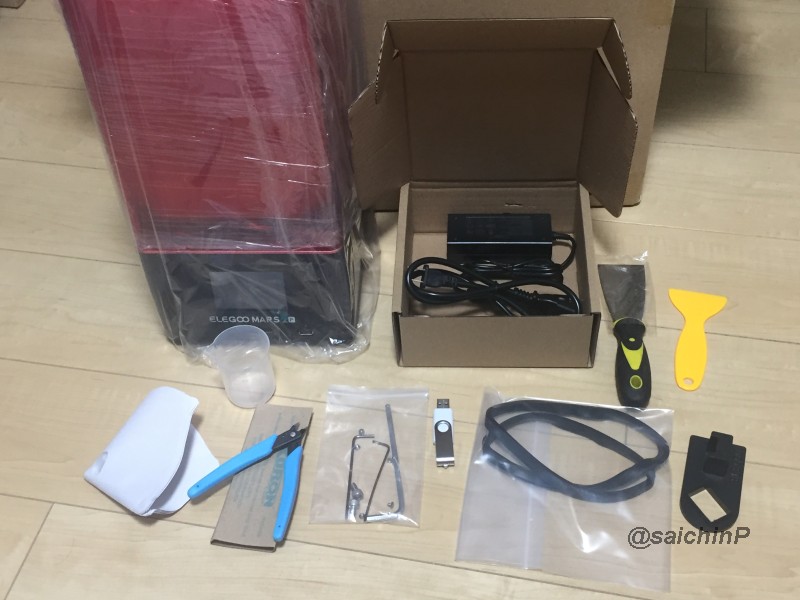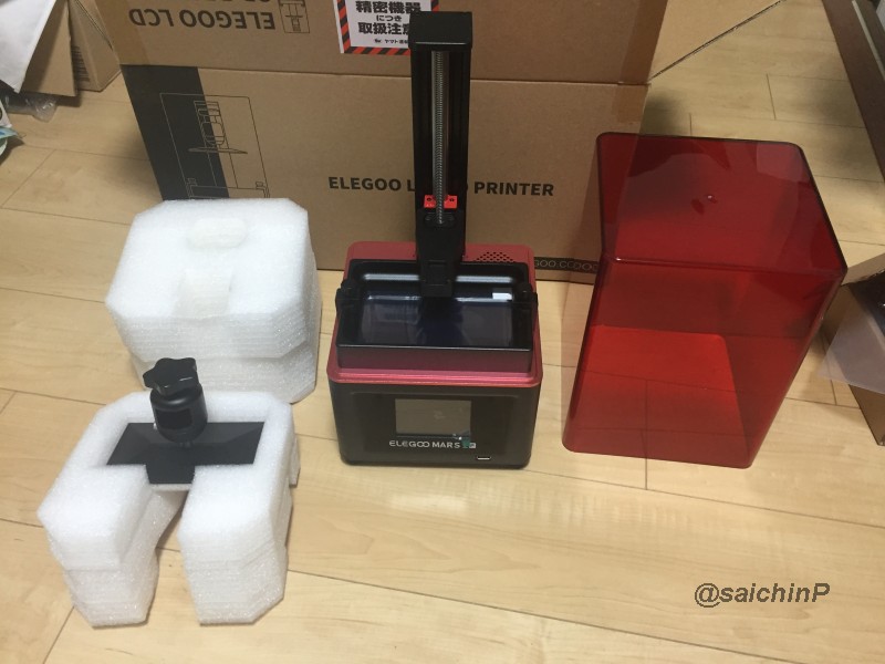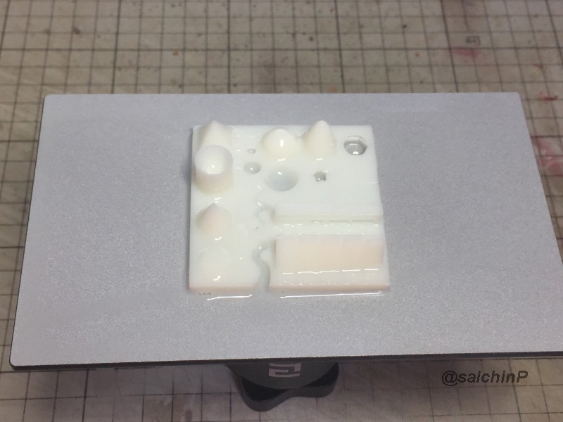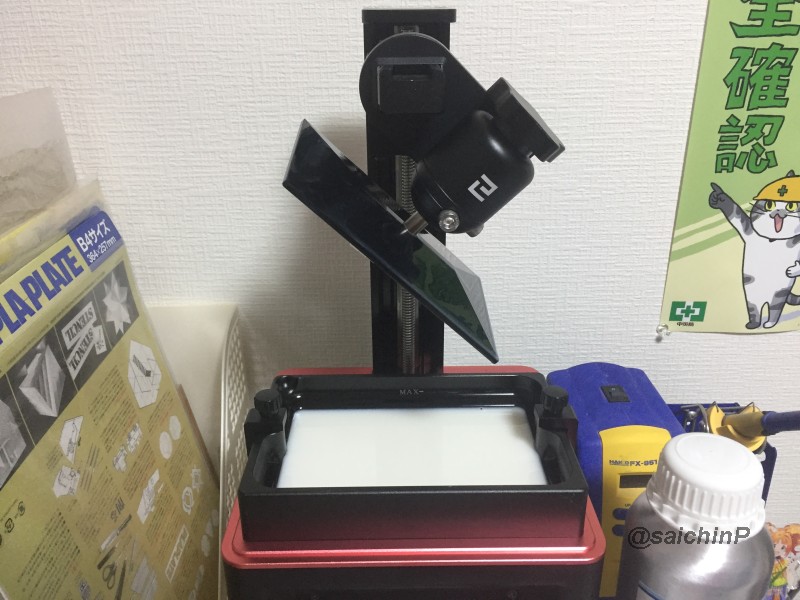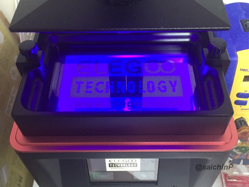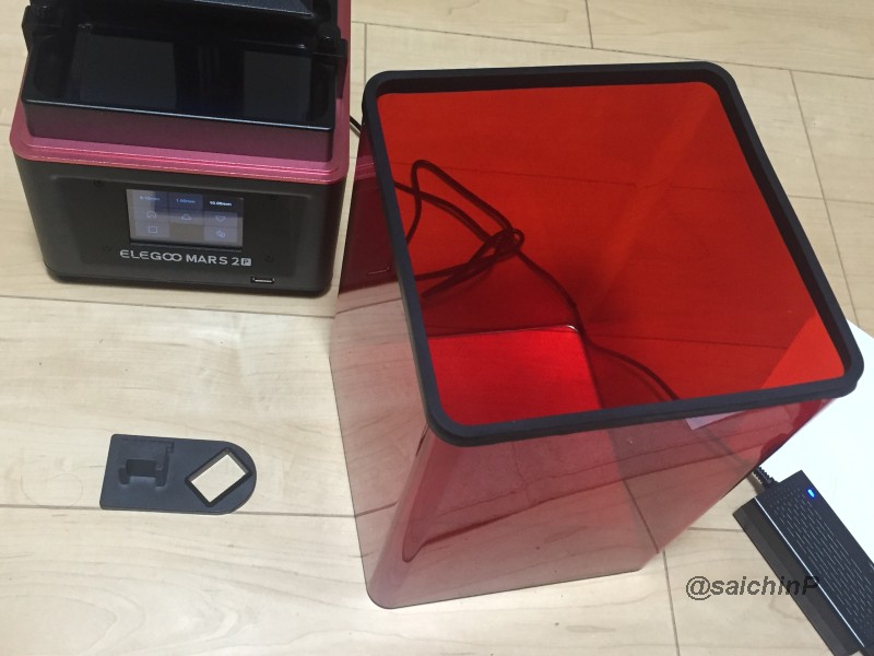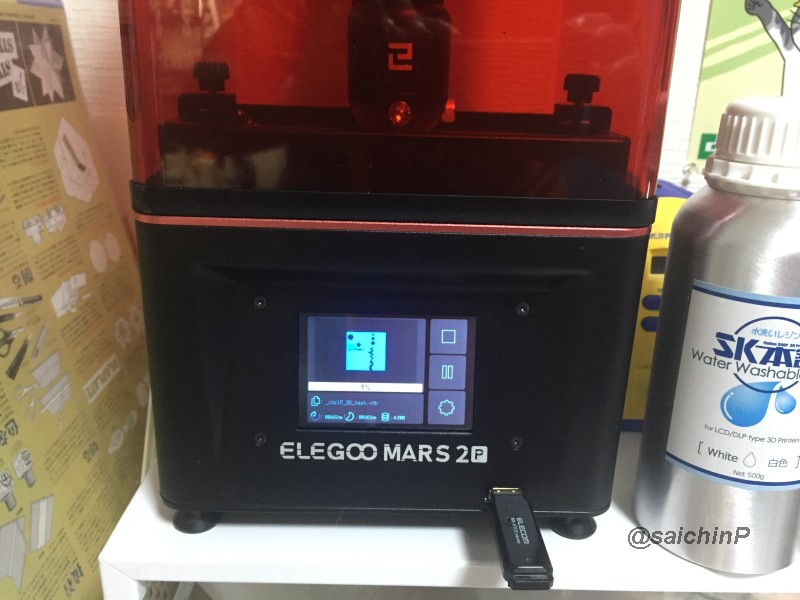 Elegoo Mars 2 Proという機種です、光造形です。 本体に諸々買い足して消耗品や維持費込みで給付金の10万円以内に収まるといいなという予算感で購入しました。 レビューと言うほど詳しくもないですが、到着からテスト出力までをざっくりと書いておきます。 私は3Dプリンターの購入/使用は今回が初めてです。 初めてなのでサポートが手厚そうなSK本舗というショップで購入しました。 届いた本体とおまけの水洗いレジンの2箱。 開梱すると保証書、説明書(日本語)、予備のフィルムなど。 レジンの箱も開けました、金属ボトル入り。 細かい付属品とか。 USBメモリー、電源ケーブル。ヘラやニッパー、レンチなどの工具類。 ビーカーや漏斗など。 右下の輪になっている黒いやつはカバーの縁に付けるパッキン。 さらに右にある黒いやつはプレートに付着したレジンを落とすためのもの。(後で写真あり) 本体はこんな感じ。 電源を入れてキャリブレーション。 プレートを一番下に下げた原点を出します。 紙を1枚挟んできつくなく緩くなく紙を引いて抜ければヨシ! カバーにパッキン取り付け。 ここまでリビングだったので設置場所の作業部屋に移動。 重量6.2kg、幅20cm、奥行き20cm、高さ40cmなので動かすのは楽。 とりあえずはこんな感じですが、データのやり取りはPCを直接繋がずにUSBメモリでできるのでPCから離れてても大丈夫。 稼働中はそこそこファンの音がします、私は同じ部屋で動いてたら眠れないと思います。 なので隣の倉庫部屋に移すかも。 UVライトの動作テスト、ヨシ! 本体の設置はこれで完了、付属のUSBメモリーからPCにソフトウェアのインストール。 ネットで見つけてダウンロードした、テスト用データーを出してみます。 白の水洗いレジンを注ぎます、濃いめの牛乳みたいな感じ。 こんな設定でやってみます。 USBメモリーから印刷データーを転送してスタート。 52分かかる模様。 出ました! 最初に書いていた黒い部品はプレートをこういうふうに斜めに固定して、余分なレジンを下に垂らすためのアダプターでした。 プレートから取り外しますがこれがすごく固くて外すの苦労しました。 そして水洗い、私は超音波洗浄機でやりました。 ちゃんと出ました、思ってたよりもすんなりと終わりました。(といいつつ、開梱からここまで3日かかってます) そのままテスト2回目。 サンプルの右側の細いスリットが一部くっついて詰まってるようなので、露光時間を2秒→1.5秒、剥がすのが固かったので、初期層の露光時間を30秒→20秒に変更しました。 出力結果、右のスリットは良くなったけど、文字の細いところなどが細くなりすぎな気もします。 プレートから剥がすのはずいぶんやりやすくなりました。 この辺は設定を色々試して追い込んでいきましょう。 いきなりフィギュアまるごと、とはいかなくても細かいアクセサリーとかのパーツをこれで出力できるようになれば捗りそうです。 関連 3Dプリンターの2次硬化用UVライトを準備しました モデラー向けの模型撮影ガイド 自作乾燥機でエポパテを強制乾燥 模型作業用の卓上集塵機を自作しました PR |