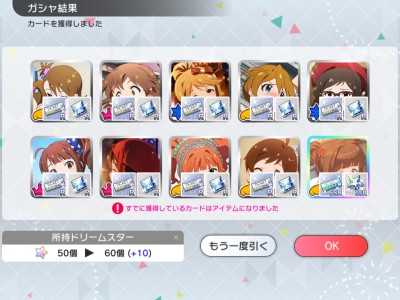 今回は「SONG FOR YOU!ガシャ VOL.33」(2022/10/12~2022/10/18)です、回せ~! 6月にあった伊織のS4Uで無償石を全部使い果たして0からの備蓄で約6万まで回復しましたが天井分までは揃いませんでした。 恒常なのでお手柔らかにといったところ。 回す前にこういうのを忘れずに。 10~30連は衣装チケットで回して持ってないミリクロSRがポツポツと出ました。 40連は特になしで50連で今回追加のミリクロ亜美。 60連でSSRやよい違いで前回のS4Uでした。 70連は特になしで、80連で新規の朋花ちゃん。 90連で新規の歩、ここまでSSR3枚なので期待値な感じですがピックアップぅ…… 100~140まで特になし、ここが一番辛かった。 そして、150連で2枚抜き、持ってる杏奈ちゃんと…… 今回のピックアップのもう1枚、紗代子。 ここでようやくピックアップの逆だと天井がちらつく、恒常なのに…… 160連は特になしで、170連で2枚抜き! 紗代子の2枚目とやよいちゃん! この「わぁ」がいいのでぜひ聞いてみてください。 覚醒前は懐かしの13歳オールドスタイルよれよれトレーナーです。 このイラストすごく気に入りました、タペストリー欲しい。 覚醒後は今回実装の衣装『オ・パッキャマラドゥ』のイラストでステッキを持った魔法少女スタイル。 4凸するとグリーン/オレンジのあまりないタイプの色の組み合わせになります。 コミュ連動のS4Uが終わったので、次回は髪色変更のか私服のかのどちらかになるのですが、これらは全員ローテーションなのでそんなにすぐには来ないと思いますが楽しみです。 今回は170連で新規SSRが4枚、被り3枚なので期待値5.1枚よりは上でなかなかですが、もうちょっとピックアップに仕事してほしかったという感じの結果でした。 それではまた次回のやよいガシャ出会いましょう。 関連 ミリシタやよいチャレンジ「セカンドヘアスタイルガシャ」編 ミリシタやよいイベントを走った記録 Deep, Deep Blue編 サンリッチの魔法少女ステッキを作る PR |