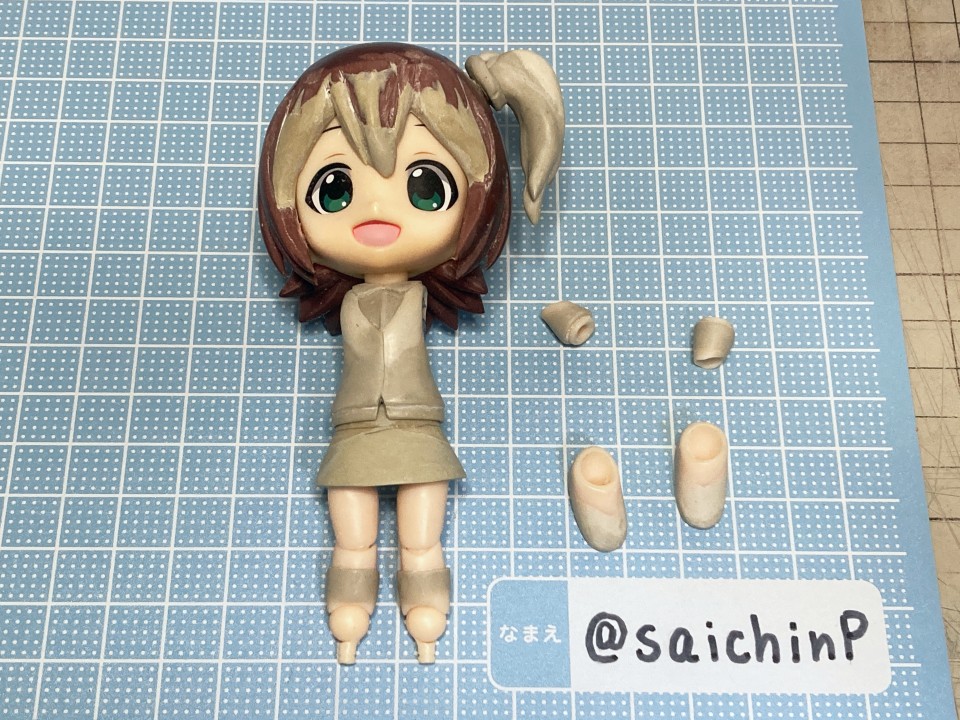 WFの準備もあるので作業期間1週間でやれることを詰め込みました。 以下、作業の様子です。 頭部と髪の毛は春香の物で後ろ髪は無改造、頭部は瞳だけリペイントしています。 胴体と手足はスク水ボディを芯にしてエポパテの盛り削り。 靴紐はエナメル線を編むようにして再現しています。 リボンタイはデジタルモデリングからの3Dプリンター出力。 塗装はスカートのチェック柄のマスキングが大変でした。 造形5日、塗装2日の計7日で完成です。 ライブ当日の集まりはこんな感じでした。 模型SNSにも投稿しているので支援いいねお願いします。