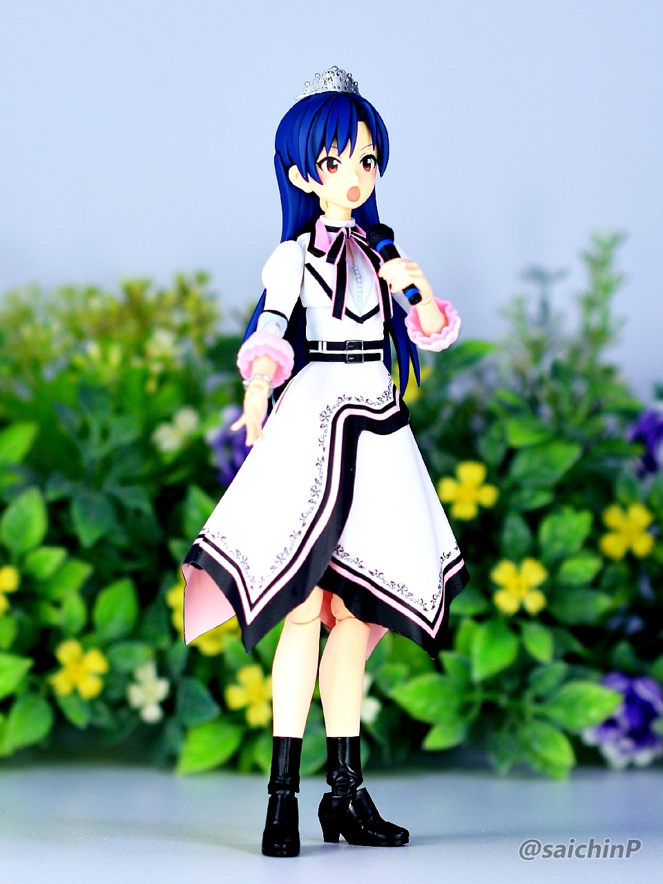 アイドルマスターの20周年記念として『YOU AND アイ!』の衣装で春香に続いて30MS化された千早です。 私の作例は追加でティアラを装着していますが、そのまま組めばちゃんと千早が出来上がります。すごいです。 先に出た春香と同じ衣装なので胴体部分のパーツ構成は基本的には同じですが上半身のサイズが春香よりも薄い専用パーツとなっています。 ここからは実際の部分塗装での作業内容になりますが、胴体部分は春香と共通なので春香の時の記事を参照してください。 30MS 天海春香を部分塗装で仕上げる ↑この画像は拡大できます 春香と違う部分を中心に解説します。 上半身のパーツ構成 春香(赤丸)と千早(青丸)では上半身のパーツ形状(サイズ)が違うものが入っているのですが、組み立ての手順やパーツ数は全く変わらないので、そこは問題ありません。 前髪の分割ラインの変更 説明書のパーツ図を見て確認してください。 前髪が2パーツの構成になっていて目立つ部分に合わせ目が来るので、HA-B9とHA-B3を接着して合わせ目を消してスジ彫りを彫り直しています。 そうすると、前髪が後ハメできなくなるので、横髪のパーツ、HA-B7、HA-B8のピン(赤丸部)をそれぞれ切り落として前髪を後ハメできるように加工します。 髪を塗装することが前提ですが前髪は目立つ位置なので効果はあると思います。 髪の塗装 髪の毛はパーツに合わせ目が出るので埋めて塗装するほうがきれいに仕上がります。 千早の髪色は新作ほど明るい傾向がありますが、私は初期の黒髪に近いのが好きなので成形色よりは暗め濃いめの青にしました。 レシピはクレオスラッカーの5、67、328を同量くらいで混ぜて365で暗くして隠し味に72を1滴。 凹部をエナメルのシーブルーでスミ入れしています。 マイクの塗り分け 春香は赤でしたが、アイドルのイメージカラーなので千早は青の帯を2本入れました。 ミリシタの『ライブ革命』イベントのカードイラストを参考にしています。 手前で見切れている雪歩のマイクは白線ですね。 顔のメイク これは春香と同じでチークを濃いめに強調、閉じ口にスミ入れしてリップを描き加えています。 ブレスレットの宝石は春香と色が共通です。(アイドルのイメージカラーではない) 千早独自の作業内容は以上です。 最後に春香と合わせたライブ風写真を そして、SNSにもアップしているので、いいね支援等よろしくお願いします。