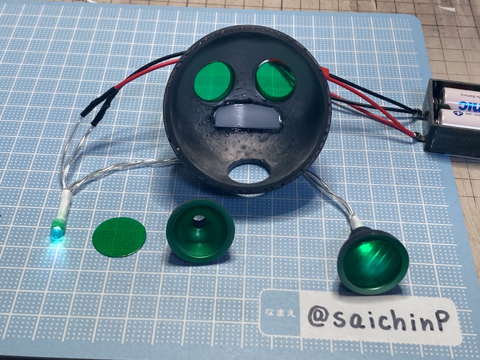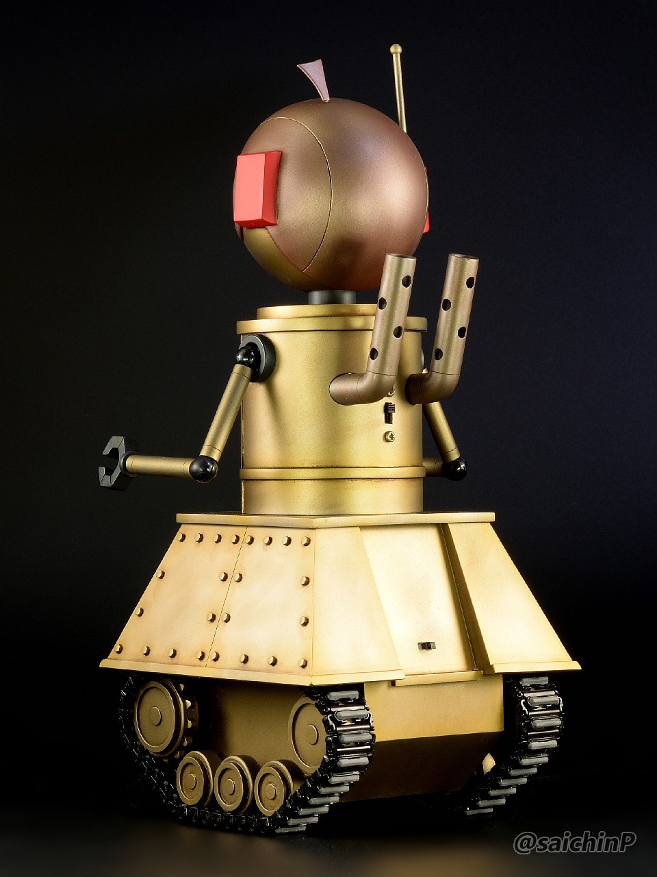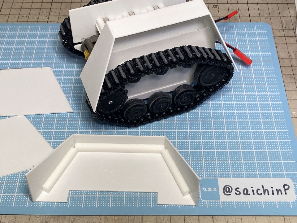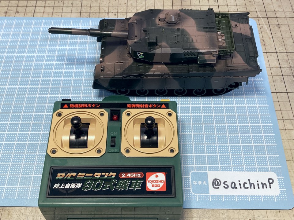 6月に作品の募集があったので私はこの『ひなたロボ』で応募してみました。 埋め込んだ投稿内の動画も見てください。 完成した『ひなたロボ』の画像がこれらになります。 モーター内臓の3chラジコンで走行と上半身の旋回ができます。 基本スペックは全高25cm、重量600g(電池込み) そして2ヶ月後の8月、アートコンテストの結果が発表されまして、この『ひなたロボ』が特別賞をいただきました。 アートコンテスト入賞作品公開 - ミリシタ8周年特設サイトより 入賞の記念にミリシタ8周年のタペストリーをいただきました。 2007年に初めてやよいピンキーを作ってからアイマス関係のあれこれを18年作ってきて、公式のコンテストで受賞できたのはとても光栄で嬉しかったです。 ここからは『ひなたロボ』の制作工程を書いていきます。 『ひなたロボ』というのはミリシタの『無邪気なメカニック 萩原雪歩』のカードにいるロボで、正式名称はわかりませんがスチームパンクの世界観で見た目が木下ひなたちゃんに似ているロボットです、なので界隈ではだいたい『ひなたロボ』と呼ばれているようです。 作業開始は2023年9月で、これは前年の2022年の年末に最初のアートコンテストが行われたので、第2回があるなら2023年の年末だろうから、それに向けて早めに作り始めておこうという見切り発車的な計画でした。 『ひなたロボ』としたのは私がミリシタのシアター組の中ではひなたが好きなのと、普段からチュパカブラとかでんでんむすくんみたいなネタ寄りな物を作るのが好きなのと、コンテストである以上は入賞を意識して、そのためには動いて光ってそれを動画で公開するくらい派手にしないと埋もれるだろうなという読みからでした。 そんな感じでラジコンで動く『ひなたロボ』の制作が始まります。 最初にベースとなるラジコンユニットの調達です。 京商のRCミニタンク90式戦車、特売で新品900円で投げ売りされていたのを購入。 走行と砲塔旋回、主砲発射ギミック(発光と発射音)が付いてこれは安すぎ。 分解して内部を覗いてみると、履帯はゴムで長さの調節ができないのとギヤボックスはシャーシと一体なので使用不可。 RCのコントロール基板と砲塔旋回機構、電池ボックス、それとプロポを流用して組み込むことにしました。 履帯はタミヤの『連結式クローラー&スプロケットセット』を使用。 楽しい工作シリーズが懐かしすぎです。 ただしスプロケットはプラの材質が塗装不可なのとサイズの都合で要自作です。 ギヤボックスはタミヤの『ツインモーターギヤボックス』を使用。 これのサイズにより車体幅が決まります。 転輪類はデジタルモデリングして3Dプリンターで出力。 履帯は42枚連結したものを2本作りました。 フローリングの床でもすべらないゴムパッド付きです。 車体はプラ板の箱組み。 基板類を仮置きしての走行テストは良好なのでボディーを組んでいきます。 車体幅と履帯の幅はいじれないのでフェンダーをオーバーサイズにすることでプロポーションを元イラストに寄せるように調整をしています。 元のRC戦車の砲塔旋回機構を移植して上半身を旋回できるようにしました。 頭部は3Dプリンターで出力。 上半身は外径60mmのVU塩ビパイプで、この写真ではバランス調整前なので胴長です。 胴体の長さを調節して3Dプリンター出力した排気管を追加。 腕は市販の外径6.5mmプラパイプとボールジョイントを加工。 ハンドパーツやボルトのディテールは3Dプリンター出力で追加。 頭部の電飾は百均のLEDを分解して使用。 目のレンズカバーは市販の透明スプーンを加工。 そのままだと緑が薄かったのでクリアーグリーンを塗りました。 レンズ内部の縦線モールドもプラ板で追加しましたがわかりにくいかも。 髪の毛モールドはエポパテを薄盛りで耳は3Dプリント製。 あと、胸元にも小さなLEDを仕込んでいて発光します。 この辺まで作業したところで、コンテストの告知が出ました。 ところがなんと、イラストのみのコンテストだったので失意のまま作業中止。 計画は凍結となったのでした。 それから、塩漬け状態で1年半放置されていたのですが、2025年の5月29日にアートコンテストが告知されて作業再開です。 造形作業はほとんど終わっていたのでアンテナを追加して細かい修正をしました。 耳のアンテナはRC用の機能はなくてただのプラ棒です。 全パーツを組んでサイズ比較用のキューポッシュひなたちゃんと。 塗装は黒下地にブルーゴールドやカッパーを吹き重ねてスチームパンクらしい真鍮や銅のイメージで。 ウェザリングカラーで軽く汚したりして完成です。 プラ板、パテに3DプリントでのフルスクラッチでモーターライズとRC組み込み、さらには電飾までと模型の総合力を試される制作でしたが完成させることができてよかったです。 また次回アートコンテストがあるなら参加したいですね。 関連 ミリシタアートコンテストに参加してみた ミリシタアートコンテスト その後 アイマス