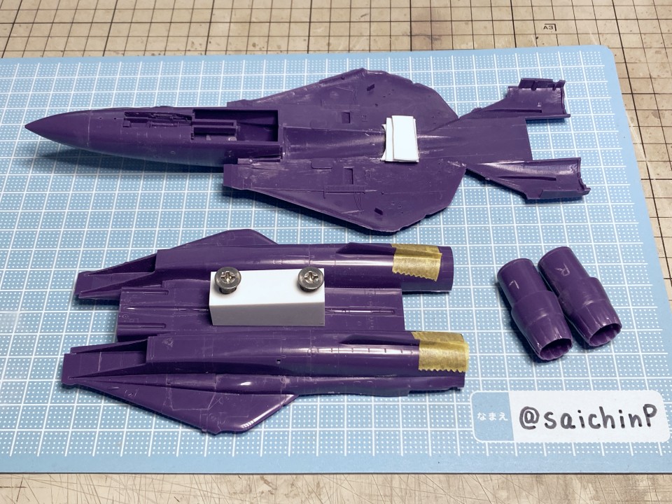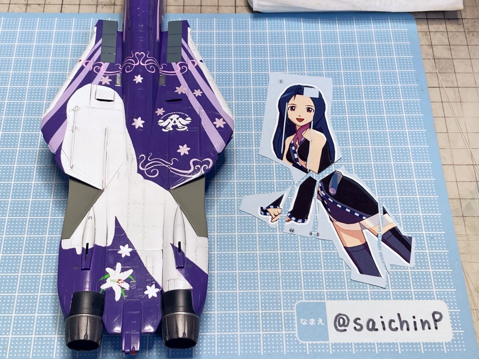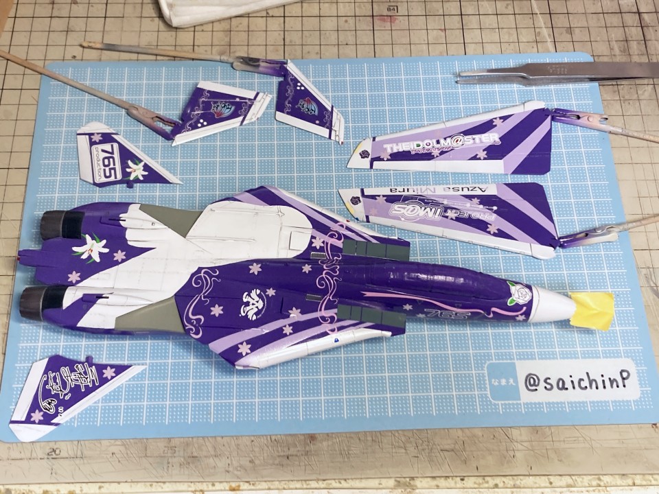 完成編の記事はこちら あずさ誕生日なのでF-14Dを作りました ハセガワのF-14はパーツ分けが細かくて大変と噂には聞いていたキットですがどうなるか。 しかもエッチングパーツ入りの豪華仕様。 機首と胴体の嵌合がパーツ割が複雑でエアインテイクとの兼ね合いもあって大変でした。 擦り合わせたり、プラ板を噛ませたりしてなんとか調整。 額縁固定用にナットを仕込んで、スペーサーをプラ板の箱組みで作りました。 各種メンテナンスハッチ、フラップやスラットなどの動翼、エアブレーキなどが開閉選択式の別パーツ化されているので全部閉じたフラットな状態で作ろうとするとチリ合わせにかなり調整が必要になる感じでした。 1/72スケールとしては過剰かなという印象。 コックピットとキャノピーはいつもな感じの仕上げ。 内部をNATOブラックベタ塗り、キャノピーはスモークグレー塗装。 エッチングパーツはほとんどがコックピット用でしたが未使用です。 塗装は白を吹いてライン類をマスキングして紫を塗装。 細部の塗り分けとウェザリングカラーのマルチグレーでのスミ入れ。 その後にクリアコートで一旦保護。 デカールはキット付属の物は使わずに『アイドルマスタープロジェクト プラモデルカタログブック』というムック本の付録のパール仕様デカールを使いました。 これで全機作ったときに1機だけパールじゃなくて周りから浮くことを避けられるはずです。 あずささん以外の各種ラインやロゴデカールを貼った状態。 さすがに慣れましたね。 メインのあずささんデカールは機体背面のフィンや可変翼や垂直尾翼の切り欠きなどでかなりの難易度です。 失敗して破く未来しか見えなかったのでいくつかに分割して貼りました。 貼り終わったところです。 このあとは細部パーツの取付とクリアコートを施して完成です。 作業期間はWFの原型と並行しつつで約2ヶ月くらいでした。 アイドルデカール貼りの難易度は今までで一番高かったかも。 関連 あずさ誕生日なのでF-14Dを作りました ラファール M 水瀬伊織 制作編 ミラージュ 2000 高槻やよい 制作編 |