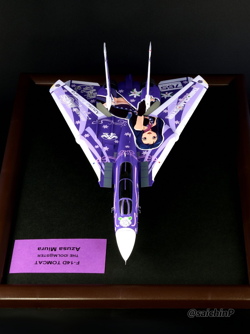 ハセガワの1/72スケール、F-14D トムキャット "アイドルマスター 三浦あずさ"を作りました。 1/72スケールのアイマス機を全部作ろうシリーズの今年3機目、通算だと9機目です。 作業の様子についてはこちらの別記事でどうぞ。 F-14D 三浦あずさ 制作編 F-14は可変翼なので広げた状態も。 主翼のラインの繋がりからは広げた状態でのデザインとなるようですが、展示スペースの都合もあるのでこの写真を撮ったあとに閉じた状態で固定しています。 いつものように飛行状態の額縁固定で作っています。 デカールはキット付属のものではなく、過去に出ていたアイマス機のムック本の付録デカールがパール仕様なのでそれを使用しています。 懐かしのロングヘアあずささん、デカールを貼る難易度は高めでした。 作業期間は2ヶ月くらい、WFの準備期間と重なっていたので苦労しました。 作った9機は2部屋に分けて展示しています。 SNSにも投稿しているのでいいね支援等よろしくお願いします。