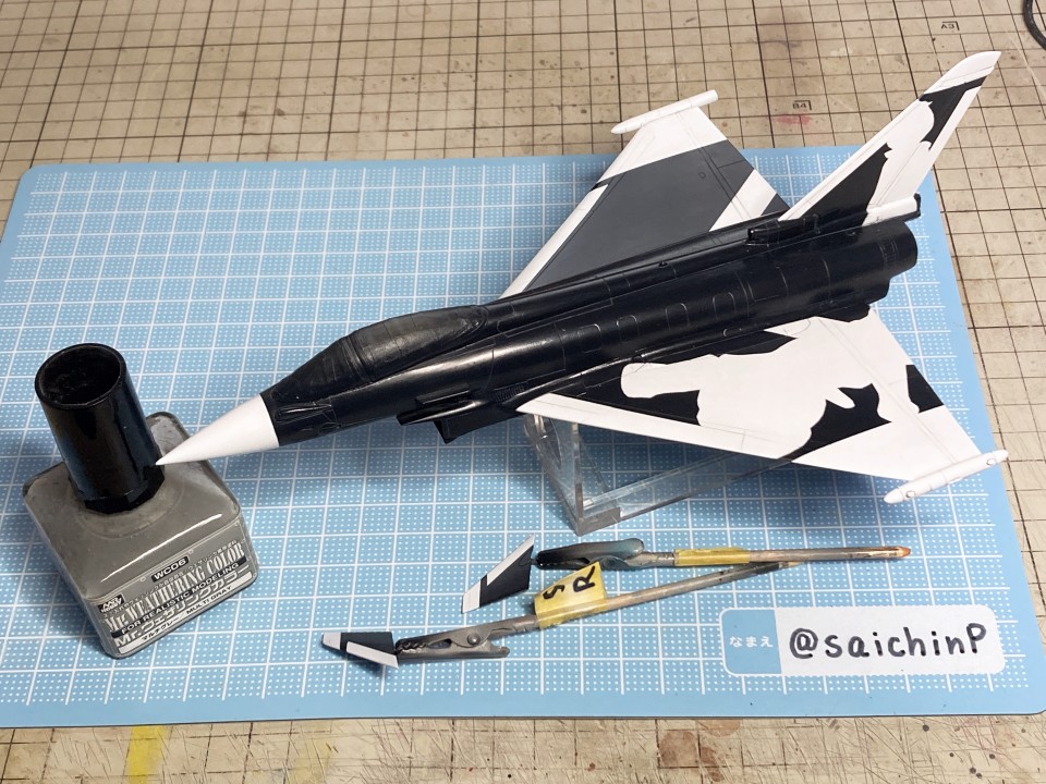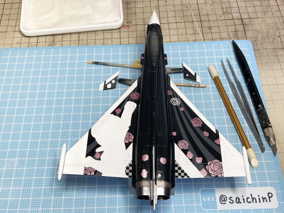 完成編の記事はこちら 真誕生日なのでタイフーンを作りました キットは中身がドイツレベル製の物です。 後年にハセガワから新金型で繊細なモールドの素晴らしいタイフーンのキットが出ているのですが、それと比較するとバリ、ヒケ、歪みなど多く組み立てにはそれ相応の手間がかかります。 デカールだけ流用してハセガワのキットを使ったら楽だろうなと考えてしまいますが、私は当時のキットで作ることをコンセプトにしているのでこのままいきます。 下面に額縁取付用のナットを仕込んで、脚カバーは飛行状態に閉じます。 サフ吹いてチェックすると、ヒケ、歪み、段差などがあちこちにあるので国産キットのパチピタというわけにはいきません。 主翼下面がエアインテークと一体なのでここの合わせが一番手間がかかりました。 後から主翼上面を取り付けて形になったらコックピットをジャーマングレーでベタ塗り。 キャノピーも磨いて整えないと表面がでこぼこしています、取り付けたらマスキングして表面処理と消えたスジ彫りの修復とかをしました、ここが一番時間がかかっています。 納得できる表面になったら下地の白を吹き付け。 機体色が黒なので、白ライン以外の部分の胴体とかはサフ地のままです。 いつもな感じに白ラインとアイドル部分のマスキングをして機体色の黒を吹きます。 説明書のレシピに黒を足してより黒っぽくしたものを吹きました。 マスキングを剥がしたらクリアーを吹いてウェザリングカラーのマルチグレーでスミ入れ。 ここまで、白、黒、クリアーを吹いてますが都度、軽く研ぎ出しをしています。 2000番で数回軽く撫でてからメラミンスポンジで擦る感じです。 ノズル部分の金属色をマスキングして塗り分けました。 ちなみにノズルは開状態、閉状態の選択式でしたが、閉状態は湯が回って無くて欠けていて使えなかったので選択の余地なく開状態を使用しています。 デカール貼りは最初に主翼のハの字のラインデカールを貼ります、白を塗装にしているとデカールをカットする必要があるのでやや難易度高いです。 薔薇の花びらデカールを重ねて貼っていきます。 今回からデカール用のぬるま湯の為にカップウォーマーを導入しました。 朝から晩まで作業しててもぬるま湯状態がキープされて便利でした。 花びらの後にロゴやらコーションデカールを貼って、最後にアイドルを貼ってデカールは終わり。 このあと乾燥させてからぬるま湯で拭いてデカールの糊などを拭き取ってから半光沢クリアを吹いて完成です。 作業期間は約4週間。 関連 真誕生日なのでタイフーンを作りました F-2A 双海亜美&F-16C 双海真美 制作編 Su-33 星井美希 制作編
