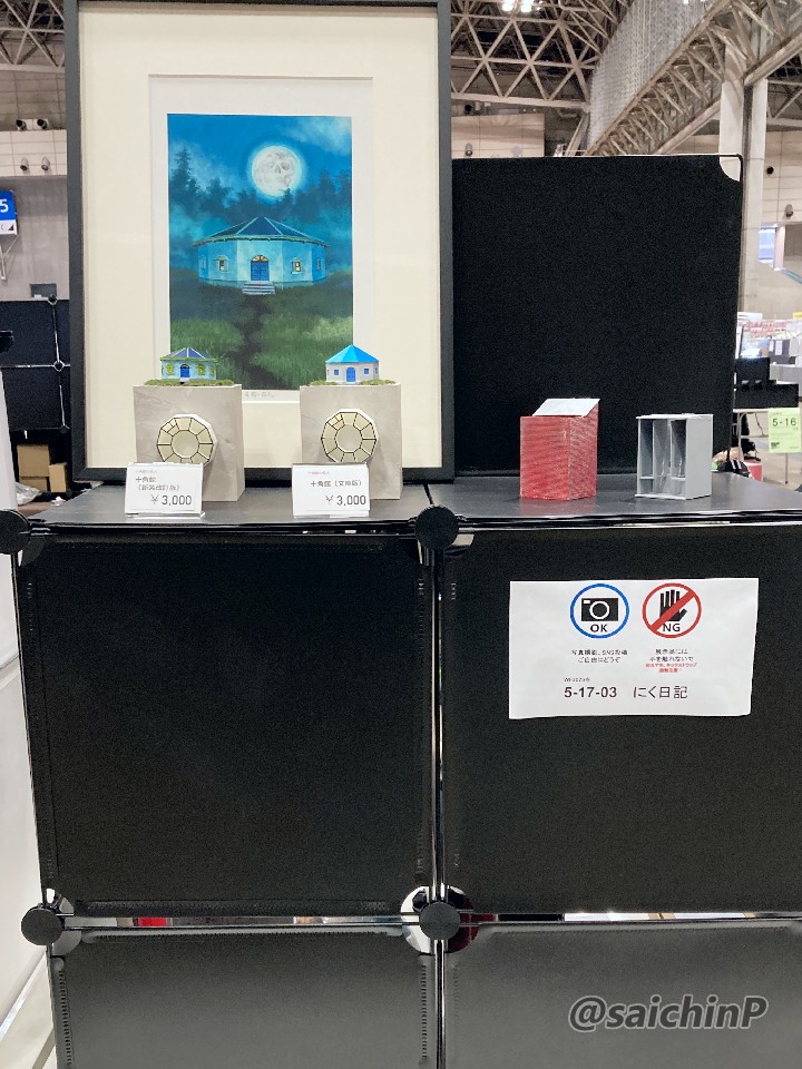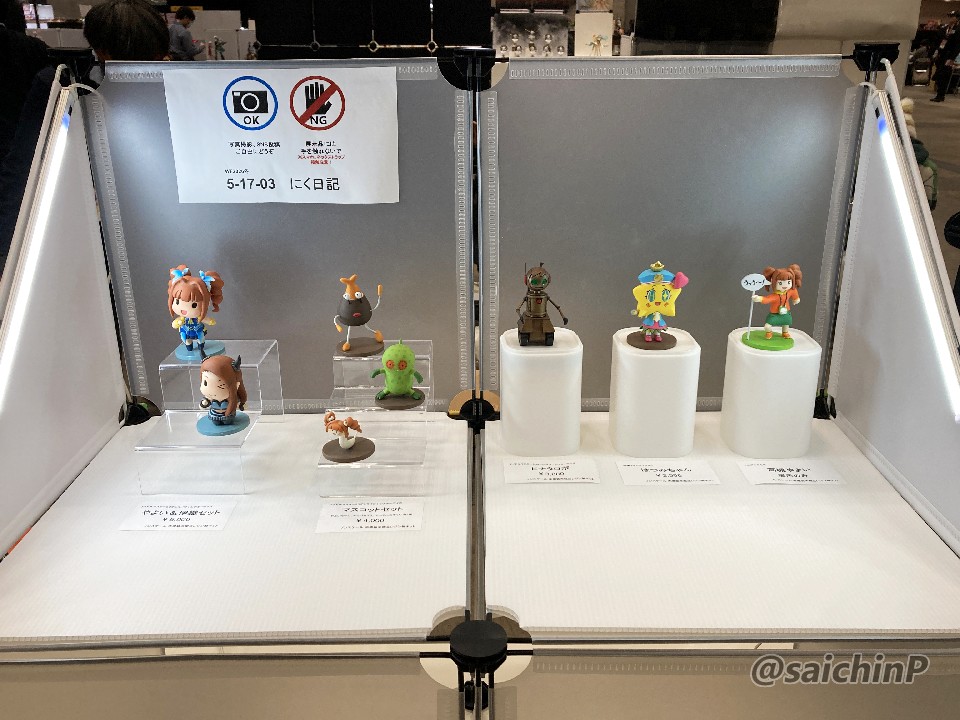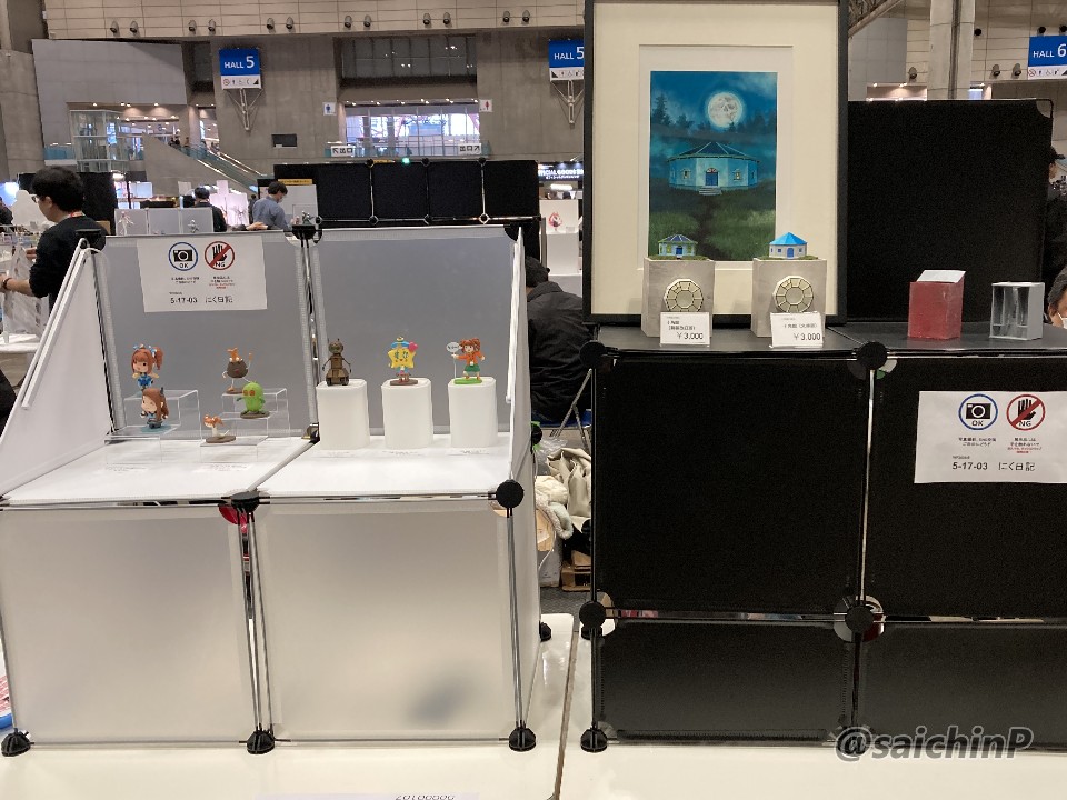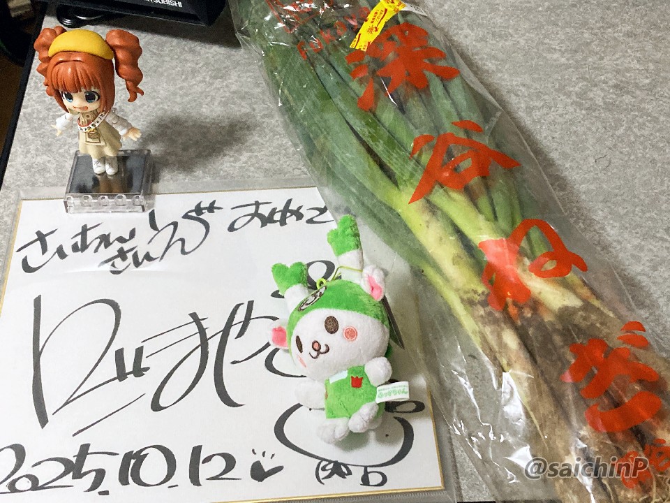ディーラー名 にく日記 卓番 5-17-03 当日の卓の様子です。 それぞれの拡大。 前夜から雪が降っていたため電車の遅延があり、予定よりも遅い現地入りとなって、卓の設営完了が開場ぎりぎりでした。 でも、2014年の冬に比べたら大したことなかったなというのが当時を知る強者たちの感想。 私たちの卓があった場所は奥まっていてかなり暖かくて上着を脱ぐくらいで快適でした。 出入り口が近いところは寒かったようですね。 余談ですが去年の10月に仁後真耶子さんと平田宏美さんのトークショーが埼玉の深谷市にある埼玉工業大学であって行ってきたのですが、そのイベントの開幕時に登場した「ふっかちゃん」がWFに初参加しているのを現地に着いてから知って、撮影してきました。 かわいい! これは件のトークショーに参加する前に深谷の道の駅でお土産とかを買っていたらかわいくて一目惚れ的にぬいぐるみを買ったら、その後のトークショーで本人が出てきたという思い出深いゆるキャラなのです。 その時のお土産のふっかちゃんぬいぐるみと深谷ネギ。 あと、トークショーで当選した仁後真耶子さんのサイン色紙です。 余談が長くなりましたが、卓を訪れてくれた皆様、挨拶、差し入れ、雑談等ありがとうございました。 ツイッターで相互フォローの人とかは名乗ってくれれば名刺くらいは渡せますのでよろしくです。 ツイッター(X)でキットの購入報告や完成報告をする時は文中に「さいちんP」とか@saichinPと入れてくれると見に行きやすくなります。 サポート期間はイベント終了後1ヶ月なのでパーツチェックはお早めに! 次回、夏のワンフェスは2026年7月26日とのことです。 参加については詳細が出てからメンバーと話し合って決めるので続報をお待ち下さい。 今回の個人的な購入物はこちら。 『CLUB M』さんのまこちー 『A.G.O.』さんの大神環ちゃん 関連。 WF2025夏 参加しました WF2026冬 告知【5-17-03】 WF2025冬 一般参加しました