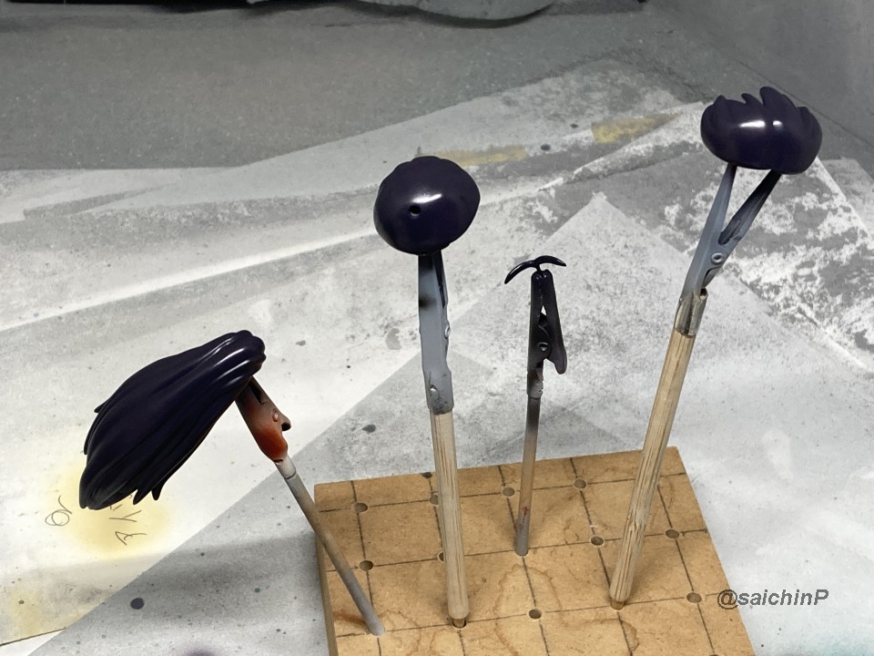 完成したフィギュアの記事はこちら 我那覇響ちゃんの誕生日なのでダイバーヒビキを作りました 髪の毛パーツを自作します。 前髪と後髪はキットのパーツを芯にしてエポパテ盛り削り。 ポニテはエポパテでフルスクラッチです。 リボンや触覚もエポパテで自作。 元のアヤメがつり目がちのキャラなので顔パーツは形状変更などは特にしていません。 『胸元網目』にする為に襟のラインを生かしてV字状にカットして、首パーツの下側部分に谷間を追加しました。 網はチュールをカットしたものにプラペーパーの帯を貼り付けて再現しています。 塗装するとこんな感じに。 使ったチュールは百均(セリア)で購入したヘアアクセサリーでマス目が六角形の物。 腰とヒップの接続は後ハメ加工しました。 足パーツはニーソックスの食い込みをちょこっと削り込んでいます。 キットではニーソックスだった部分を網タイツにするので肌色で塗装してからチュールを薄めた木工用ボンドで貼り付けてヒートガンで強制乾燥させています。 チュールのつなぎ目は黒い糸を撚り合わせたものをバックシームとして貼り付けて隠しています。 完成するとこんな感じでセクシー度アップ。 瞳はアヤメと響ちゃんでは色が違うので自作デカールを使用。 というか、以前やよいを作った時の試作デカールの瞳部分が流用できました。 その他の改造点は腰のポーチの接続をスプリングに変更。 スカートの襟部分のスジ彫り位置を変更(幅を狭く)しました。 あとは普通に塗装です。 髪の毛は影色に黒を吹いてから調色した髪色を吹きました。 この髪色はポイフル響を作った時に調色したものです。 服の塗装は配色は元キットのアヤメの色から大きく外れないようにしています。 要するに関節パーツの塗装が剥げても違和感のないような色で塗っています。 ポイント的に響のイメージカラーの浅葱色を配しました。 肌色はいつものラスキウスの吹き重ねです、ポイフル響を作った時に調色したものでちょっと褐色。 上半身だけは、首パーツの肌色を塗ってから網目パーツを重ねて、更に上着パーツを被せなくてはいけないので、塗装後に上着部分の合わせ目消しをして再塗装しています。 面相はエナメル系で描き込みました。 眉や睫毛のモールドがしっかりしているので比較的描きやすいのですが、表情差分が4個もあるので大変です。 そんな感じで完成です。 作業期間は途中で長期中断があったのですが正味だと2ヶ月くらいでしょうか。 関連 我那覇響ちゃんの誕生日なのでダイバーヒビキを作りました 『ポイフル』我那覇響 制作編 『うさPハウス』水瀬伊織 制作編
