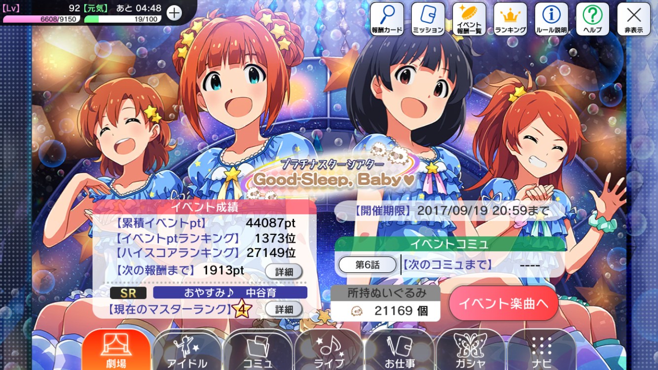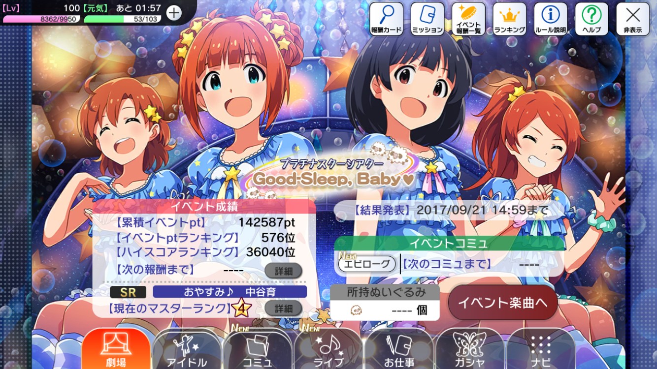 先日、ミリシタのイベントで「プラチナスターシアター~Good-Sleep, Baby♡~」というのが行われて上位報酬がやよいだったので走ってきました。 今後の為にその時の状況を残しておきます。 とりあえずイベント前の私ですが プレイヤーLVが80前後(うろ覚えですが元気は90以上ありました) リズムゲームのスキルは正直苦手でMMは回復持ちをユニットに入れまくってかろうじて全曲クリアで、フルコンボは楽曲Lv15以下ならなんとかといったレベルです。 基本無課金でゲームスタート時に10連1回分課金した程度です。 所持ジェムは24000、ドリンクは10,20,30が各20本くらい、SSRは翼1枚のみという感じです。 これで2000位以内入賞を目指します。 前回のShooting Starsイベントの2000位ボーダーが約15万ptなのでそれを当面の目標とします。 イベント期間は9/8の15時~9/19の21時まで。 9/8~9/10は手持ちのドリンクのみ消費でジュエルは温存、得たぬいぐるみもそのまま消費でハイスコア狙いをしつつ様子見で、9/10で23000ptくらいでした。 ハイスコアはフルコンボができないので67万ptくらいでしたがこれでは入賞は無理なのでさっさと諦めます。 ここで残り日数とポイントから1日に稼ぐべきポイントを計算してみました。 MM1回の消費元気30が68ptと68ぬいぐるみになって、180ぬいぐるみが429ptになるので元気30が約230ptに変換される計算です。 1日にMMを70回クリアすれば16000pt稼げるので9/11~18の8日で128000ptと現在の23000ptでちょうど15万ptを超えます。 1曲3分として70回で210分、途中で休憩も取るとして1日で4時間以上をスマホに向かいひたすら叩き続けるのはかなりきつかったです。 少しでも時間短縮するため、曲は一番演奏時間が短いセンチメンタルヴィーナスにほぼ固定、フルコンボを取る必要が無いのでセンターSR伊織+SR回復3人+SRダメージガード1人の編成で睡魔に襲われてミスしても曲の終わりまで残れる編成にしました。 9/11~9/14は上記のようにMM70回を目安にptを稼ぎ、ぬいぐるみは温存し9/14で約44000ptでぬいぐるみ約21000個、順位は1300位前後でした。 9/13の15時からぬいぐるみ4倍消費が始まってボーダーの上昇ペースが上がってきましたが全体的には前回のSSsイベントよりボーダーが低めなので2000位ボーダー予想を12万ptに見直し、余裕を持ってプラス2万ptの14万ptを最終目標としました。 9/15~16は通常ノルマのMM70回+ぬいぐるみの4倍消費を開始し9/16で約118000ptでぬいぐるみ296個、順位243位。 9/17~18はボーダーの様子を見つつペースを落として9/18で約14万ptでぬいぐるみ93個、順位362位。 最終日9/19は自然回復分のみプレイして最終結果は142587ptで576位入賞となりました。 2000位ボーダーは10万ptだったので少々オーバーラン気味の結果に。 ジュエルはイベント終了時に22000になっていました、ログインボーナス等での増加もありますが意外と少ない消費で走れる印象。ただ1日4時間持っていかれるリアルのプレイ時間はかなりきつかったですね。ゲームプレイそのものよりもリアルのスケジュール管理や体調管理、スマホの冷却や画面の清掃等のほうが重要かなといったところです。 苦労しましたが赤パジャマやよいはとてもかわいくてよいよいでした。 関連 ミリシタやよいイベントを走った記録 Deep, Deep Blue編 ミリシタ3周年イベントをやよい100位で走った記録 ミリシタやよいチャレンジ「全力投球!スポーツパークガシャ」編 ミリシタ用にiPadを導入 ミリシタ、やよいの大根葉ツリーを再現してみる |