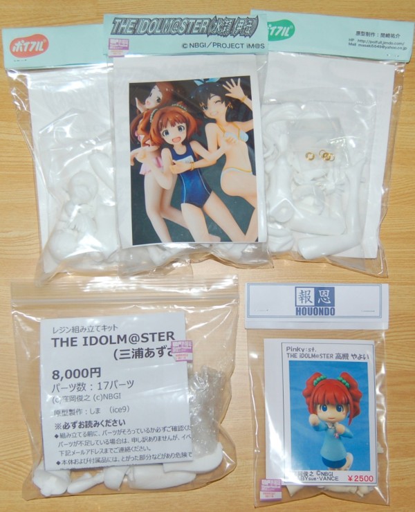 メンバーはだいたいいつもと同じ、ただし今回は申請していた版権物が不許可になってしまったので私個人の出品は無しとなってしまいました。 卓の様子はこんな感じです 細かい出品内容などはディーラー代表のにく日記Pの告知を参照ということで にく日記:【ワンフェス2013夏:告知】 ということで、久しぶりに前日が徹夜じゃないWF参加となりました 購入物はこんな感じで全てアイマス関係です 写真上2点がグッスマのfigma城ヶ崎美嘉、城ヶ崎莉嘉です、これは自分で買いに行ったのではなく、やよさん(仮名)についでに買ってきてもらいました、感謝! 写真下2点が「山猫亭」の新作、美希と貴音です。 貴音は再販なしということでがんばって買いに行きました。 写真左下が「天然パーマネント」の雪歩クリスマスバージョン、とてもかわいらしい造形で、毎回新作買っております。 残り3点が「戦国ふさにゃんぼう」の天海春香スクールガールウェア、やよ、はるかさん。 春香はシャイニーフェスタのPVのいわゆる笛春香さん、机や椅子も付いていて価格も安めですごくお買い得感のあるキットでした。 写真上3点が「8BEAM&PoiFull」のやよい、伊織、響です、ひとりずつバラで買うことも出来たのですが、3人組み合わせての展示を見て最初はやよいだけ買うつもりでしたが3人セットで買ってしまいましたw 左下は「雨の日晴れの日+ice9」のあずささん、TINAMIに写真が上がっていたのを見て狙っていました、とてもかわいくで出来の良いあずささんです。 右下は「吉村報恩堂物販部」のやよいピンキー、園児服ですw 僕ロリコンじゃないけどこれは買うしかww 買い物はこんな感じですね、私はアイマスしか買いませんが、全体的にはガルパンあたりが多かったなという印象です、うちの卓でにく日記Pが出していたガルパンのノンナも早めに完売となっていました。 そして、前回のWFに引き続き今回もデレラジのステージがあったので行って来ました。 参加メンバーはレギュラー3人+きらり役の松嵜麗さん、みりあ役の黒沢ともよさん。 優先席はダイレクトパスで本気出さないと貰えないレベルなので立ち見でしたがトーク30分、ライブ30分といった配分で楽しませてもらいました。 ライブは各個人曲+全員での「お願いシンデレラ」で計6曲でした、アイマス初ステージの黒沢ともよさんかわいかったです^^ その他、企業系でアイマス関連のフィギュアの発表などいろいろありましたが、その辺はまとめブログでも見てください、個人的に気になったのは、765プロのfigmaの第一弾となる千早の発売発表と、PhatのBDジャケットモチーフのフィギュアでやよい発売のアナウンスがあったことでしょうか、このシリーズ伊織の原型も展示してあったし、響の完成品の展示も尻がとても良かったです そんなこんなで、WF終了後は海浜幕張の駅前で打ち上げして楽しい1日でした しかし、先週の8th大阪公演、今週のデレラジステージ、来週は8th横浜公演と3週連続のアイマスライブというのは初めての経験でなかなかハードですw