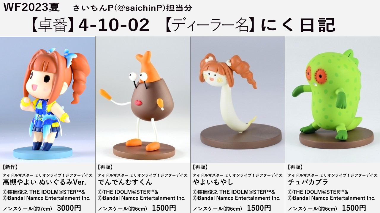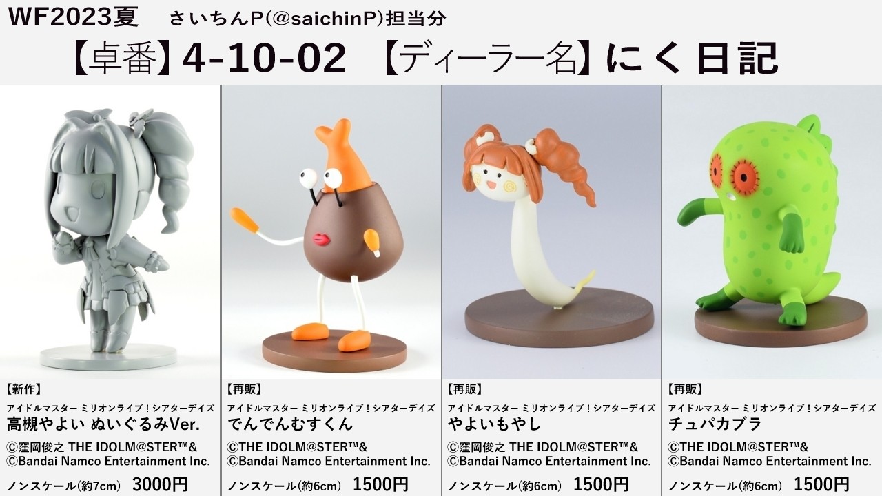今回は2卓で、にく日記P、ねんどPとの合同でいつものディーラー名『にく日記』で申し込んでいます。 直前ですが告知です。 ディーラー名 にく日記 卓番 4-10-02 上の画像をクリックで拡大できます。 画像の左から順に 【新作】 アイドルマスター ミリオンライブ! シアターデイズ 高槻やよい ぬいぐるみVer. ノンスケール(約7cm) 価格3000円 【新作】 アイドルマスター ミリオンライブ! シアターデイズ でんでんむすくん ノンスケール(約6cm) 価格1500円 詳細はこちらを WF2023冬 ミリシタ でんでんむすくん完成 【再販】 アイドルマスター ミリオンライブ! シアターデイズ やよいもやし ノンスケール(約6cm) 価格1500円 詳細はこちらを 8月41日なのでやよいもやしを作った 【再販】 アイドルマスター ミリオンライブ! シアターデイズ チュパカブラ ノンスケール(約6cm) 価格1500円 詳細はこちらを WF2020冬 ミリシタ チュパカブラ完成 すべてレジン製キットです、組み立て塗装が必要です。 今後のスケジュール ディーラー参加申し込み締め切り 3/15 参加当落通知 3/30 参加料入金締め切り 4/25 版権本申請締め切り 4/25~5/9 ディーラーリスト発表 6/14 当日版権結果通知 6/23 最終参加案内 7/7 版権料入金締め切り 7/10 WF前日 ←今ここ WF2023夏 当日 7/30 関連 WF2023夏 卓番発表されました【4-10-02】 WF2023夏 当選しました WF2023夏 参加します WF2023冬 参加しました