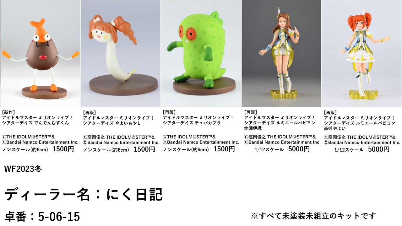 ディーラー名:にく日記 卓番:5-06-15 上の画像をクリックで拡大します。 画像の左から順に 【新作】 アイドルマスター ミリオンライブ! シアターデイズ でんでんむすくん ノンスケール(約6cm) 1500円 詳細はこちらを WF2023冬 ミリシタ でんでんむすくん完成 【再販】 ミリオンライブ! シアターデイズ やよいもやし ノンスケール(約6cm) 1500円 詳細はこちらを 8月41日なのでやよいもやしを作った 【再販】 ミリオンライブ! シアターデイズ チュパカブラ ノンスケール(約6cm) 1500円 詳細はこちらを WF2020冬 ミリシタ チュパカブラ完成 【再販】 ミリオンライブ! シアターデイズ ルミエールパピヨン 水瀬伊織 1/12スケール 5000円 詳細はこちらを WF2022冬 告知【8-10-16】 【再販】 ミリオンライブ! シアターデイズ ルミエールパピヨン 高槻やよい 1/12スケール 5000円 詳細はこちらを WF2020冬 やよい完成&告知 すべてレジン製キットです、組み立て塗装が必要です。 やよいもやしと伊織は再販となっていますが過去に中止になったWFで申請していた関係で実質初販売となります。 マップをクリックで拡大します。 今後のスケジュール ディーラー参加申し込み締め切り 8/26 参加当落通知 9/6 参加料入金締め切り 9/30 版権本申請締め切り 10/14~10/24 当日版権結果通知 12/21 版権料入金締め切り 1/16 最終参加案内 1/18 ←今ここ WF2023冬 当日 2/12 関連 WF2023冬 ミリシタ でんでんむすくん完成 WF2023冬 卓番発表されました【5-06-15】 |