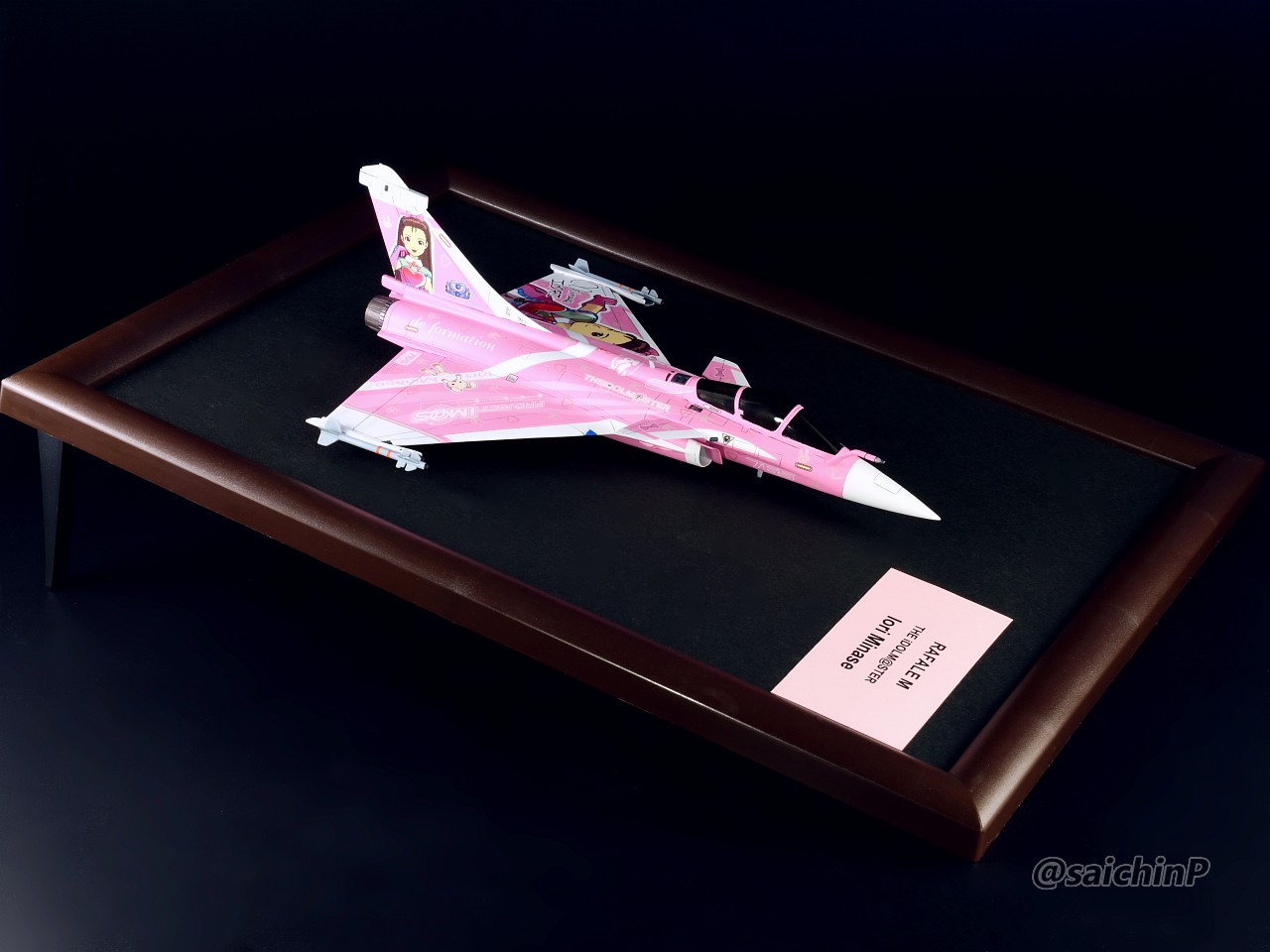 おめでたいのでハセガワの1/72 ラファール M “アイドルマスター 水瀬伊織”を作りました。 1/72アイマス機の8機目になります。 作業の様子はこちらの記事で。 ラファール M 水瀬伊織 制作編 ここからは各アングルでのギャラリーです。 いつものように飛行状態での額縁固定仕様で作っています。 今となっては懐かしさもあるオールバックでこ出しいおりん。 右主翼の白ラインにぶら下がるうさちゃんが可愛い。 作業期間は約1ヶ月。 凸モールドを凹スジ彫りにしたり、ゲーム内CGとの仕様違いを修正したりと今まで作ってきたアイマス機の中で一番手間がかかっています。 模型SNSにも投稿しているのでいいね支援よろしくお願いします。