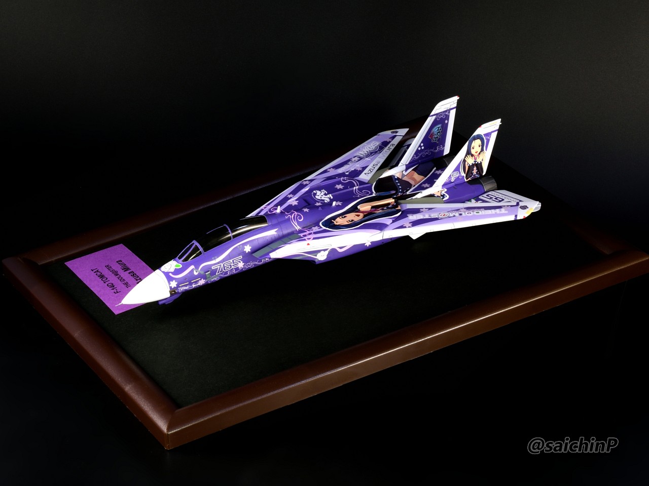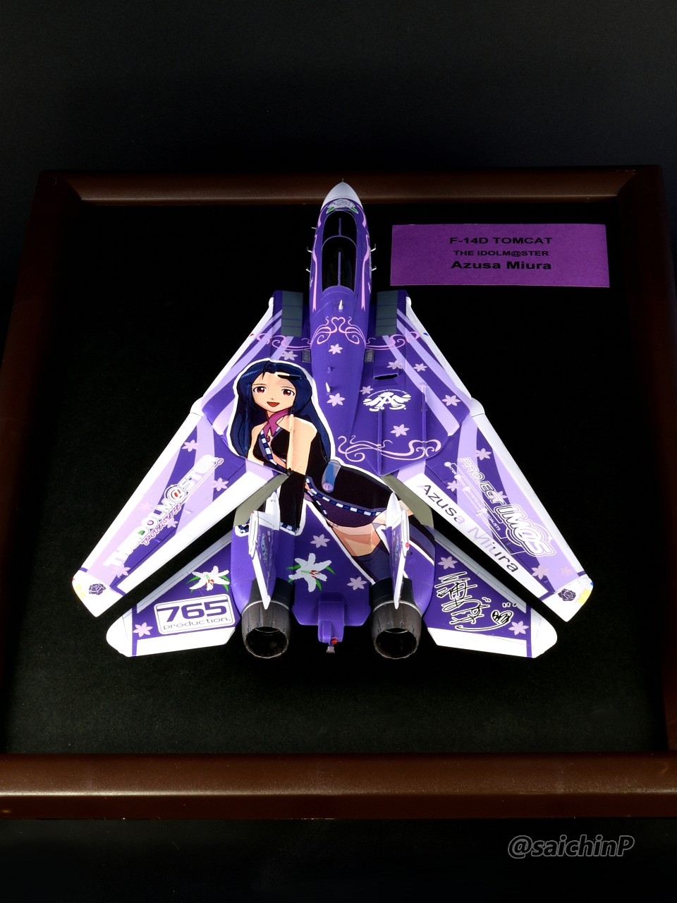 ハセガワの1/72スケール、F-14D トムキャット "アイドルマスター 三浦あずさ"を作りました。 1/72スケールのアイマス機を全部作ろうシリーズの今年3機目、通算だと9機目です。 作業の様子についてはこちらの別記事でどうぞ。 F-14D 三浦あずさ 制作編 F-14は可変翼なので広げた状態も。 主翼のラインの繋がりからは広げた状態でのデザインとなるようですが、展示スペースの都合もあるのでこの写真を撮ったあとに閉じた状態で固定しています。 いつものように飛行状態の額縁固定で作っています。 デカールはキット付属のものではなく、過去に出ていたアイマス機のムック本の付録デカールがパール仕様なのでそれを使用しています。 懐かしのロングヘアあずささん、デカールを貼る難易度は高めでした。 作業期間は2ヶ月くらい、WFの準備期間と重なっていたので苦労しました。 作った9機は2部屋に分けて展示しています。 SNSにも投稿しているのでいいね支援等よろしくお願いします。