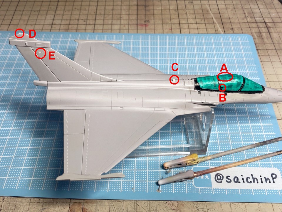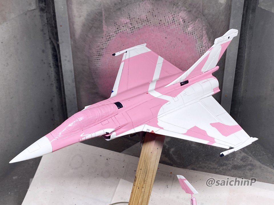 完成編の記事はこちら 伊織誕生日なのでラファール Mを作りました 元キットはイタレリ製でレジン製の空中給油プローブが追加されています。 そもそも、このキットは試作機らしくてゲーム内CGと違うところが何箇所かあります。 あと、スジ彫りが凸モールドです。 額縁固定で作るので飛行状態で脚カバーを閉じて、固定用のナットを埋め込んでいます。 コックピットはざっくり組んでタミヤアクリルのNATOブラックを吹き付けてはみ出た部分をマジックリンで拭き取っています。 キャノピーは裏からスモークグレーを吹いています。 額縁で飾ったときに目立つ部分をいくつかゲームCGに近づくように改修しました。 画像を拡大してみてください。 A キャノピー天井部に2本あったフレームを削除 B キャノピー左右側面に突起状のフレームを追加 C 背中部分にブレードアンテナを追加 D 垂直尾翼の上部にライトを追加。 E 垂直尾翼の左右にあるフィンを切り取って塗装とデカールを貼り付けてから後ハメ加工できるように改造 パネルラインはキットの凸モールドをそのままなぞって凹スジ彫りに彫り直しました。 表面処理で磨いたりしてから下地の白を吹き付け。 白ラインは塗装にするのでキャラクターのデカール透け防止まとめてマスキング。 機体色がピンクなのでキャラクターデカールの透け防止は無理にやらなくてもよかったかも。 最近は吹き込み防止でテープの境界にクリアーを吹き付けています。 機体色のいおりんピンクを吹き付け。 説明書のレシピよりやや白多めの調色。 細部の塗り分けはマスキング以外に筆塗りも多用。 背中の赤いライトはデカールを貼るようになっていましたが、ライトのモールドを自作して追加しています。 そして、ウェザリングカラーのマルチグレーでスミ入れ兼ウォッシング。 デカールは全体に貼るハートやウサギのマークがまとまっていないバラバラ状態なので、位置決めの基準となる目立つロゴなどを先に貼ってからその隙間をハートやウサギで埋めていく感じで進めました。 最後に主翼の伊織を貼ってデカールは終わり。 コーションデカールはくどくならないようにある程度間引いています。 このあと最終組み立てと水性の半光沢クリアーを吹いたら完成です。 作業期間は約1ヶ月でした。 スジ彫りと改修があった分、これまでで一番大変でした。 関連 伊織誕生日なのでラファール Mを作りました ミラージュ 2000 高槻やよい 制作編 F-117A 萩原雪歩 制作編 |