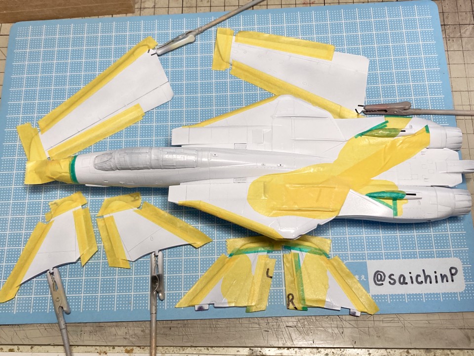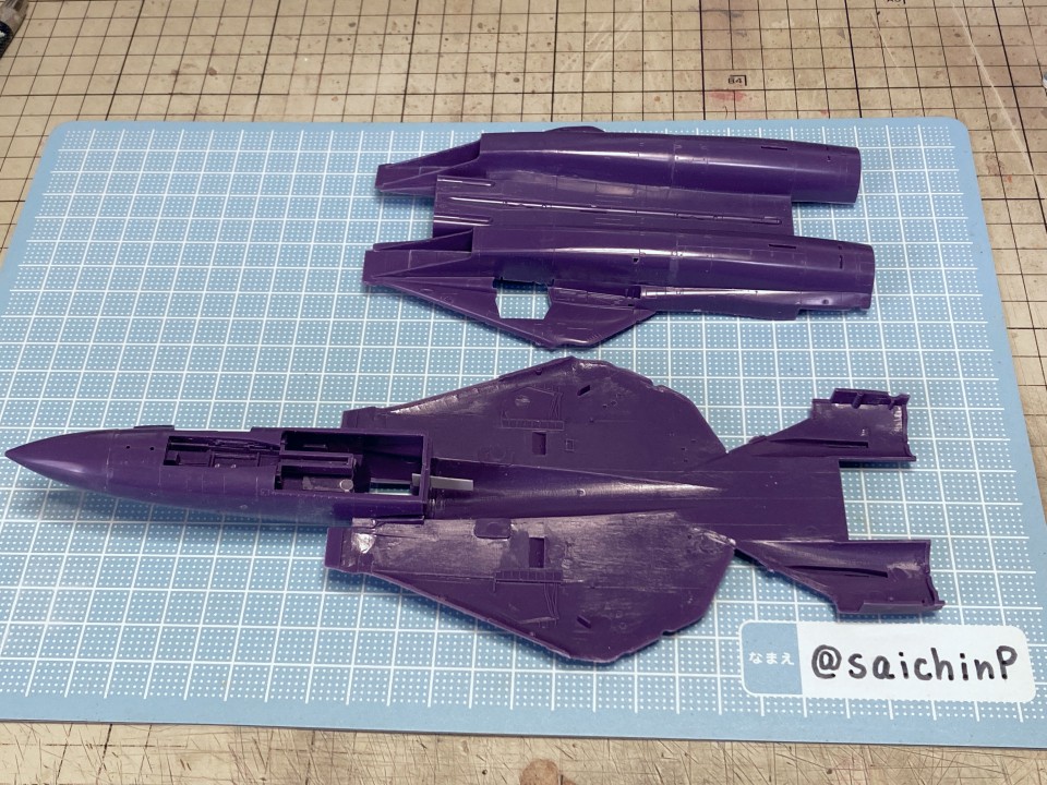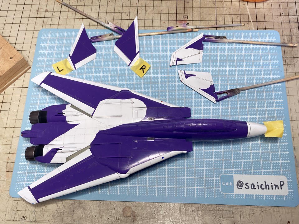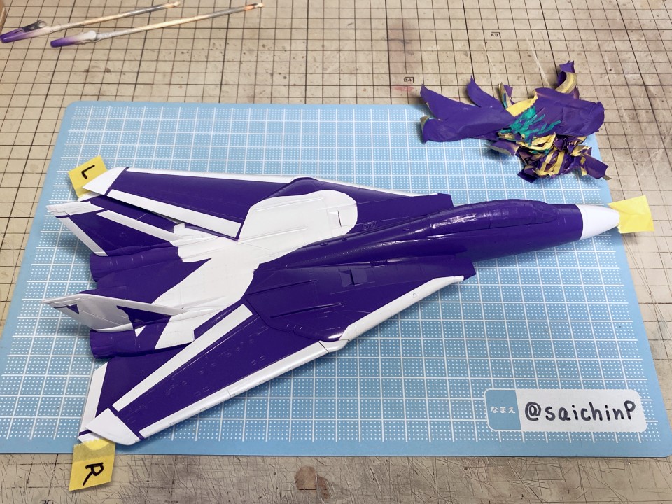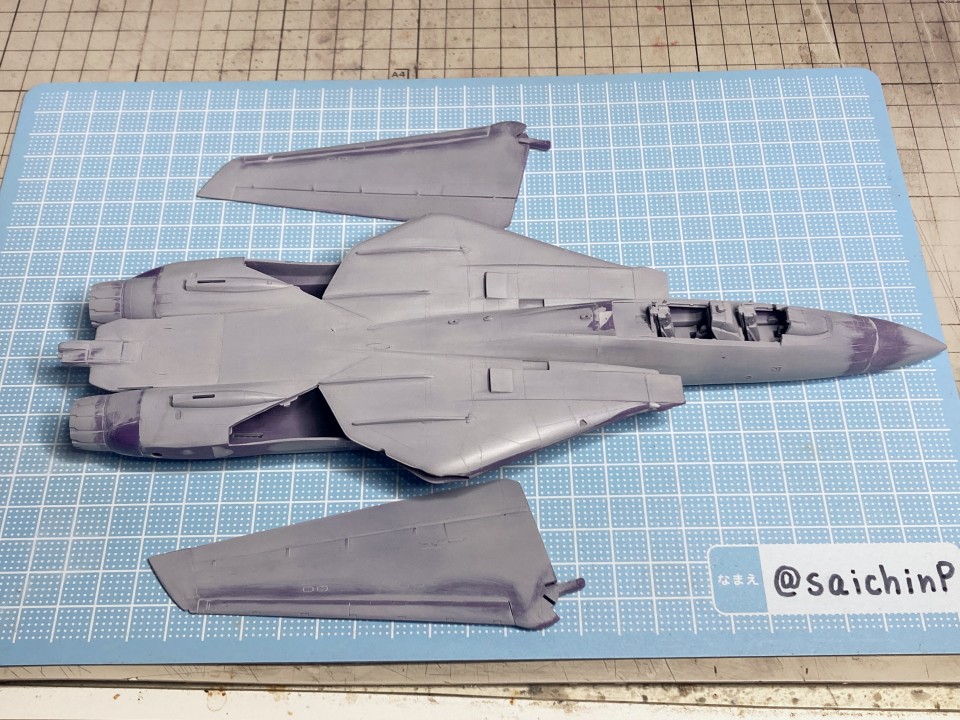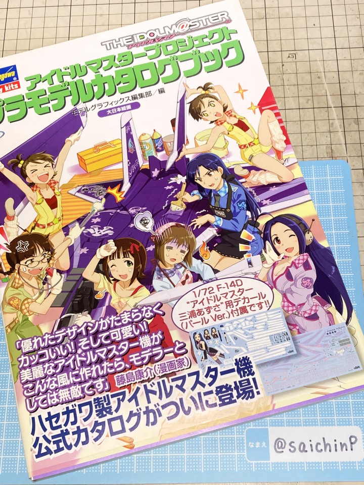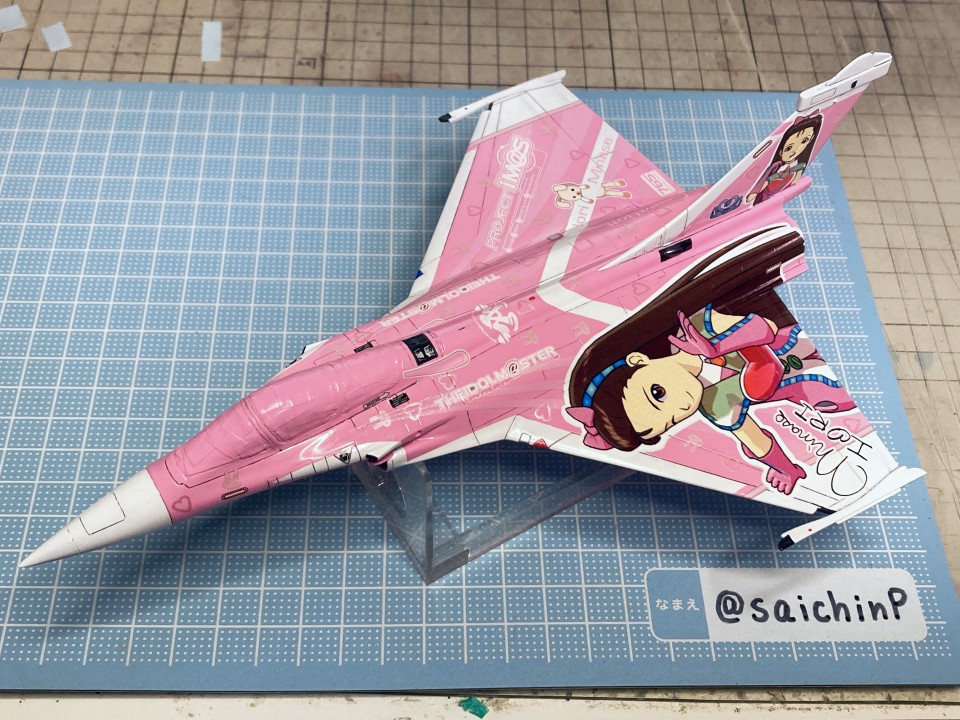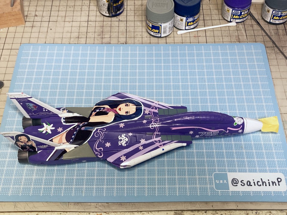 完成編の記事はこちら あずさ誕生日なのでF-14Dを作りました ハセガワのF-14はパーツ分けが細かくて大変と噂には聞いていたキットですがどうなるか。 しかもエッチングパーツ入りの豪華仕様。 機首と胴体の嵌合がパーツ割が複雑でエアインテイクとの兼ね合いもあって大変でした。 擦り合わせたり、プラ板を噛ませたりしてなんとか調整。 額縁固定用にナットを仕込んで、スペーサーをプラ板の箱組みで作りました。 各種メンテナンスハッチ、フラップやスラットなどの動翼、エアブレーキなどが開閉選択式の別パーツ化されているので全部閉じたフラットな状態で作ろうとするとチリ合わせにかなり調整が必要になる感じでした。 1/72スケールとしては過剰かなという印象。 コックピットとキャノピーはいつもな感じの仕上げ。 内部をNATOブラックベタ塗り、キャノピーはスモークグレー塗装。 エッチングパーツはほとんどがコックピット用でしたが未使用です。 塗装は白を吹いてライン類をマスキングして紫を塗装。 細部の塗り分けとウェザリングカラーのマルチグレーでのスミ入れ。 その後にクリアコートで一旦保護。 デカールはキット付属の物は使わずに『アイドルマスタープロジェクト プラモデルカタログブック』というムック本の付録のパール仕様デカールを使いました。 これで全機作ったときに1機だけパールじゃなくて周りから浮くことを避けられるはずです。 あずささん以外の各種ラインやロゴデカールを貼った状態。 さすがに慣れましたね。 メインのあずささんデカールは機体背面のフィンや可変翼や垂直尾翼の切り欠きなどでかなりの難易度です。 失敗して破く未来しか見えなかったのでいくつかに分割して貼りました。 貼り終わったところです。 このあとは細部パーツの取付とクリアコートを施して完成です。 作業期間はWFの原型と並行しつつで約2ヶ月くらいでした。 アイドルデカール貼りの難易度は今までで一番高かったかも。 関連 あずさ誕生日なのでF-14Dを作りました ラファール M 水瀬伊織 制作編 ミラージュ 2000 高槻やよい 制作編