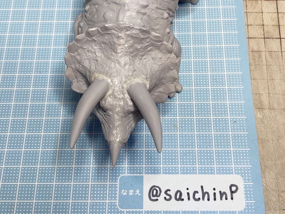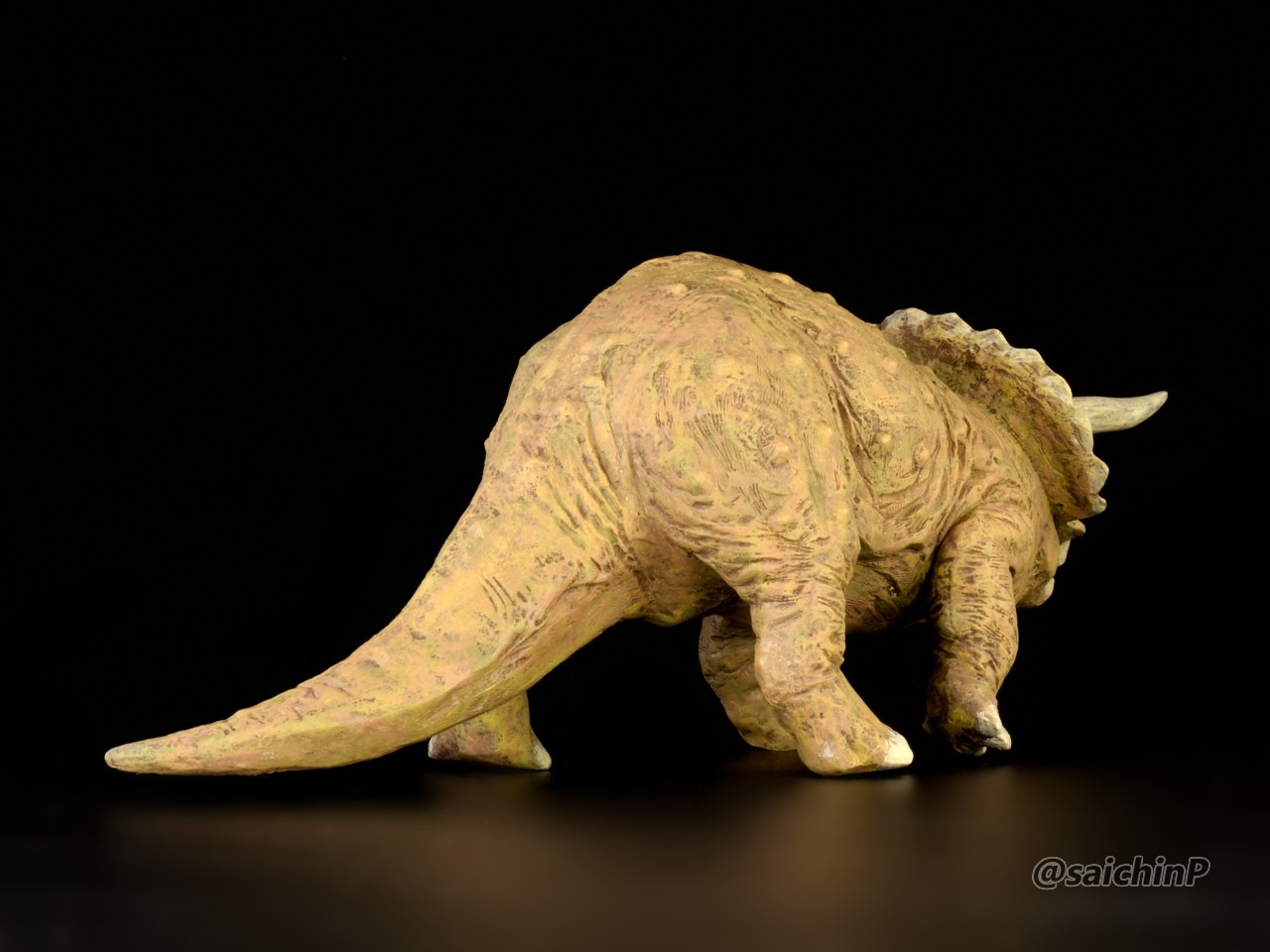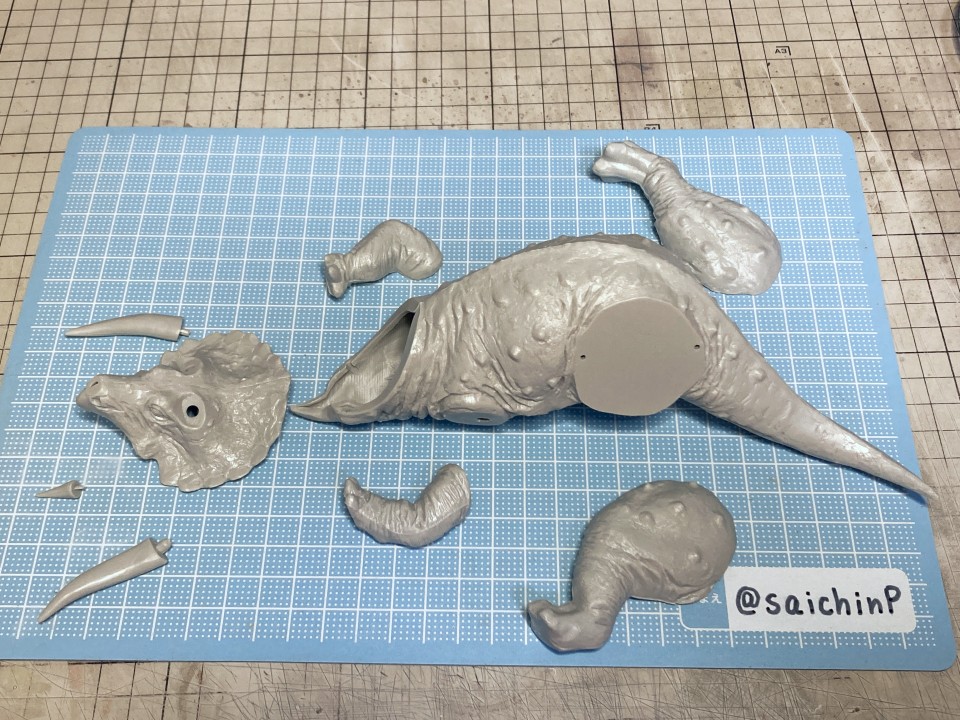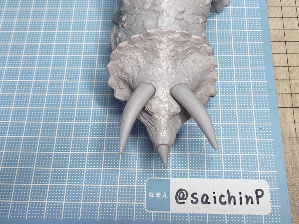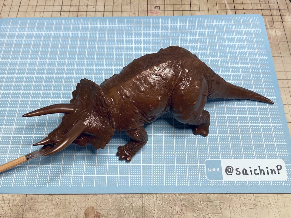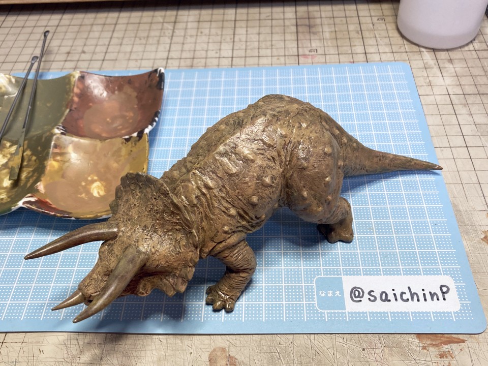 夏休みの間に手軽になにか1個完成させてやり遂げた感を出したいなということでこのキットにしました。 最近はアイマス機でジェット機ばかり作っているのでこういうのが箸休め的にいいんですよね。 あと、夏休みに恐竜博に行ったな~という思い出も少々。 このタミヤのトリケラトプスは1980年代頃に出たかなり古いキットで最近再販されたものを入手しました。 私が子供の頃にあったキットですが当時は同じ金額払うなら恐竜よりも戦車や戦闘機を買って組んでいたので、タミヤの恐竜シリーズは今回が初めての制作でした。 これは、人工芝を利用した簡易セットでの特撮風。 サイズ比較用に同じ1/35スケールの戦車や自動車と並べてみました。 こういうのが模型の楽しさでもあります。 そして、ここから先は作業の様子を簡単に解説。 パーツ数15のシンプルなモナカキットなので速乾セメントで強引に隙間を貼り合わせていきました。 エリマキの裏側のモールドが寂しかったのでリューターで荒らしたり、ナイフで引っ掻いたりしてそれらしく追加しています。 ツノの取り付け部分がサイズが合ってなかったので瞬間接着パテを盛っています。 あと鼻先のツノはセンターが甘い感じがしたので取り付け位置を左に0.5mmずらしてます。 塗装は下地にマホガニーを吹いてからの筆塗りで仕上げました。 ウッドブラウン、ダークグリーン、ダークイエロー、RLM02グレーなどをドライブラシ気味に何度も擦り付けて重ねて仕上げました。 塗装のイメージソースがミリオンライブのこの雪歩のカードなので茶色系の強めにした皮膚の色で仕上げています 作業期間は4日です。 SNSにも投稿しているので、いいね支援等よろしくです。
