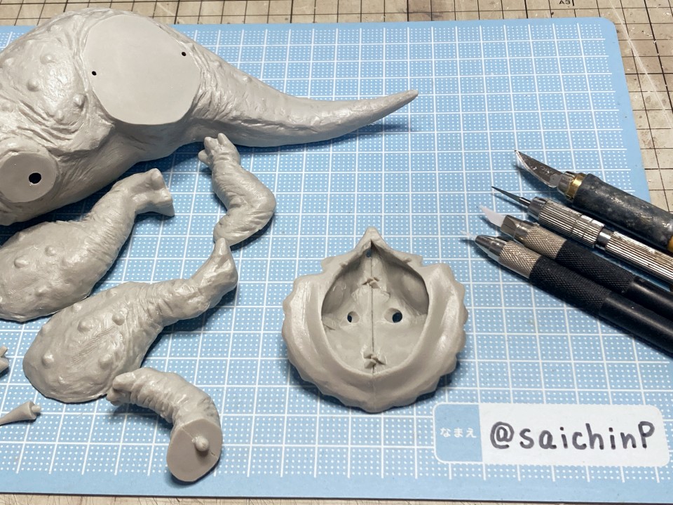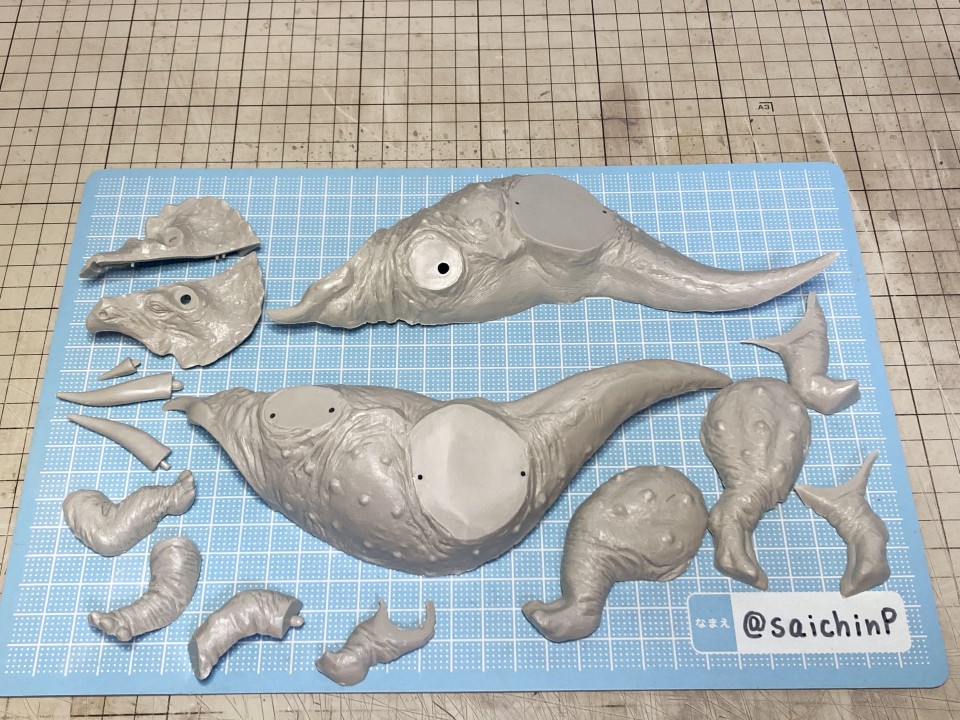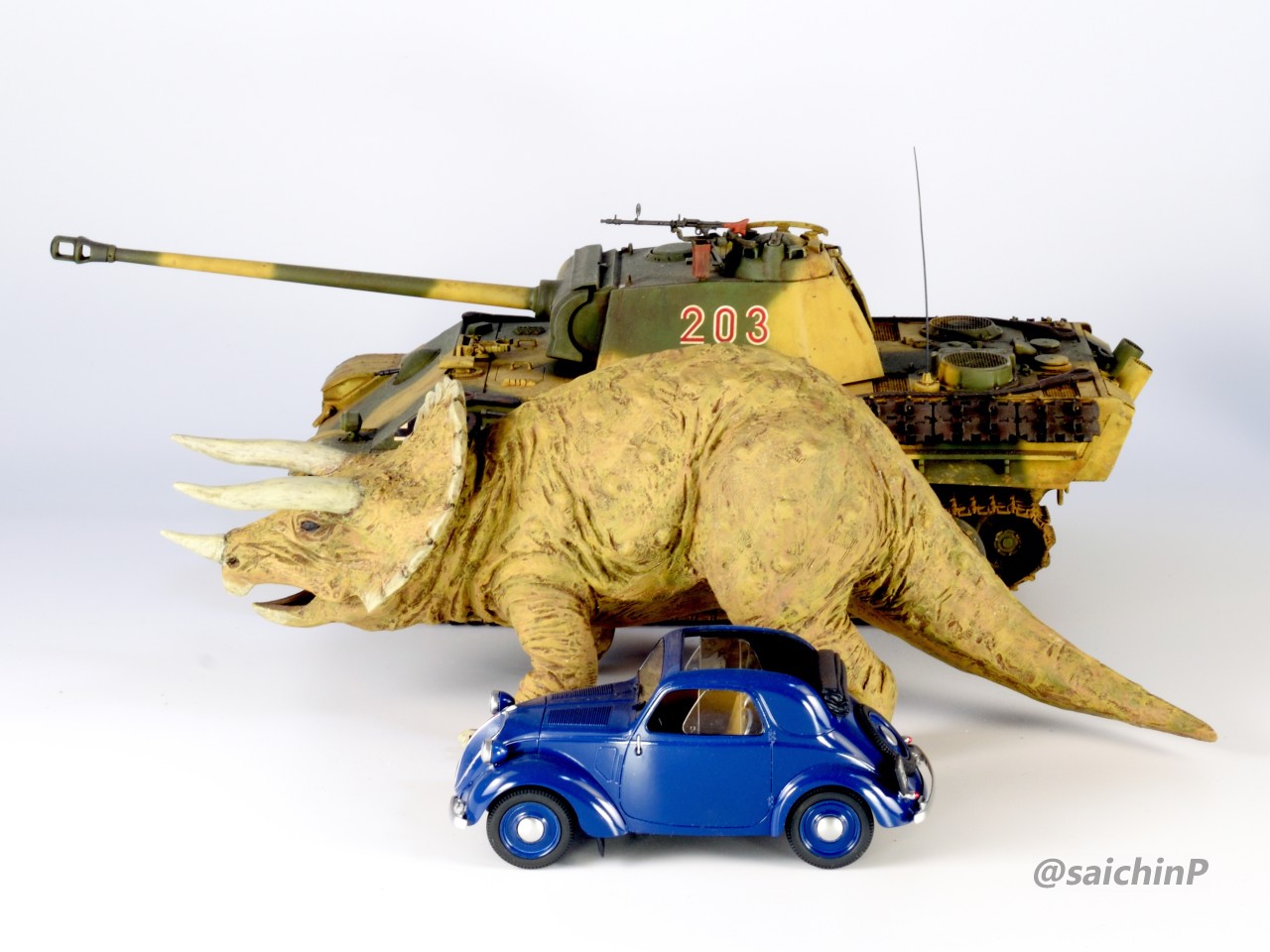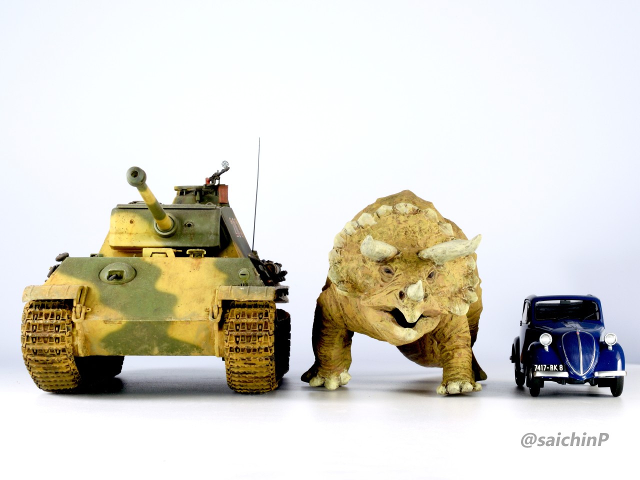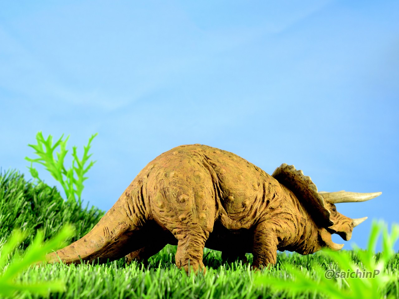 夏休みの間に手軽になにか1個完成させてやり遂げた感を出したいなということでこのキットにしました。 最近はアイマス機でジェット機ばかり作っているのでこういうのが箸休め的にいいんですよね。 あと、夏休みに恐竜博に行ったな~という思い出も少々。 このタミヤのトリケラトプスは1980年代頃に出たかなり古いキットで最近再販されたものを入手しました。 私が子供の頃にあったキットですが当時は同じ金額払うなら恐竜よりも戦車や戦闘機を買って組んでいたので、タミヤの恐竜シリーズは今回が初めての制作でした。 これは、人工芝を利用した簡易セットでの特撮風。 サイズ比較用に同じ1/35スケールの戦車や自動車と並べてみました。 こういうのが模型の楽しさでもあります。 そして、ここから先は作業の様子を簡単に解説。 パーツ数15のシンプルなモナカキットなので速乾セメントで強引に隙間を貼り合わせていきました。 エリマキの裏側のモールドが寂しかったのでリューターで荒らしたり、ナイフで引っ掻いたりしてそれらしく追加しています。 ツノの取り付け部分がサイズが合ってなかったので瞬間接着パテを盛っています。 あと鼻先のツノはセンターが甘い感じがしたので取り付け位置を左に0.5mmずらしてます。 塗装は下地にマホガニーを吹いてからの筆塗りで仕上げました。 ウッドブラウン、ダークグリーン、ダークイエロー、RLM02グレーなどをドライブラシ気味に何度も擦り付けて重ねて仕上げました。 塗装のイメージソースがミリオンライブのこの雪歩のカードなので茶色系の強めにした皮膚の色で仕上げています 作業期間は4日です。 SNSにも投稿しているので、いいね支援等よろしくです。
