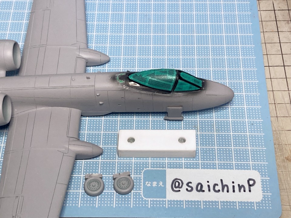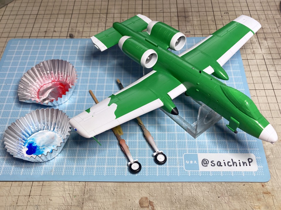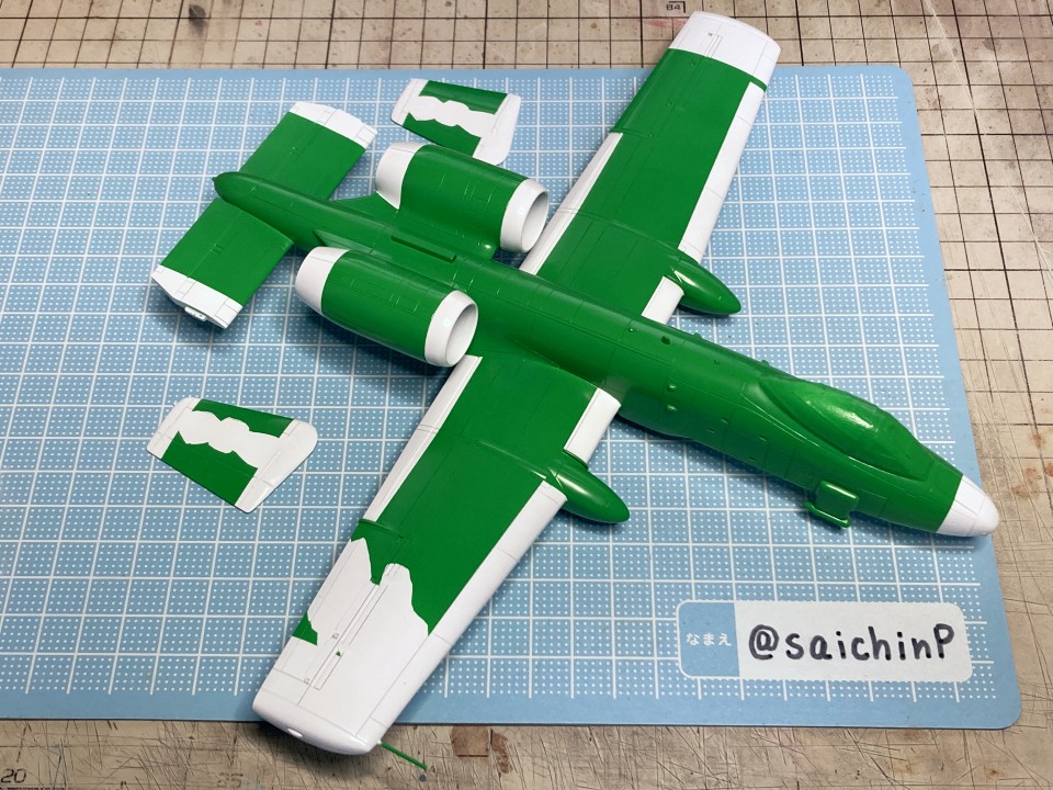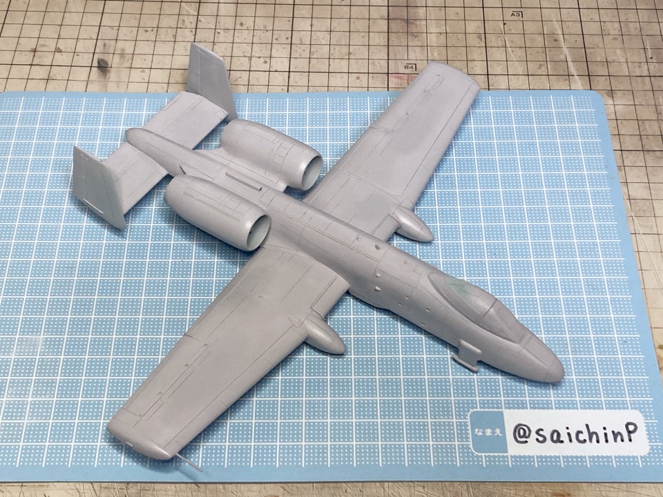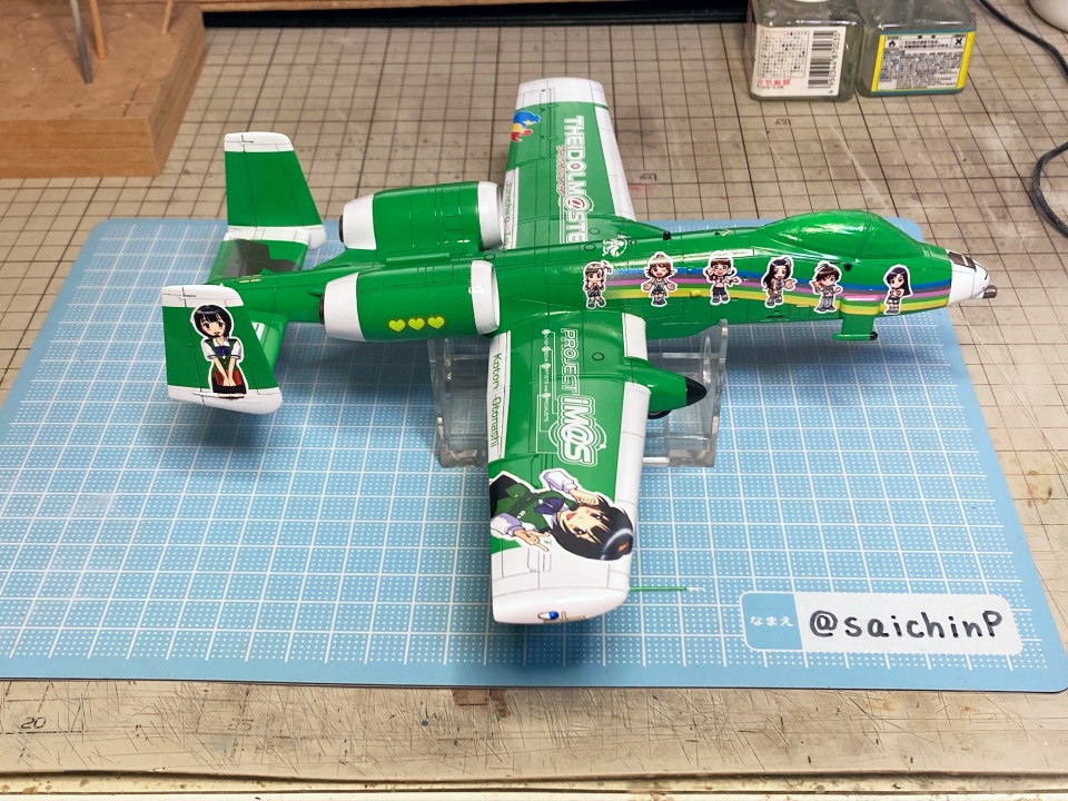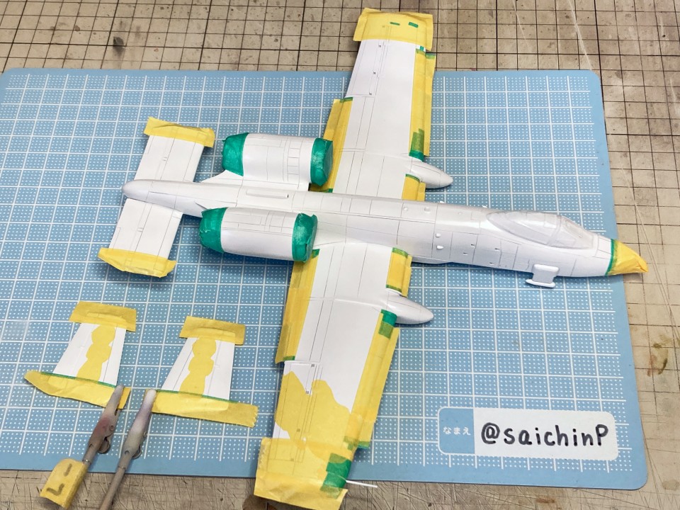 完成編の記事はこちら 小鳥誕生日なのでA-10Aを作りました ハセガワのA-10は1980年代に出た古いキットで凸モールドです。 額縁に取り付けるので飛行状態で組みます。 固定用のナットも仕込みました。 古いですが素直なモナカキットという感じで組みやすいです。 機首下面がコックピットの床と脚カバーを兼ねていたりで要調整。 組み立てと並行しつつ凸モールドのパネルラインを凹スジ彫りにしていきます。 ラインチゼルやPカッター、ニードルに目立てやすりなどを使用。 後から塗りにくそうなエンジンカウリングの内部はここで塗っておきます。 主翼付け根のフィレットの高さ調整で前縁にプラ板を噛ませたり、水平尾翼と胴体に隙間ができるので幅詰めして調整したりしました。 キャノピーはいつもの内側からスモークグレーで塗装。 コックピットはほぼ見えなくなるので素組のベタ塗りで簡素に済ませます。 飛行状態でちょこっとはみ出るタイヤはこんな感じに加工して取り付けます。 白い四角いのはプラ板箱組の額縁取り付け用スペーサー。 スジ彫りと表面処理が終わったのがこの状態。 下地に白を吹いて、ライン部分やキャラデカール部分をマスキング。 直線的なので割と楽でした。 この後、マスキングの境界にクリアーを吹いて吹き込み防止処置をしています。 基本色の事務員グリーンを吹いてマスキングを剥がしたところ。 翼端灯やアンテナ類などの細部を筆塗り。 1滴しか使わないような塗り分けは塗料皿の代わりにお弁当用のアルミカップを使って使い捨てにしています。 ウェザリングカラーのマルチグレーでスミ入れ。 この後、ラッカー系のクリアーで一旦コートします。 デカール貼りは主翼のハの字のラインデカールがないのでかなり楽ですが、機体側面の虹色ラインは凹凸になじませるのが大変です。リタッチ覚悟です。 デカール貼り完了。 手で持つ部分を考えて、主翼の縁にかかるようなデカールは後回しにするのが事故を減らすコツかなと。 この後、水性の半光沢クリアーでコートしたら完成です。 作業期間は約1ヶ月でした。 関連 小鳥誕生日なのでA-10Aを作りました F-14D 三浦あずさ 制作編 ラファール M 水瀬伊織 制作編