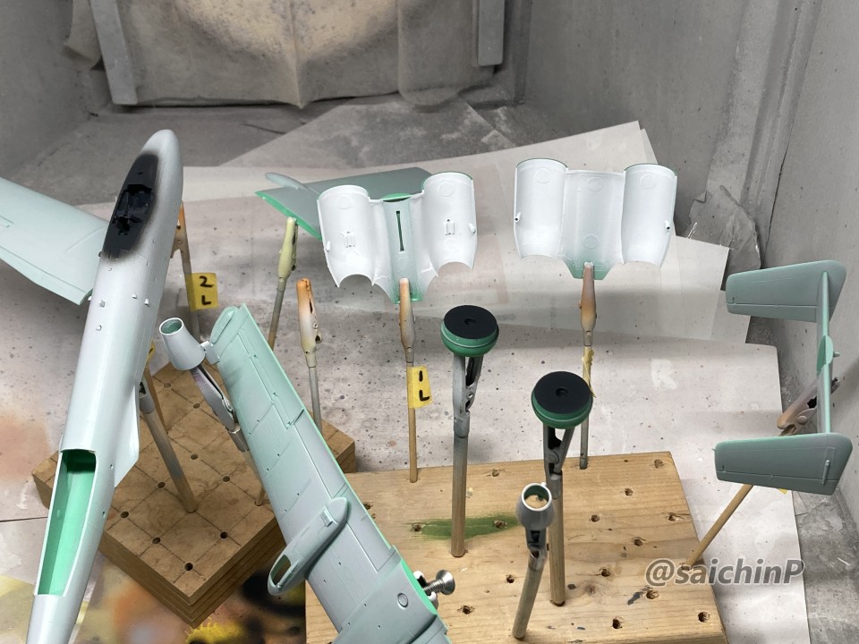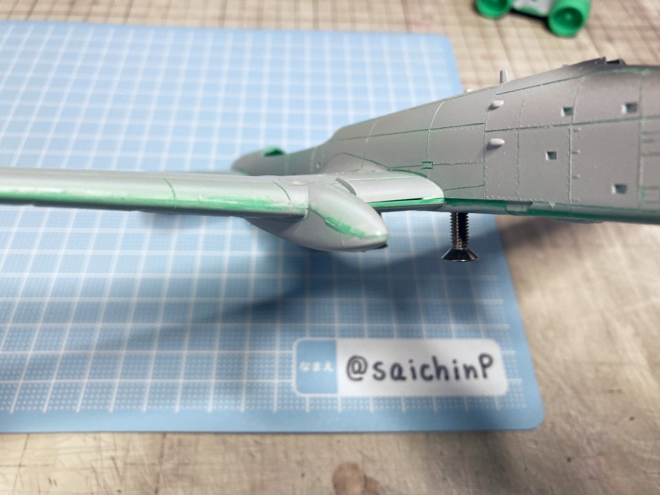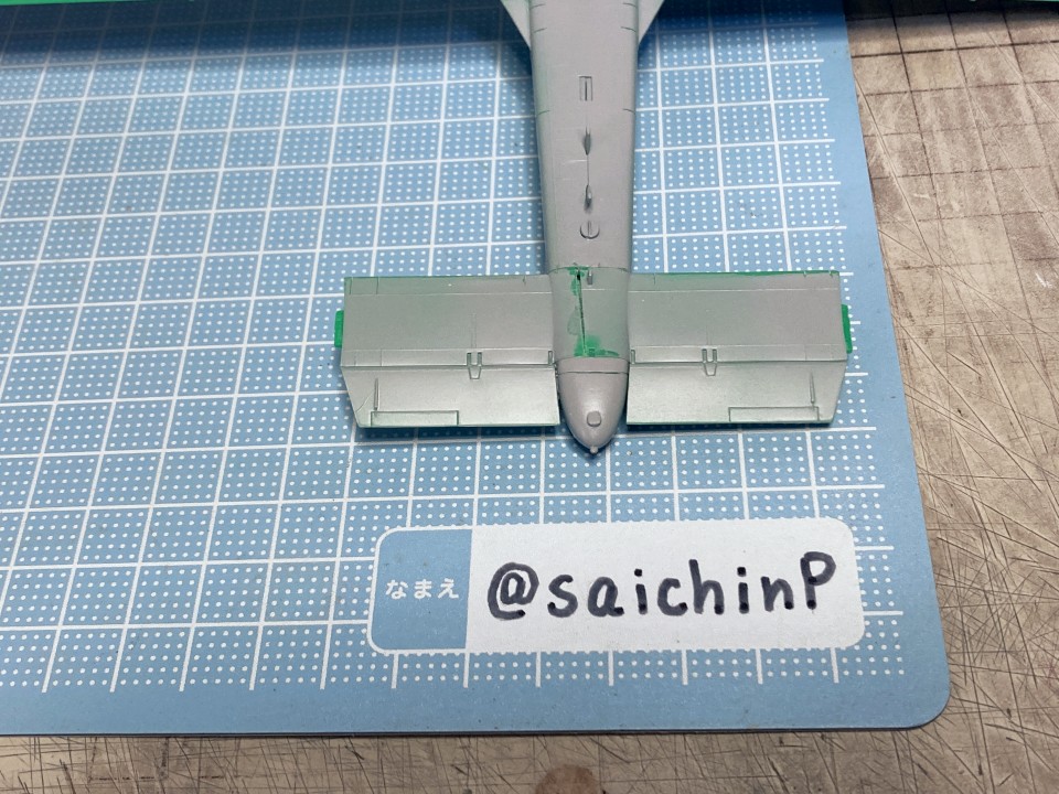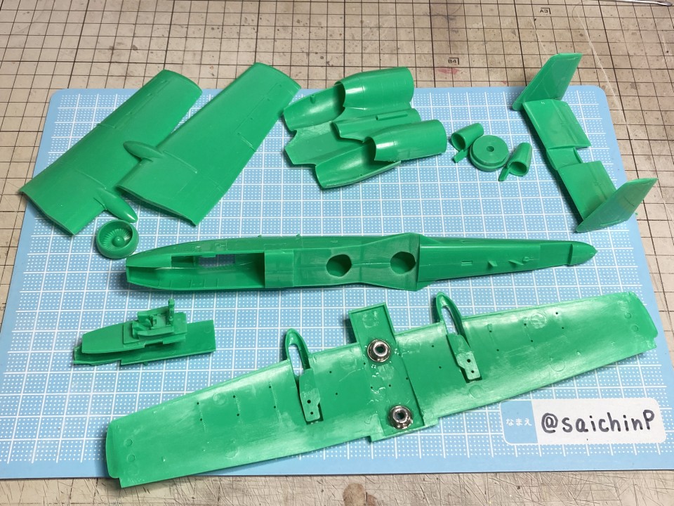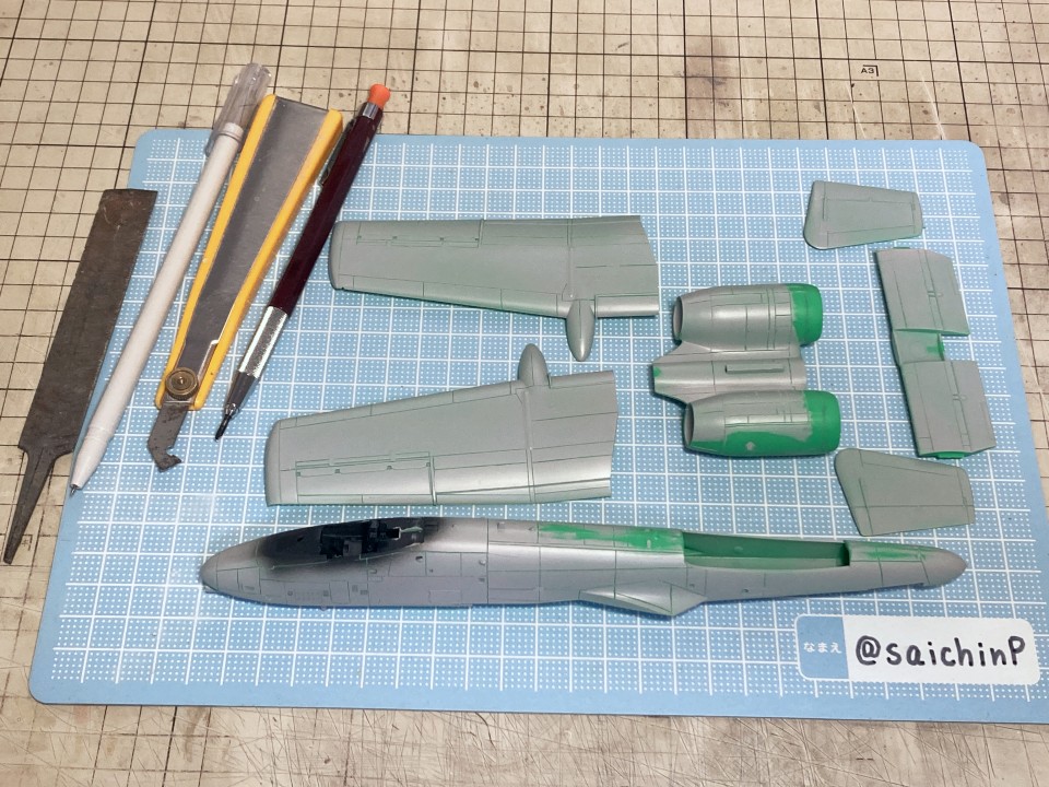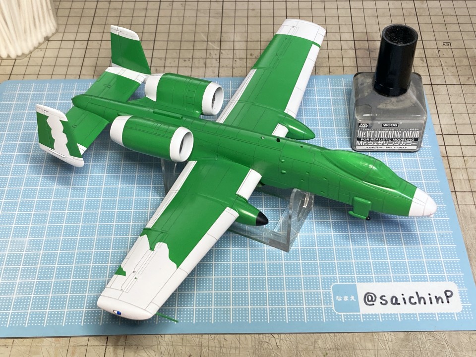 完成編の記事はこちら 小鳥誕生日なのでA-10Aを作りました ハセガワのA-10は1980年代に出た古いキットで凸モールドです。 額縁に取り付けるので飛行状態で組みます。 固定用のナットも仕込みました。 古いですが素直なモナカキットという感じで組みやすいです。 機首下面がコックピットの床と脚カバーを兼ねていたりで要調整。 組み立てと並行しつつ凸モールドのパネルラインを凹スジ彫りにしていきます。 ラインチゼルやPカッター、ニードルに目立てやすりなどを使用。 後から塗りにくそうなエンジンカウリングの内部はここで塗っておきます。 主翼付け根のフィレットの高さ調整で前縁にプラ板を噛ませたり、水平尾翼と胴体に隙間ができるので幅詰めして調整したりしました。 キャノピーはいつもの内側からスモークグレーで塗装。 コックピットはほぼ見えなくなるので素組のベタ塗りで簡素に済ませます。 飛行状態でちょこっとはみ出るタイヤはこんな感じに加工して取り付けます。 白い四角いのはプラ板箱組の額縁取り付け用スペーサー。 スジ彫りと表面処理が終わったのがこの状態。 下地に白を吹いて、ライン部分やキャラデカール部分をマスキング。 直線的なので割と楽でした。 この後、マスキングの境界にクリアーを吹いて吹き込み防止処置をしています。 基本色の事務員グリーンを吹いてマスキングを剥がしたところ。 翼端灯やアンテナ類などの細部を筆塗り。 1滴しか使わないような塗り分けは塗料皿の代わりにお弁当用のアルミカップを使って使い捨てにしています。 ウェザリングカラーのマルチグレーでスミ入れ。 この後、ラッカー系のクリアーで一旦コートします。 デカール貼りは主翼のハの字のラインデカールがないのでかなり楽ですが、機体側面の虹色ラインは凹凸になじませるのが大変です。リタッチ覚悟です。 デカール貼り完了。 手で持つ部分を考えて、主翼の縁にかかるようなデカールは後回しにするのが事故を減らすコツかなと。 この後、水性の半光沢クリアーでコートしたら完成です。 作業期間は約1ヶ月でした。 関連 小鳥誕生日なのでA-10Aを作りました F-14D 三浦あずさ 制作編 ラファール M 水瀬伊織 制作編