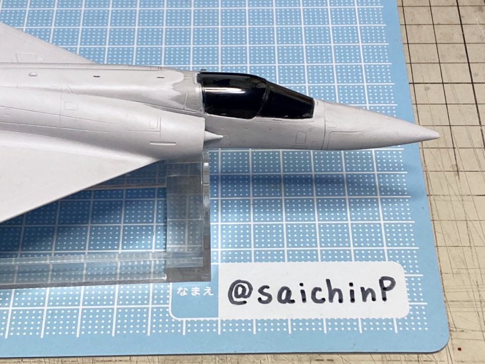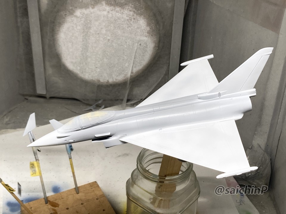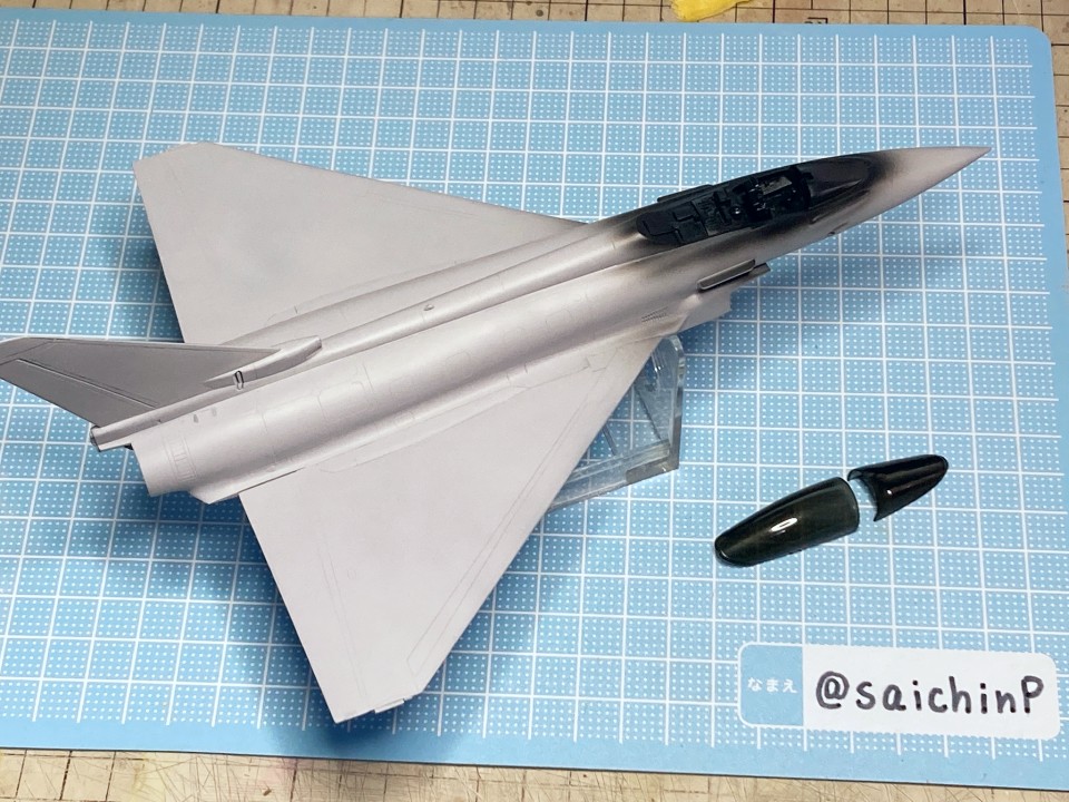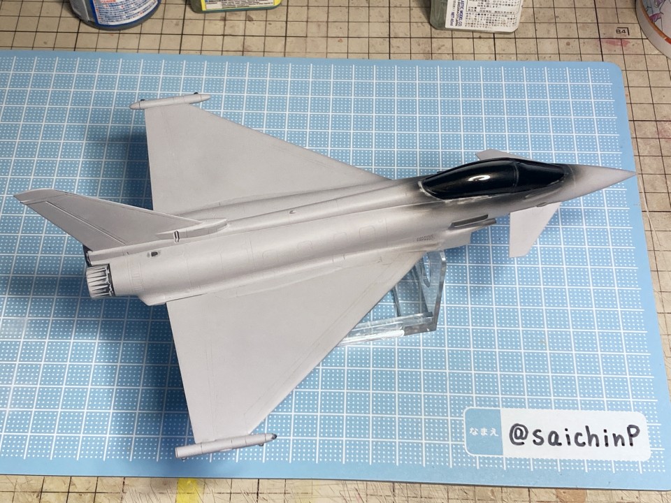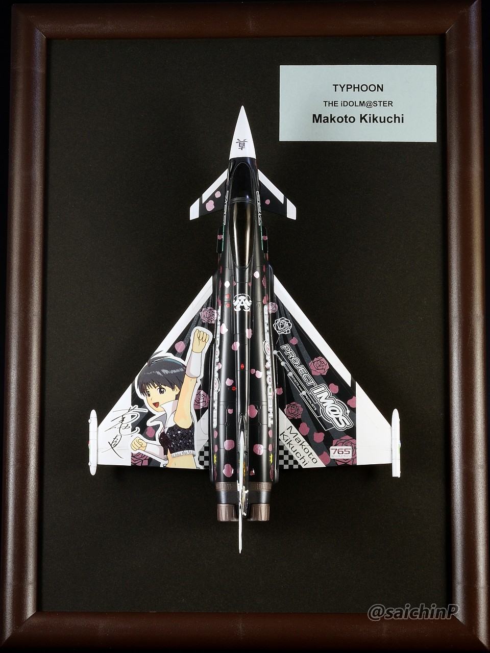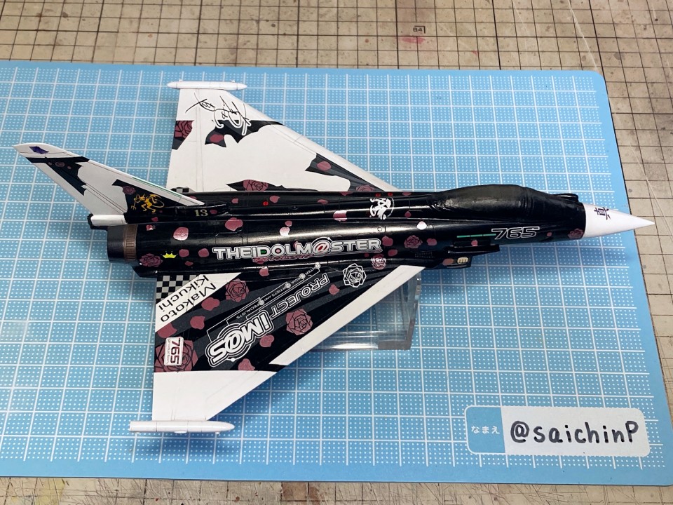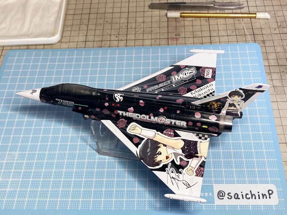 完成編の記事はこちら 真誕生日なのでタイフーンを作りました キットは中身がドイツレベル製の物です。 後年にハセガワから新金型で繊細なモールドの素晴らしいタイフーンのキットが出ているのですが、それと比較するとバリ、ヒケ、歪みなど多く組み立てにはそれ相応の手間がかかります。 デカールだけ流用してハセガワのキットを使ったら楽だろうなと考えてしまいますが、私は当時のキットで作ることをコンセプトにしているのでこのままいきます。 下面に額縁取付用のナットを仕込んで、脚カバーは飛行状態に閉じます。 サフ吹いてチェックすると、ヒケ、歪み、段差などがあちこちにあるので国産キットのパチピタというわけにはいきません。 主翼下面がエアインテークと一体なのでここの合わせが一番手間がかかりました。 後から主翼上面を取り付けて形になったらコックピットをジャーマングレーでベタ塗り。 キャノピーも磨いて整えないと表面がでこぼこしています、取り付けたらマスキングして表面処理と消えたスジ彫りの修復とかをしました、ここが一番時間がかかっています。 納得できる表面になったら下地の白を吹き付け。 機体色が黒なので、白ライン以外の部分の胴体とかはサフ地のままです。 いつもな感じに白ラインとアイドル部分のマスキングをして機体色の黒を吹きます。 説明書のレシピに黒を足してより黒っぽくしたものを吹きました。 マスキングを剥がしたらクリアーを吹いてウェザリングカラーのマルチグレーでスミ入れ。 ここまで、白、黒、クリアーを吹いてますが都度、軽く研ぎ出しをしています。 2000番で数回軽く撫でてからメラミンスポンジで擦る感じです。 ノズル部分の金属色をマスキングして塗り分けました。 ちなみにノズルは開状態、閉状態の選択式でしたが、閉状態は湯が回って無くて欠けていて使えなかったので選択の余地なく開状態を使用しています。 デカール貼りは最初に主翼のハの字のラインデカールを貼ります、白を塗装にしているとデカールをカットする必要があるのでやや難易度高いです。 薔薇の花びらデカールを重ねて貼っていきます。 今回からデカール用のぬるま湯の為にカップウォーマーを導入しました。 朝から晩まで作業しててもぬるま湯状態がキープされて便利でした。 花びらの後にロゴやらコーションデカールを貼って、最後にアイドルを貼ってデカールは終わり。 このあと乾燥させてからぬるま湯で拭いてデカールの糊などを拭き取ってから半光沢クリアを吹いて完成です。 作業期間は約4週間。 関連 真誕生日なのでタイフーンを作りました F-2A 双海亜美&F-16C 双海真美 制作編 Su-33 星井美希 制作編