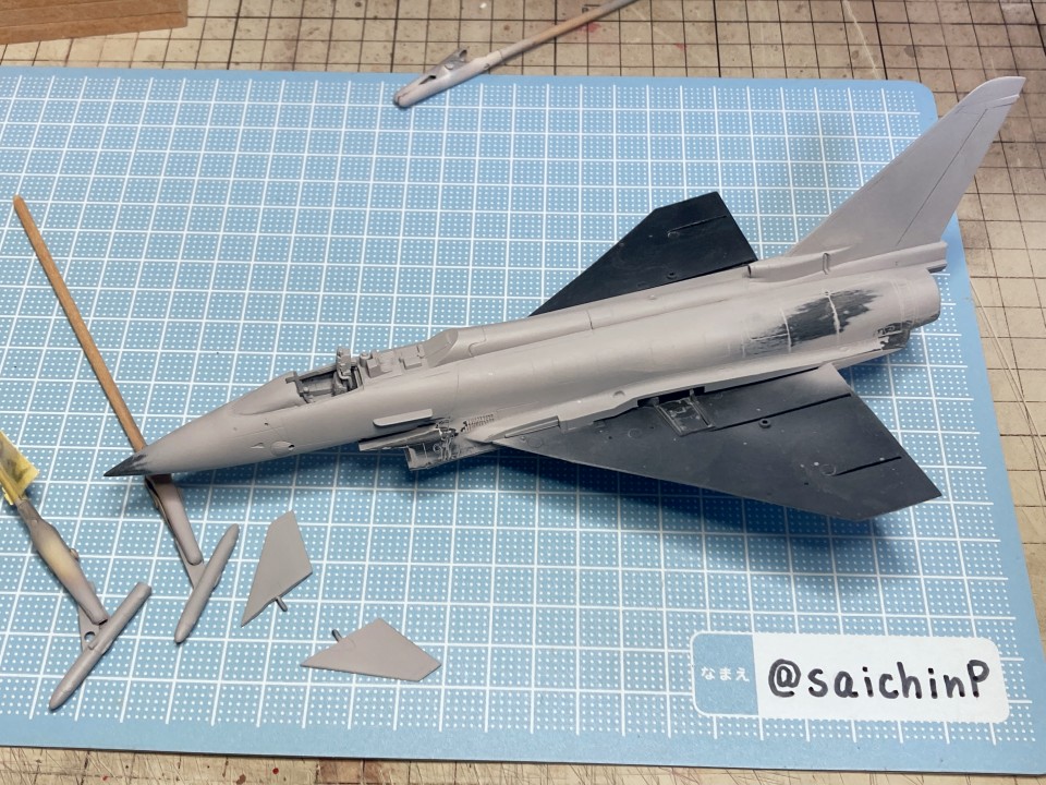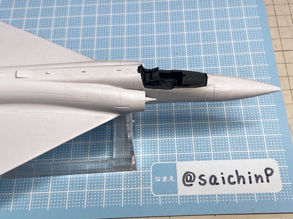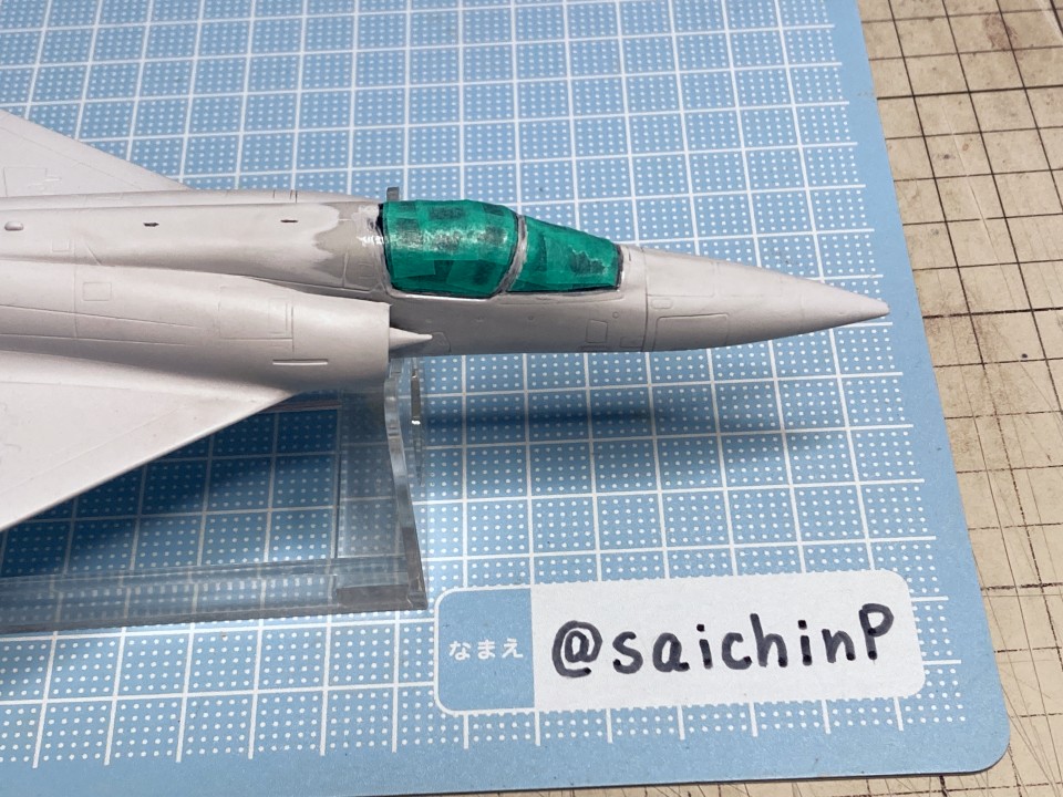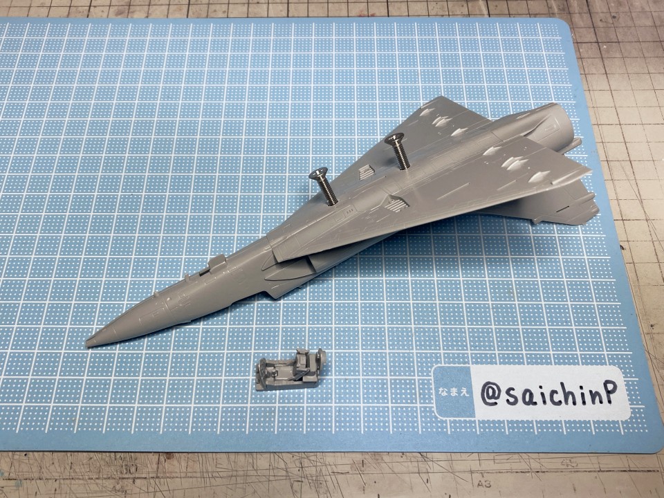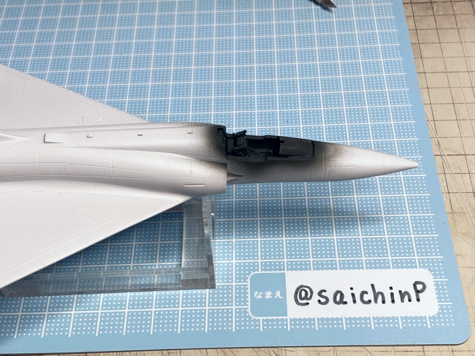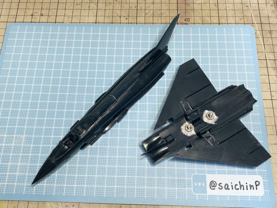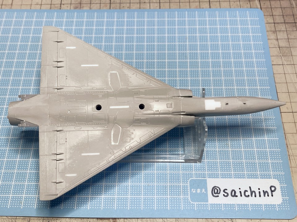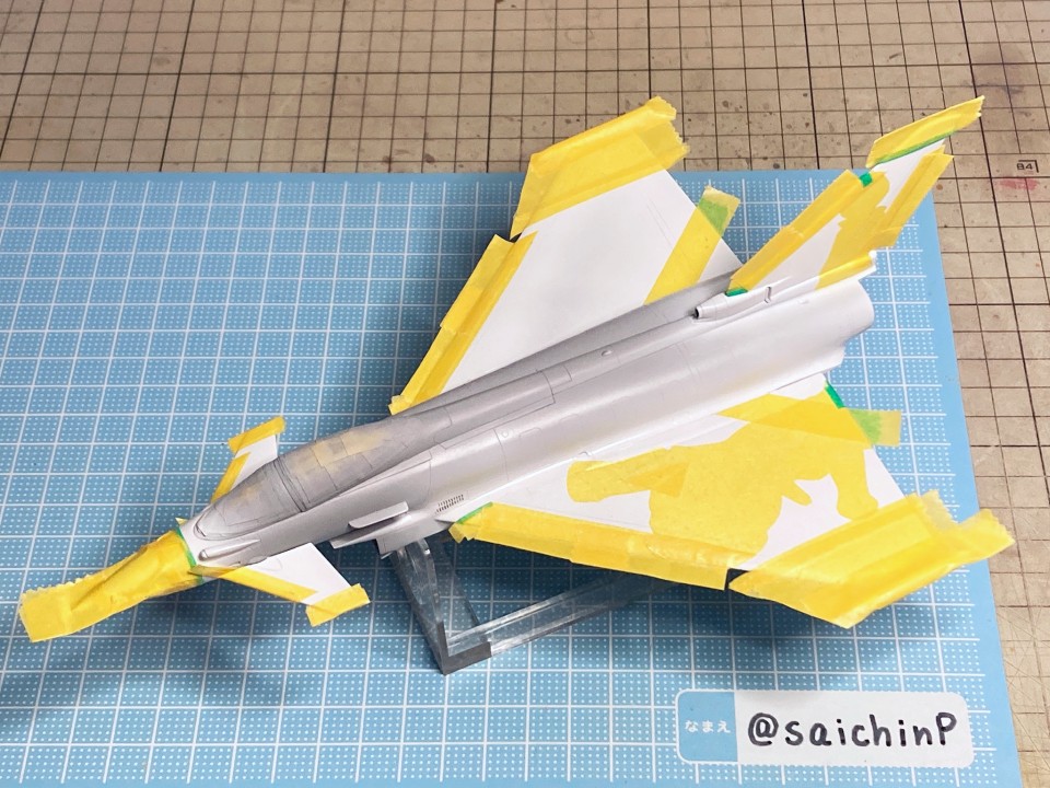 完成編の記事はこちら 真誕生日なのでタイフーンを作りました キットは中身がドイツレベル製の物です。 後年にハセガワから新金型で繊細なモールドの素晴らしいタイフーンのキットが出ているのですが、それと比較するとバリ、ヒケ、歪みなど多く組み立てにはそれ相応の手間がかかります。 デカールだけ流用してハセガワのキットを使ったら楽だろうなと考えてしまいますが、私は当時のキットで作ることをコンセプトにしているのでこのままいきます。 下面に額縁取付用のナットを仕込んで、脚カバーは飛行状態に閉じます。 サフ吹いてチェックすると、ヒケ、歪み、段差などがあちこちにあるので国産キットのパチピタというわけにはいきません。 主翼下面がエアインテークと一体なのでここの合わせが一番手間がかかりました。 後から主翼上面を取り付けて形になったらコックピットをジャーマングレーでベタ塗り。 キャノピーも磨いて整えないと表面がでこぼこしています、取り付けたらマスキングして表面処理と消えたスジ彫りの修復とかをしました、ここが一番時間がかかっています。 納得できる表面になったら下地の白を吹き付け。 機体色が黒なので、白ライン以外の部分の胴体とかはサフ地のままです。 いつもな感じに白ラインとアイドル部分のマスキングをして機体色の黒を吹きます。 説明書のレシピに黒を足してより黒っぽくしたものを吹きました。 マスキングを剥がしたらクリアーを吹いてウェザリングカラーのマルチグレーでスミ入れ。 ここまで、白、黒、クリアーを吹いてますが都度、軽く研ぎ出しをしています。 2000番で数回軽く撫でてからメラミンスポンジで擦る感じです。 ノズル部分の金属色をマスキングして塗り分けました。 ちなみにノズルは開状態、閉状態の選択式でしたが、閉状態は湯が回って無くて欠けていて使えなかったので選択の余地なく開状態を使用しています。 デカール貼りは最初に主翼のハの字のラインデカールを貼ります、白を塗装にしているとデカールをカットする必要があるのでやや難易度高いです。 薔薇の花びらデカールを重ねて貼っていきます。 今回からデカール用のぬるま湯の為にカップウォーマーを導入しました。 朝から晩まで作業しててもぬるま湯状態がキープされて便利でした。 花びらの後にロゴやらコーションデカールを貼って、最後にアイドルを貼ってデカールは終わり。 このあと乾燥させてからぬるま湯で拭いてデカールの糊などを拭き取ってから半光沢クリアを吹いて完成です。 作業期間は約4週間。 関連 真誕生日なのでタイフーンを作りました F-2A 双海亜美&F-16C 双海真美 制作編 Su-33 星井美希 制作編