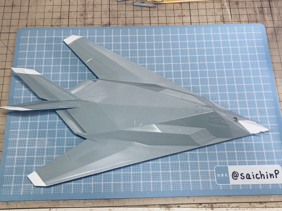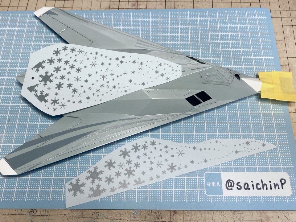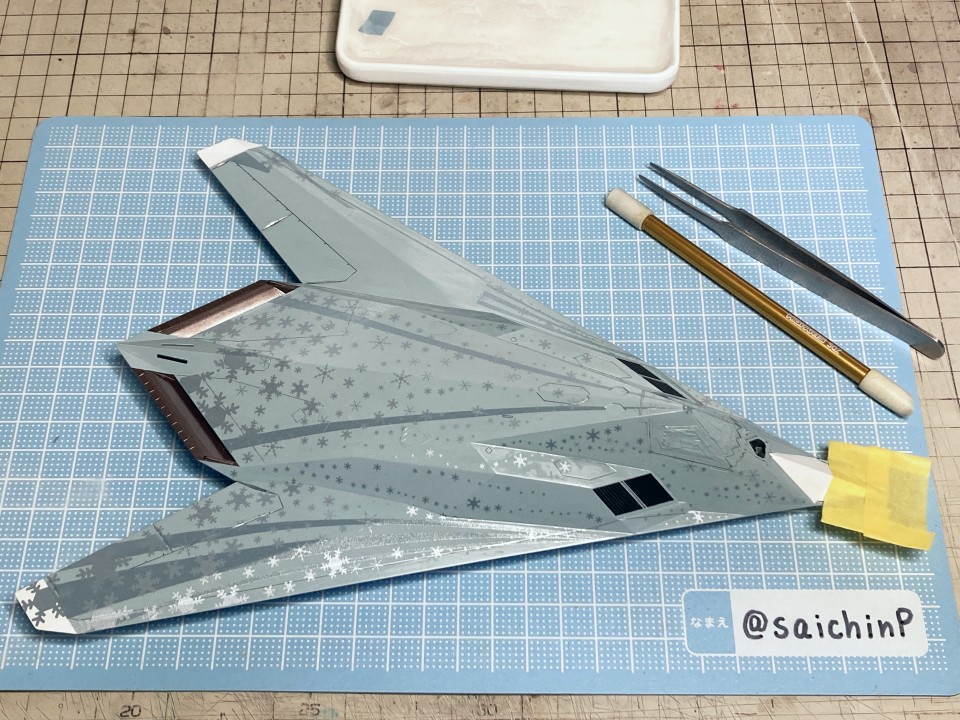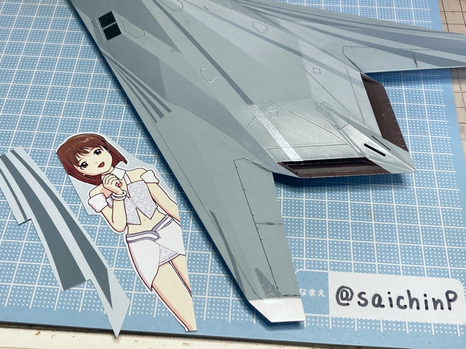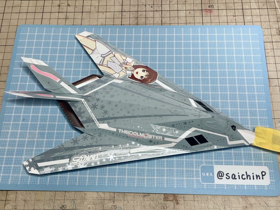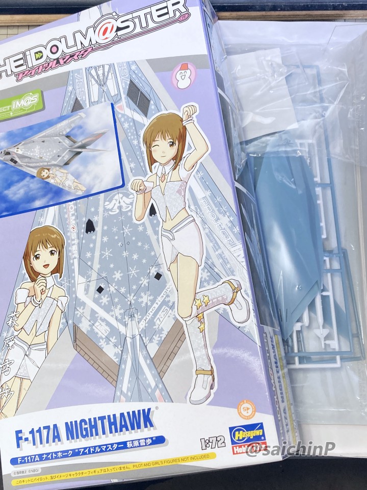 完成編の記事はこちら 雪歩誕生日なのでF-117Aを作りました 箱を開けると、その機体形状故かパーツは少なめです。 デカールは図柄がまとめられた大判が多めの構成。 脚カバー類は閉じて飛行状態にして、額縁への取付用のナットを接着しますが、位置がちょうど爆弾槽の扉部分になるので裏側からプラ板で補強しました。 組み立て全般はパーツが少なく、ステルス機でパネルラインも少ないので作業は楽でした。 形になるのはこれまでに作ったアイマス機で一番早かったです。 キャノピーは裏からスモークグレーを吹いて、コックピット内部は見えなくなるからジャーマングレーを吹いただけの割り切り仕様です。 キャノピー枠がステルス的なギザギザでマスキングがちょっと面倒。 下地に白を吹いてから機体色を吹きましたが、今回は機体色が明るい色なのでキャラの下地の透け対策やラインは塗装ではなくデカールそのままにしました。 翼端と機首だけはデカールではなく塗装です。 細部の塗り分けと、ウェザリングカラーのマルチグレーでのスミ入れのあとにクリアーコート(ラッカー系)で保護しました。 メタリックなラインのデカールから貼っていきますが、雪歩のキャラデカールと重なる部分は透け防止でカットします。 雪の結晶マークは複数マークがまとめられた大判デカールになるので技量に応じて分割して貼り込むのが無難でしょう。 最初に貼ったメタリック系のラインや雪の結晶はそんな事なかったのですが、白ラインや各種マーキングはぬるま湯に漬けたらいきなり4つに割れる、などかなり割れやすかったです。 貼る前にニスを塗って保護するなど対策をしたほうがいいかも。 ただし、買ってから10年以上積んでいたキットなのであまり文句は言えませんがw デカールをすべて貼ったらのり類を洗浄して、最後に水性のトップコートの半光沢を吹いて完成です。 作業期間は途中の中断を除いた正味で4週間くらいでした。 関連 雪歩誕生日なのでF-117Aを作りました タイフーン 菊地真 制作編 F-2A 双海亜美&F-16C 双海真美 制作編