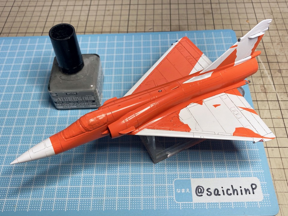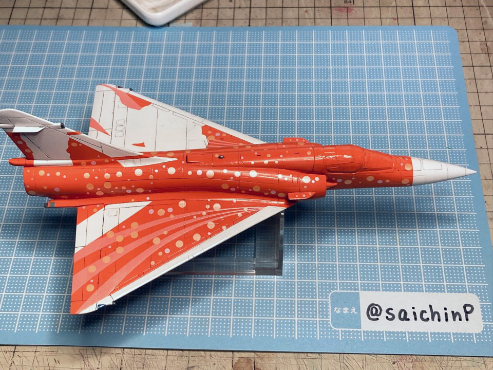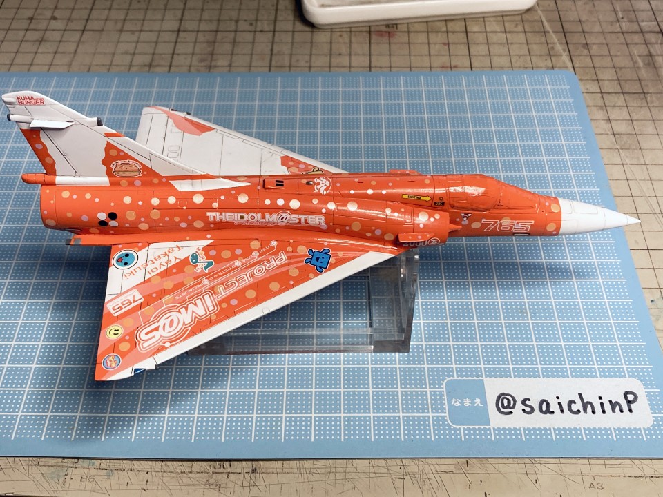 完成編の記事はこちら やよい誕生日なのでミラージュ 2000を作りました 元キットはイタレリ製でアイマス機仕様にするためのレジンパーツが追加されています。 いつものように額縁取り付け用のナットを接着してから脚カバーを閉じて飛行状態にしました。 ブレードアンテナは1本折ってしまって、どうせ他のも作業中に折るだろうと全部切り離して塗装後にプラ板で作ったものを取り付けることにしました。 コックピットは従来のラッカー系ジャーマングレー吹付けをタミヤアクリルNATOブラック吹付けからのマジックリン拭き取りに作業方法をバージョンアップ。 キャノピーはいつものように裏からスモークグレーで塗装してから接着、マスキングします。 パーツの合いは同メーカーの真タイフーンよりは良いですがハセガワキットのようなパチピタにはならないのでそれなりに修正が必要。 尾翼のフィンは形状がイマイチなのでプラ板で作り直しています。 サフを吹いてスジ彫りを彫り直したり、表面処理をしてから白で下地塗装。 白ラインやキャラデカールの透け防止部分をマスキング。 その後に吹き込み防止でラッカー系のクリアーをコートしました。 機体色のやよいオレンジを吹いてマスキングを剥がしたら軽く研ぎ出して、ウェザリングカラーのマルチグレーでスミ入れ。 その後、ラッカー系のクリアーを吹いて乾燥後に軽く研ぎ出し。 主翼のラインを貼ってから水玉デカール。 今回のは以前の雪歩F-117Aみたいに割れまくることはなくて貼りやすかったです。 各種ロゴ類とお待ちかねのやよいちゃんを貼ります。 コーションデカールはあえて間引いて目立つ物だけにしています。 特にウォークウェイの点線はやよいに被るので貼りませんでした。 この後細部部品を取り付けて半つや消しの水性クリアーでコートしたら完成です。 作業期間は約1ヶ月。 関連 やよい誕生日なのでミラージュ 2000を作りました F-117A 萩原雪歩 制作編 タイフーン 菊地真 制作編 PR