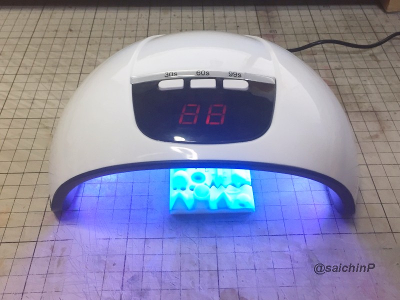 本番パーツを出力してみました。 フィギュアに付ける小さめのアクセサリです。 あれれ、サポートは出ていますがパーツ部分が出ていません。 レジンを戻してフィルムを確認したらパーツ部分が影のように貼り付いていました。 除去して再出力。 サポートとパーツの接続部分が細かったのが原因のようで、露光時間を長めに設定変更したら、ちゃんと出ました。 失敗した露光時間の短いやつは、かなり弾力があって曲がります。 これは2次硬化が必要だとなるので、ポチりました。(ここからが本題) ネイル用のUVライトです。 本来は手を入れて爪に塗ったジェルネイルを硬化させるものです。 内側はLEDのUVライトが付いています。 赤外線センサーがあって手を入れるとセンサーでスイッチが入って光ります。 大きめのパーツを入れられるように嵩上げします。 百均でサイズがピッタリのドッグフードを入れる犬用のお皿があったのでこれにしました。 光のあたりを良くするためにアルミテープを貼りまくりました。 アルミ断熱シートの切れ端で手を入れる部分を覆って蓋にしました。 皿と本体をつなぐヒンジは養生テープというチープ仕様。 蓋を締めたらセンサーが反応するように皿側にPP板の切れ端を貼り付けました。 硬化させる物によってはソーラーターンテーブルで回してまんべんなく光を当てることもできます。 ここまで1500円くらいでそれっぽくなりました。(ターンテーブルは除く) これで天日干しとおさらば。 関連 3Dプリンター Elegoo Mars 2 Proを導入 PR