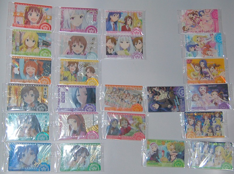 サイン入りは春香2枚、美希2枚、やよい、千早、貴音、雪歩、亜美真見、伊織、律子2枚が揃い、真、響、あずさが揃いませんでした。
