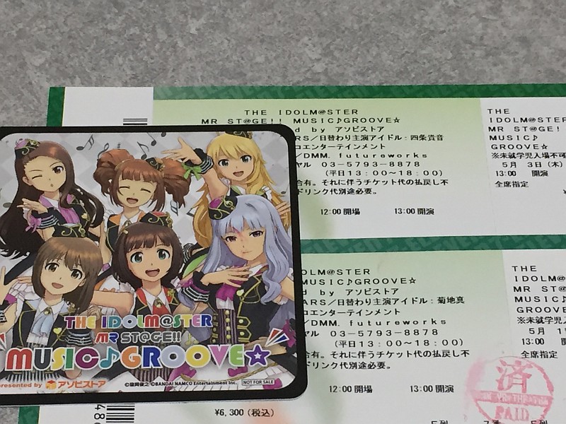 「THE IDOLM@STER MR ST@GE!! MUSIC♪GROOVE☆」 に参加してきました。 あまりに凄い体験だったので、これは伝えておかなければと乏しい語彙で書き連ねておきます。 私は5/1の真の初回、5/3の貴音の初回に参加、この後5/18の千早も参加予定です。 当初このアイマスMRが発表された時は何をやるのかよくわかりにくい上記のPVと発表ニコ生くらいしか前情報がなくて、以前プロミ2017でお披露目した立体映像の春香で初音ミクっぽいライブをやるのかなと言う程度の認識でした。 劇場のキャパが350人くらいなので競争率高そうなので4口申し込んで初日の春香が落選で真、貴音、千早が当選となりました。(※チケット代が高額で競争率低かった模様。) この、チケットに書かれた主演アイドル「菊地真」「四条貴音」という名前の強さよ。 初日の春香回に参加したPたちが口を揃えて凄い凄いいうので期待しつつ5/1の真(初回)に参加。 開催地のDMM VRシアターは座席がA~P列までありますが、最前にパイプ椅子でAA列が追加されていました。 後方にはPA席もあり年末のニコ生特番でよく見るおじさんたちもいました。 席の段差が2列につき1段上る感じなので段差直後の席じゃないと前の人の頭が邪魔で見にくいかもしれません。(※あまり段差が急だとスクリーンと高度差が付いて立体に見えにくくなる?) 私は真回はF列中央、貴音回はA列左端といった感じでした。ちょっと見上げる感じになりますが端であってもA列のほうが良いと感じました。 MR(複合現実)ということで特にゴーグルを装着ということはなくて普通のライブと同じように鑑賞します。 大雑把な流れはいつものアイマスライブと同じで