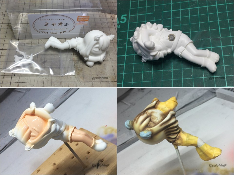 ちょうど手持ちに美也ちゃんのガレージキットがあったので誕生日記念に組みました。 キットは以前のワンフェスで購入した、ディーラー名「たつ屋」さんの「ミャオ」です。 ミリオンライブの三姉妹カフェのネコちゃんです。 デフォルメ具合がとてもかわいい素敵なキットでした。 制作は基本的にストレート組ですが、塗り分け部分のモールドを深く彫ったりはしています。 それと、お腹部分に磁石を仕込んで、色々な場所にくっつけて遊べるようにしてみました。 制作期間は1週間くらいです。