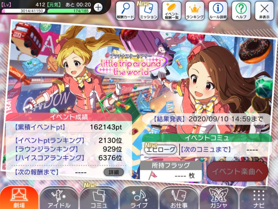 前回のやよいイベントDeep, Deep Blueから間にワーキングを挟んでの5日後、伊織が上位のイベント、little trip around the worldがスタートしました。