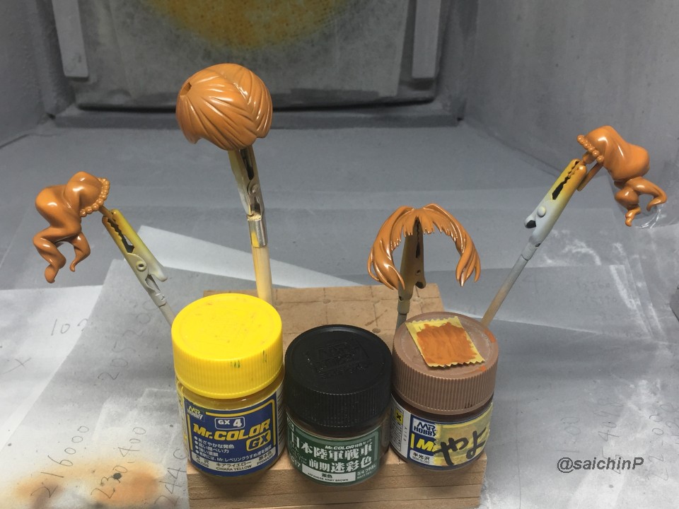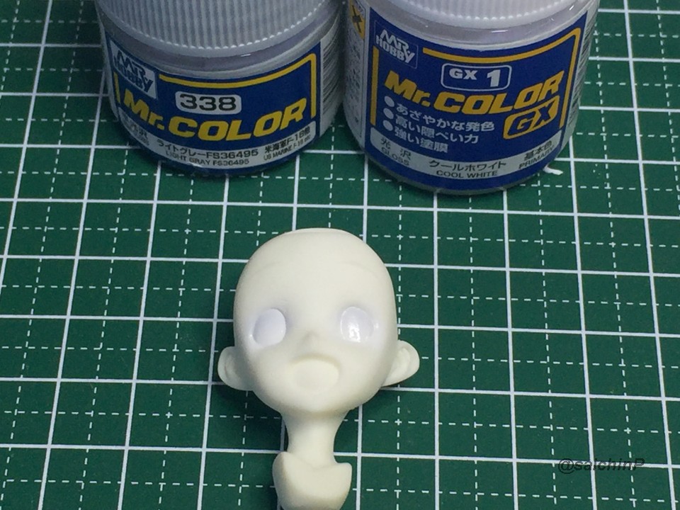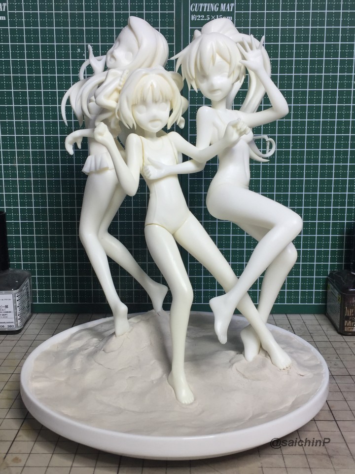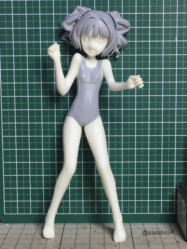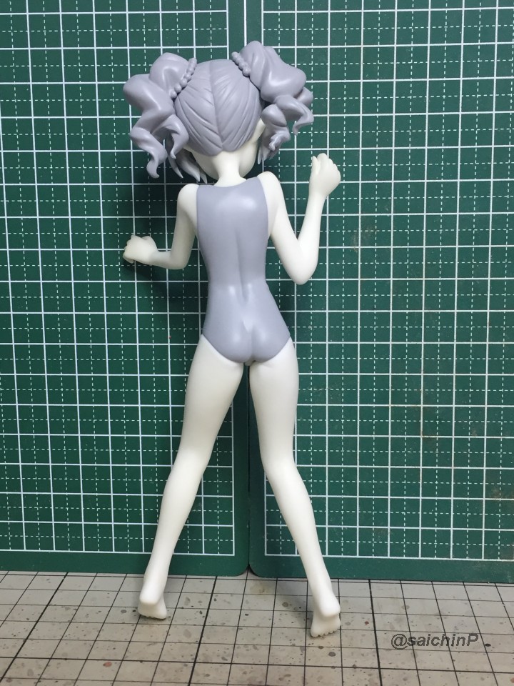 完成したフィギュアの記事はこちら やよい誕生日なのでガレージキットを組みました2021 キットは2013年の夏ワンフェスで購入したもの。 やよい単品でも作れますが別売の伊織、響と組み合わせるポーズになっています。 パーツ洗浄、最近はスクラビングバブルのキッチンクリーナーと超音波洗浄機を使用。 最終的に全面に紙やすりで足付けするので洗浄はあまり熱心ではありません。 軸打ち、2mmの真鍮線を使用。なるべく複数パーツをまたいで貫通させるように配慮しています。 こんな感じで、やよいを中心に、伊織と響を組み合わせる構成になっています。 ですが、この状態で強度を確保して数年後も変形せずに保てるか自信がないのでフィギュア同士の接合用のダボ穴は埋めます。 そしてこんな感じでベースを作って、ベースにそれぞれ接続する予定です。 ちょっと地面がわざとらしくなりますがw 湯口削って、パーティングライン処理して、気泡埋めて、全面ヤスって足付けして、肌以外のパーツにサフを吹きました。 駆け足ですが、毎回やってることは同じなので。 スク水は水色を下地にして影色の濃い青を吹いてから基本色を吹きました。 髪の毛は黄色を下地にして影色の茶色を吹いてから基本色を吹きました。 細部をマスキングして塗装、スク水の白線はタミヤの曲線用マスキングテープが便利。 胸の名札「高槻」はPCでデータを作成してデカールに印刷して貼りました。 手書きでやよいちゃんのへた文字を再現できる自信がなかった。 肌部分の塗装、下地にガイアのマルチプライマーを吹き付け。 白目は先に影色のグレーを吹いてから白を吹き重ね。 肌色はラスキウスのホワイトピーチ下地にクリアーペールレッドの吹き重ね。 眉毛をラッカー系の髪色で筆塗りしてから顔パーツをクリアーでコーティングして保護。 口は練り消しでマスキングしてから、ピンク系で吹き、影色をクリアーペールレッドでスミ入れ。 まぶた上の線を茶色、まつげラインを黒で筆塗り、ここからはエナメル系使用。 はみ出たり線がよれたりしたら爪楊枝にエナメル溶剤を含ませて削る感じで整えます。 瞳の下描きを水色で行いました。 小さい円を太らせていく方向で狙った形を目指しています。 下描きを黒でなぞって瞳を描き込みます。 いきなり黒で描いて消すして修正してを繰り返すと汚れることが多いので、薄い色で下描きして、本番の黒はなぞるだけで一発で決めたほうが成功しやすいです。 瞳の中をやや緑がかった水色で塗って、ハイライトとかを入れて完成。 このあとはつや消しクリアーを全体に吹いて最終組み立てになります。 作業期間は約3週間、お疲れさまでした。 おまけ この写真はこんな感じで人工芝を下に敷いて手前部分をちょっと持ち上げて台座が隠れるようにしてローアングルで撮影しています。 手前の草と背景の空は被写界深度を調整してぼかしました。 ストロボを真上に向けてのバウンス撮影です。 関連 やよい誕生日なのでガレージキットを組みました2021 EXTRA STAGE 秋月律子 制作編 水瀬伊織 ~STAGE~ 制作編 PR |