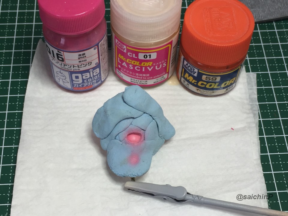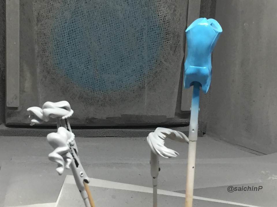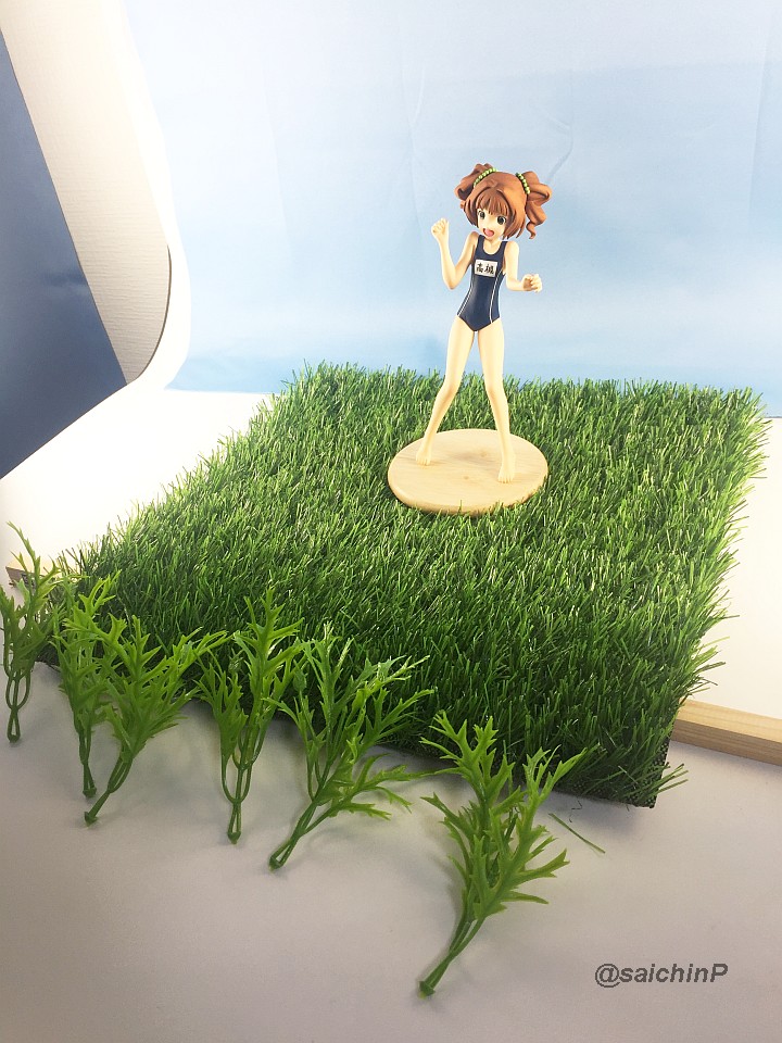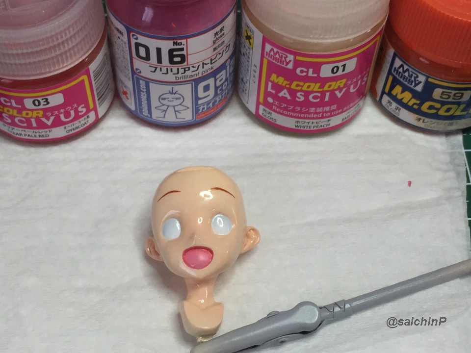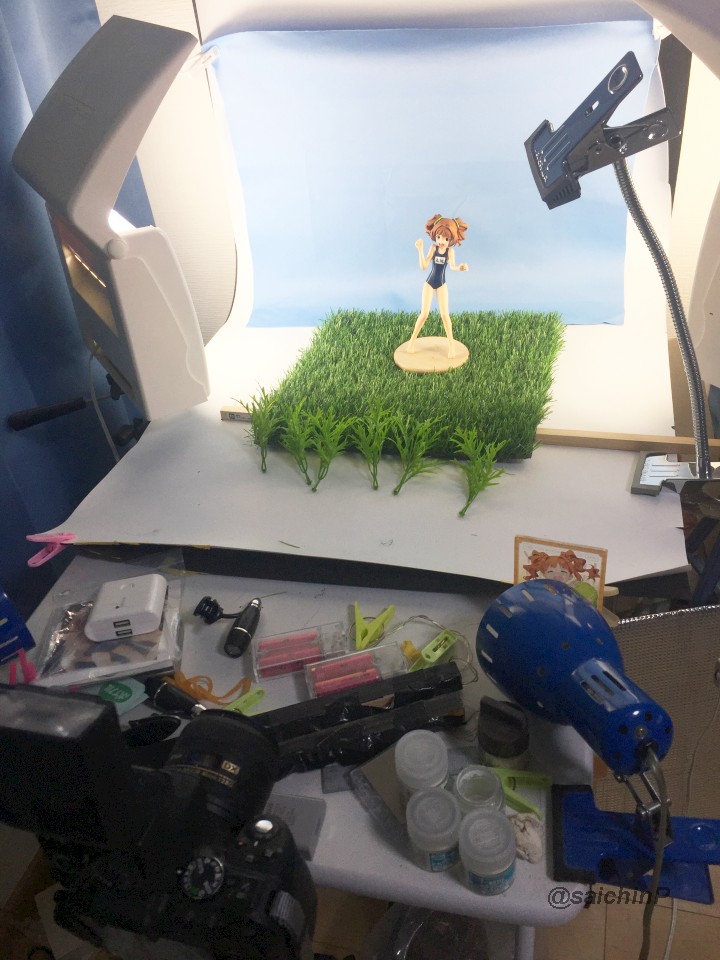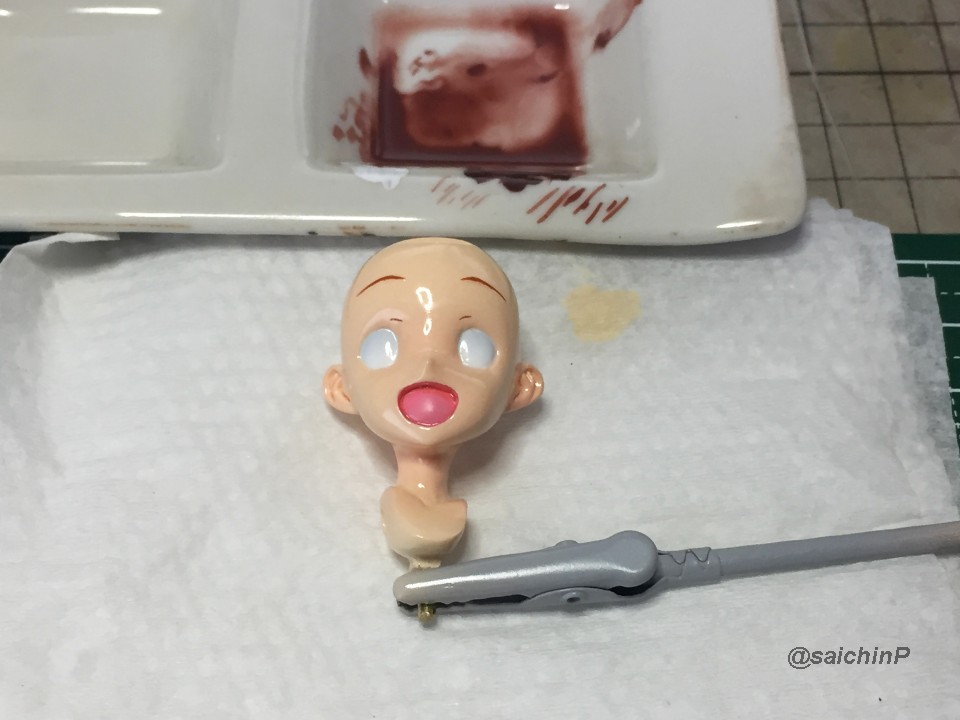 完成したフィギュアの記事はこちら やよい誕生日なのでガレージキットを組みました2021 キットは2013年の夏ワンフェスで購入したもの。 やよい単品でも作れますが別売の伊織、響と組み合わせるポーズになっています。 パーツ洗浄、最近はスクラビングバブルのキッチンクリーナーと超音波洗浄機を使用。 最終的に全面に紙やすりで足付けするので洗浄はあまり熱心ではありません。 軸打ち、2mmの真鍮線を使用。なるべく複数パーツをまたいで貫通させるように配慮しています。 こんな感じで、やよいを中心に、伊織と響を組み合わせる構成になっています。 ですが、この状態で強度を確保して数年後も変形せずに保てるか自信がないのでフィギュア同士の接合用のダボ穴は埋めます。 そしてこんな感じでベースを作って、ベースにそれぞれ接続する予定です。 ちょっと地面がわざとらしくなりますがw 湯口削って、パーティングライン処理して、気泡埋めて、全面ヤスって足付けして、肌以外のパーツにサフを吹きました。 駆け足ですが、毎回やってることは同じなので。 スク水は水色を下地にして影色の濃い青を吹いてから基本色を吹きました。 髪の毛は黄色を下地にして影色の茶色を吹いてから基本色を吹きました。 細部をマスキングして塗装、スク水の白線はタミヤの曲線用マスキングテープが便利。 胸の名札「高槻」はPCでデータを作成してデカールに印刷して貼りました。 手書きでやよいちゃんのへた文字を再現できる自信がなかった。 肌部分の塗装、下地にガイアのマルチプライマーを吹き付け。 白目は先に影色のグレーを吹いてから白を吹き重ね。 肌色はラスキウスのホワイトピーチ下地にクリアーペールレッドの吹き重ね。 眉毛をラッカー系の髪色で筆塗りしてから顔パーツをクリアーでコーティングして保護。 口は練り消しでマスキングしてから、ピンク系で吹き、影色をクリアーペールレッドでスミ入れ。 まぶた上の線を茶色、まつげラインを黒で筆塗り、ここからはエナメル系使用。 はみ出たり線がよれたりしたら爪楊枝にエナメル溶剤を含ませて削る感じで整えます。 瞳の下描きを水色で行いました。 小さい円を太らせていく方向で狙った形を目指しています。 下描きを黒でなぞって瞳を描き込みます。 いきなり黒で描いて消すして修正してを繰り返すと汚れることが多いので、薄い色で下描きして、本番の黒はなぞるだけで一発で決めたほうが成功しやすいです。 瞳の中をやや緑がかった水色で塗って、ハイライトとかを入れて完成。 このあとはつや消しクリアーを全体に吹いて最終組み立てになります。 作業期間は約3週間、お疲れさまでした。 おまけ この写真はこんな感じで人工芝を下に敷いて手前部分をちょっと持ち上げて台座が隠れるようにしてローアングルで撮影しています。 手前の草と背景の空は被写界深度を調整してぼかしました。 ストロボを真上に向けてのバウンス撮影です。 関連 やよい誕生日なのでガレージキットを組みました2021 EXTRA STAGE 秋月律子 制作編 水瀬伊織 ~STAGE~ 制作編 PR |