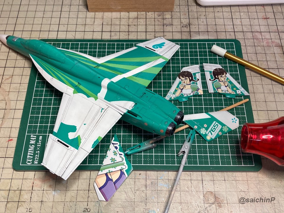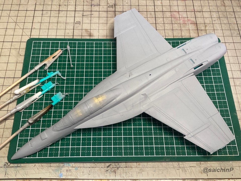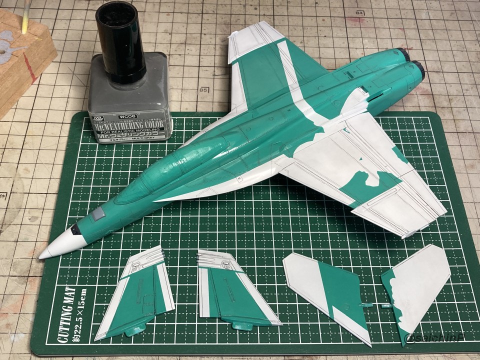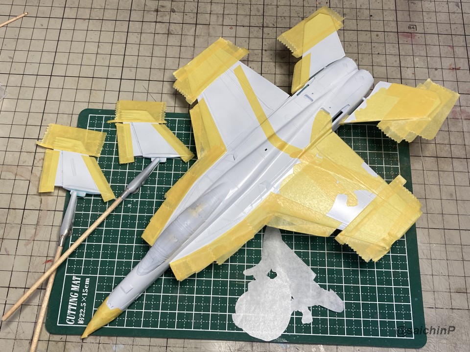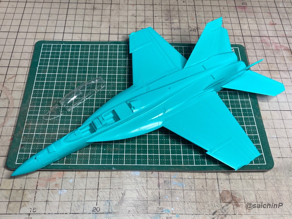 完成編の記事はこちら 律子誕生日なのでF/A-18Fを作りました キットは発売当時の2011年に購入したものです。 デカールの劣化が不安でしたが問題ありませんでした。 仮組みしてみたら赤丸部分に機首と胴体とインテークの接続部が集中していて継ぎ目処理が大変そうです。 しかし、今回は額縁に固定する予定なので下面の継ぎ目処理は大雑把でかまわないので楽です。 額縁への固定用のM5のナットを脚収納庫部分に接着しました。 ついでに樹脂の染料の染め上がりをチェックするために1日うすめ液につけておきましたが、問題なし。 あとは飛行状態として普通に組み立てていきます。 成型色がビビッドな水色で見にくかったので傷確認用に早めにサフを吹きました。 パイロットは付いていないのでキャノピーはスモークグレーで裏から吹いて暗くして、コックピットもざっくり作ってエアブラシの届く範囲だけジャーマングレーで吹いてベタ塗り。 キャノピーを接着して、全体のサフ吹き、傷埋め傷チェック、スジ彫り再生を3回くらい繰り返して表面処理。 全体の下地を白を吹いてからマスキング。 白の塗り分けはデカールも付いていますが発色重視で可能な限り塗装にしました。 機体色を吹いてマスキングを剥がしてこの状態。 色は説明書の指示よりもやや緑側に振って調色しています。 マスキングして細部の塗り分け。 ウェザリングカラーのマルチグレーでスミ入れ。 ちょっとだけ拭き残して軽めのウェザリングも兼ねています。 一旦、ラッカー系のスーパークリアーを吹いて軽く研ぎ出ししてからデカールを貼り始めます。 今回はデカール貼り用にヒートガンとハイキューパーツのデカールスキージーを新たに導入。 熱でデカールを軟化させてスキージーでコロコロ押し付ければモールドによくなじんで作業がとてもはかどりました。超おすすめ。 デカールをひたすら貼っていきます。 多いところだとデカールを三重に重ね貼りする場所もあるので、順番に注意です。 機首から主翼にかけての左右のハの字ライン3本が難易度高かったです。 貼り終わったら水性の半光沢クリアーを吹いて最終組み立てして額縁に固定して完成です。 作業期間は11日間で、うちデカール貼りが約11時間でした。 アイマス機は発売された当初に買って、いつか自分が模型の腕を上げたら挑戦しようと思ってたんですが、映画『トップガン マーヴェリック』を観たことがきっかけで作ってみたら、意外といける!というのがわかったので、今後は他のアイマス機もペースを上げて完成させていきたいですね。