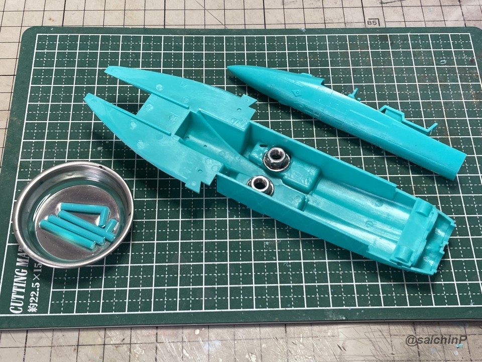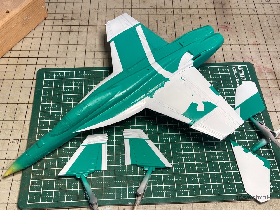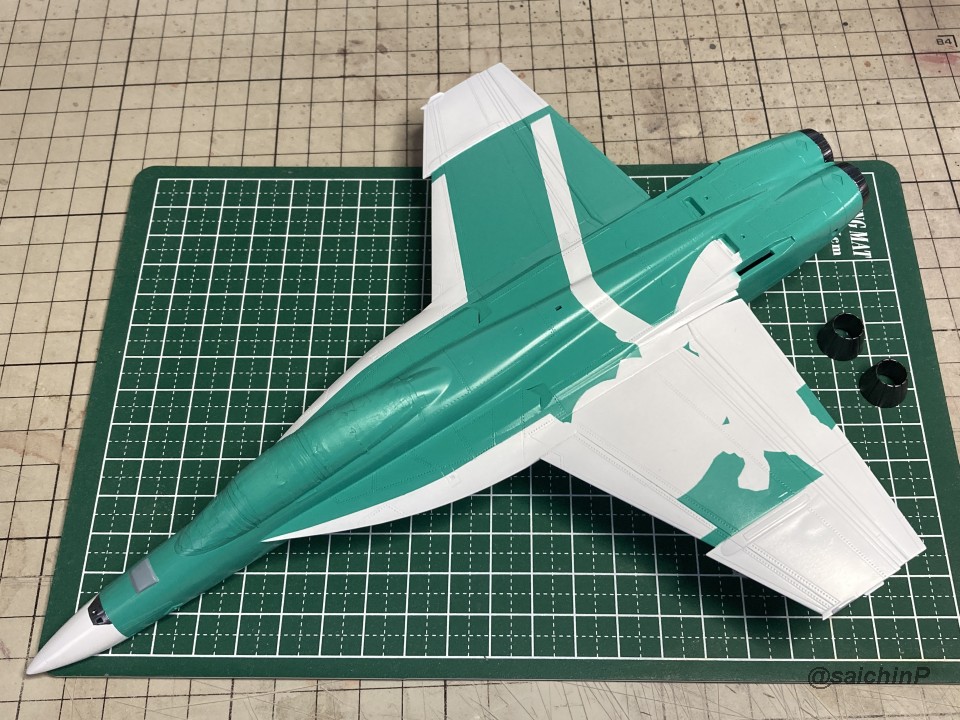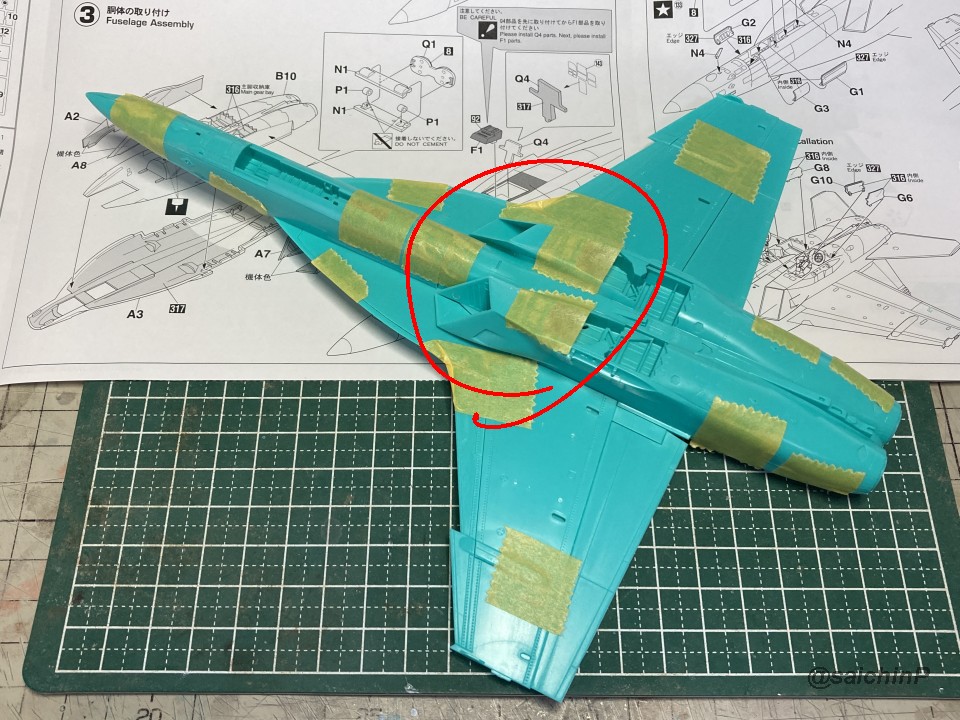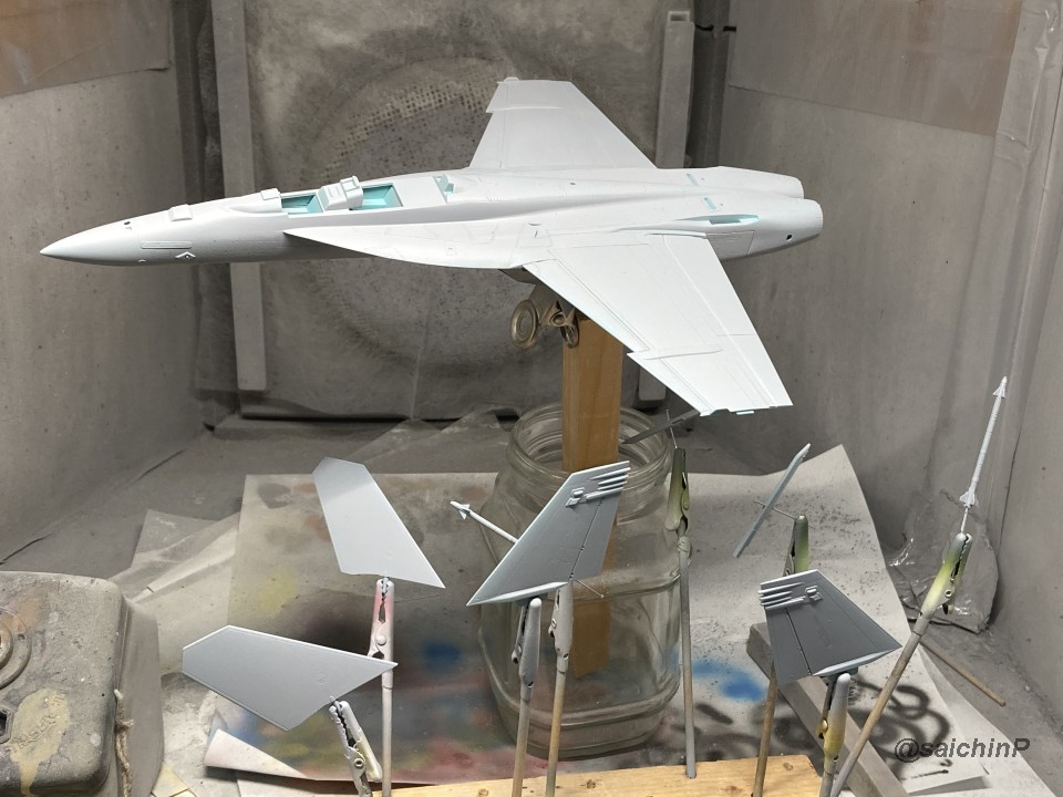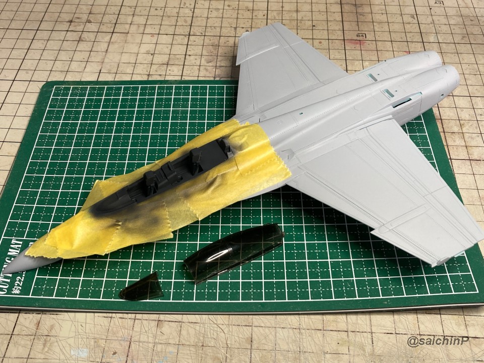 完成編の記事はこちら 律子誕生日なのでF/A-18Fを作りました キットは発売当時の2011年に購入したものです。 デカールの劣化が不安でしたが問題ありませんでした。 仮組みしてみたら赤丸部分に機首と胴体とインテークの接続部が集中していて継ぎ目処理が大変そうです。 しかし、今回は額縁に固定する予定なので下面の継ぎ目処理は大雑把でかまわないので楽です。 額縁への固定用のM5のナットを脚収納庫部分に接着しました。 ついでに樹脂の染料の染め上がりをチェックするために1日うすめ液につけておきましたが、問題なし。 あとは飛行状態として普通に組み立てていきます。 成型色がビビッドな水色で見にくかったので傷確認用に早めにサフを吹きました。 パイロットは付いていないのでキャノピーはスモークグレーで裏から吹いて暗くして、コックピットもざっくり作ってエアブラシの届く範囲だけジャーマングレーで吹いてベタ塗り。 キャノピーを接着して、全体のサフ吹き、傷埋め傷チェック、スジ彫り再生を3回くらい繰り返して表面処理。 全体の下地を白を吹いてからマスキング。 白の塗り分けはデカールも付いていますが発色重視で可能な限り塗装にしました。 機体色を吹いてマスキングを剥がしてこの状態。 色は説明書の指示よりもやや緑側に振って調色しています。 マスキングして細部の塗り分け。 ウェザリングカラーのマルチグレーでスミ入れ。 ちょっとだけ拭き残して軽めのウェザリングも兼ねています。 一旦、ラッカー系のスーパークリアーを吹いて軽く研ぎ出ししてからデカールを貼り始めます。 今回はデカール貼り用にヒートガンとハイキューパーツのデカールスキージーを新たに導入。 熱でデカールを軟化させてスキージーでコロコロ押し付ければモールドによくなじんで作業がとてもはかどりました。超おすすめ。 デカールをひたすら貼っていきます。 多いところだとデカールを三重に重ね貼りする場所もあるので、順番に注意です。 機首から主翼にかけての左右のハの字ライン3本が難易度高かったです。 貼り終わったら水性の半光沢クリアーを吹いて最終組み立てして額縁に固定して完成です。 作業期間は11日間で、うちデカール貼りが約11時間でした。 アイマス機は発売された当初に買って、いつか自分が模型の腕を上げたら挑戦しようと思ってたんですが、映画『トップガン マーヴェリック』を観たことがきっかけで作ってみたら、意外といける!というのがわかったので、今後は他のアイマス機もペースを上げて完成させていきたいですね。