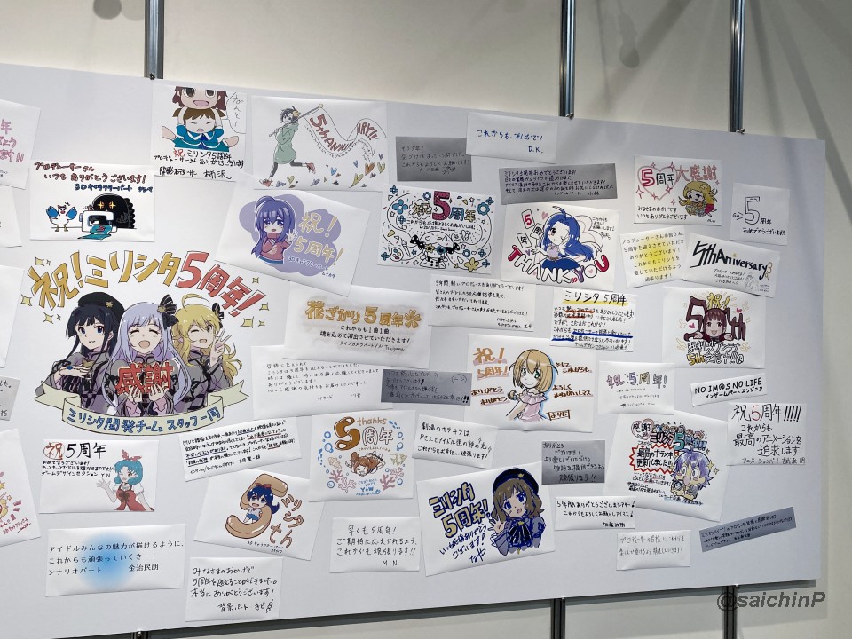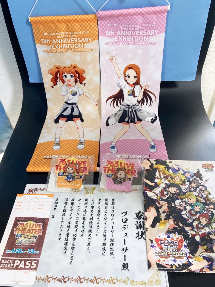 開催日程は6/25~7/3だったのですが、出演アイドルが日替わりで入れ替わるのです。 高槻やよいちゃんは6/27(月)の平日だったのですが前売りチケット(3000円)を買ってスケジュールを調整して午前11時頃に入場しました。 土曜日曜は入場時間がチケットで指定されますが平日はフリーでした。 私が行った回の出演者はこの5人。 天海春香 高槻やよい 佐竹美奈子 福田のり子 所恵美 展示の内容はと言うと、ミリシタの劇場を再現した感じのセットが設えてあって、各種設定資料や衣装の実物などが展示されているという感じです。 一部禁止の場所もありますがほぼ撮影OKでした。 私的に今回の目玉がSSRカードイラストのラフの展示。 候補にあった別構図のデザインなんかもあってとても興味深かったです。 ラフ関係はうちのユニットのやよい、伊織、真美の分だけ写真載せておきます、展示そのものは各アイドルのカードイラストのラフがありました。 こちらはミリクロのSRカードのラフ。 こちらは制服シリーズのSRカードのラフ。 ラフ以外だと、アイドルの家族の設定イラストが興味深かったです。 けるちゃんとハリ子 衣装の設定とか。 衣装の展示も各種ありました。 資料的な展示はだいたいこんな感じ。 ミリシタのグラビアスタジオ実写背景モードで撮影するためのセットも用意したありました。 更衣室とステージ背景。この辺が撮影に時間がかかって人が溜まってしまいがち。 今回の目玉その2、舞台袖モード。 ミリシタのMVにはない視点の舞台袖から見た光景がスクリーンで上映されています。 みんな腕組みしながらP面で見ていて面白かったです。 これ以外に、2階席から見る関係者席視点(?)もありましたがこちらは撮影不可。 ゲームにも取り入れて欲しいですね。 基本、このMVのメンバーが日替わりで入れ替わるという感じです。 これはスタッフ、関係者のメッセージ。 あとは物販会場なんかがあって平日なら空いているので30分くらいで見て回れる感じです。 休日だと何を見るにも並ぶ感じになって時間がかかったようです。 お土産で過去の感謝祭イベントのパンフレット復刻版が貰えます、ランダムで数種類あって私は今年のやつでした。(あと、ステッカーとかタイムカードも貰えます) タペストリーとアクリルバッジが物販で買ったもの。 写真内の賞状はスタンプラリーで貰ったクリアファイル。 個人的にはコロナで不要不急な外出を控えていた関係で秋葉原に行ったのが2年半ぶりくらいで、久しぶりにオタクっぽい事して楽しかったですね。 関連 ミリオンライブ振り返り展示会に行ってきました アイマスMRステージ ENCOREに行ってきた アイマスMRステージでカワイイの最先端を観てきた PR |