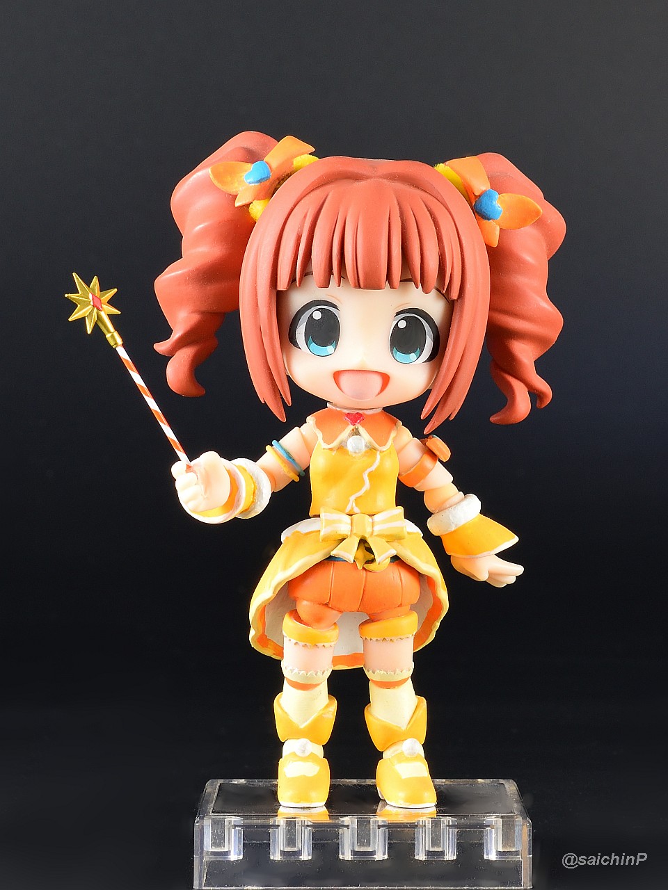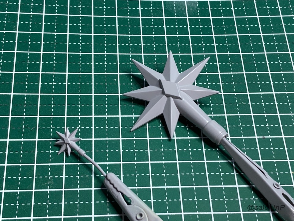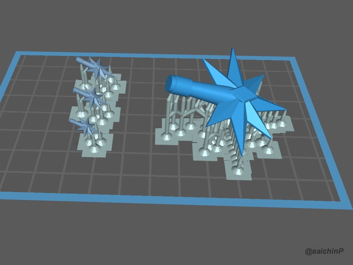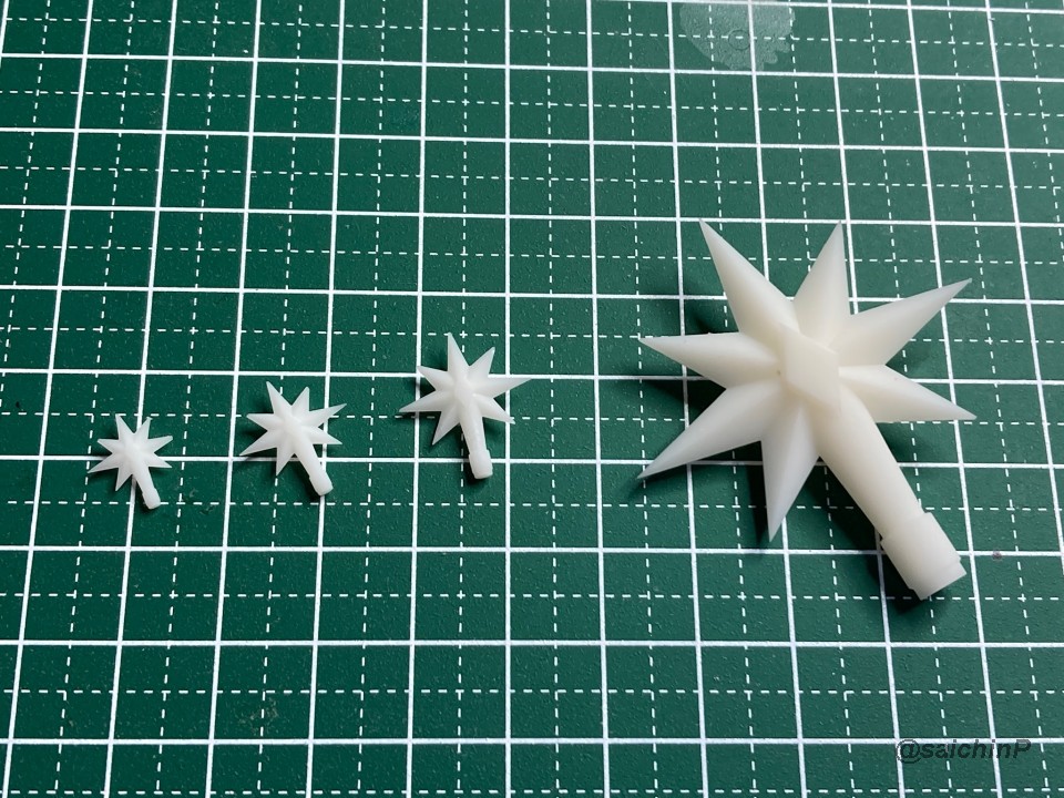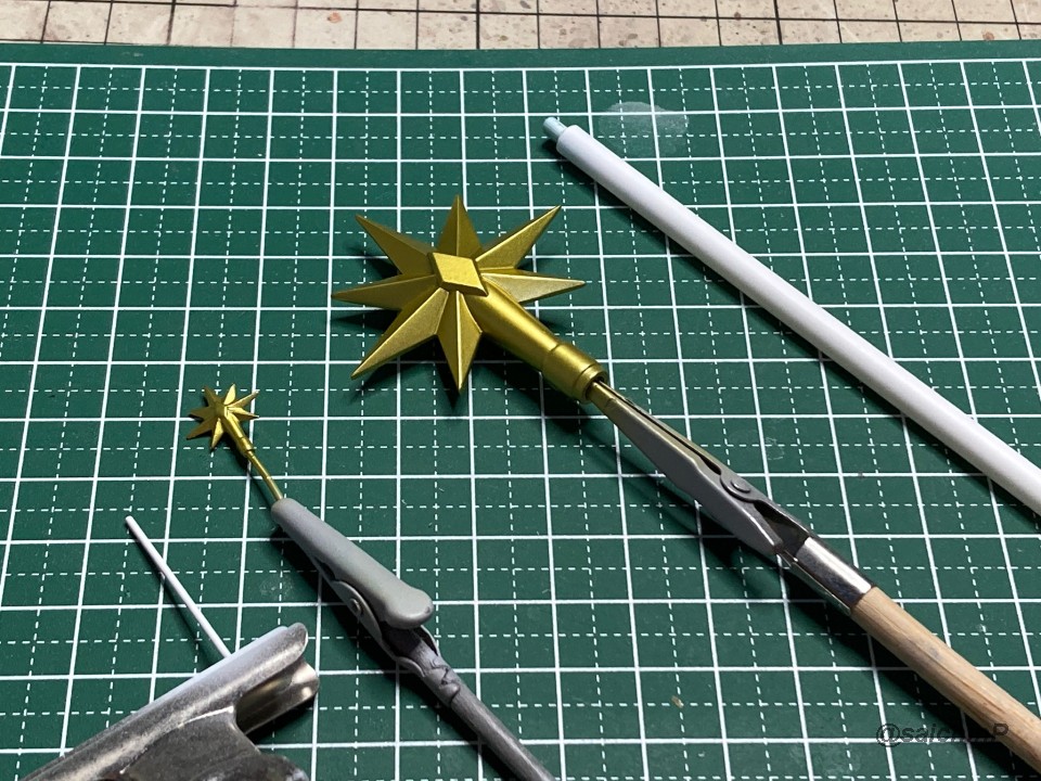 キューポッシュ用とドール用の2サイズ同時制作です。 ZBrushでモデリングしました。 ドールサイズとキューポッシュサイズで出力します。 キューポッシュサイズはデフォルメのバランスを考えて微妙にサイズ違いのを用意しました。 3DプリンタはElegoo Mars 2 Proです。2時間半くらいで出力完了。 積層痕やサポートの処理をしてサフ吹き、この表面処理が結構手間がかかります。 キューポッシュ用は3種類のうち中サイズのを使用。 ステッキの棒部分はドール用が5mmプラ棒。キューポッシュ用が1.5mmの真鍮線で白サフで塗装。 先端部分は金色(エルドランゴールド)を吹きました。 棒部分をマスキングしてオレンジの螺旋に塗り分けて、先端の赤い宝石は銀下地のクリアーレッドでキャンディ塗装としました、これで完成。 作業期間は1週間くらい。デジタル原型だとサイズ違いを同時に作れるのがいいですね。