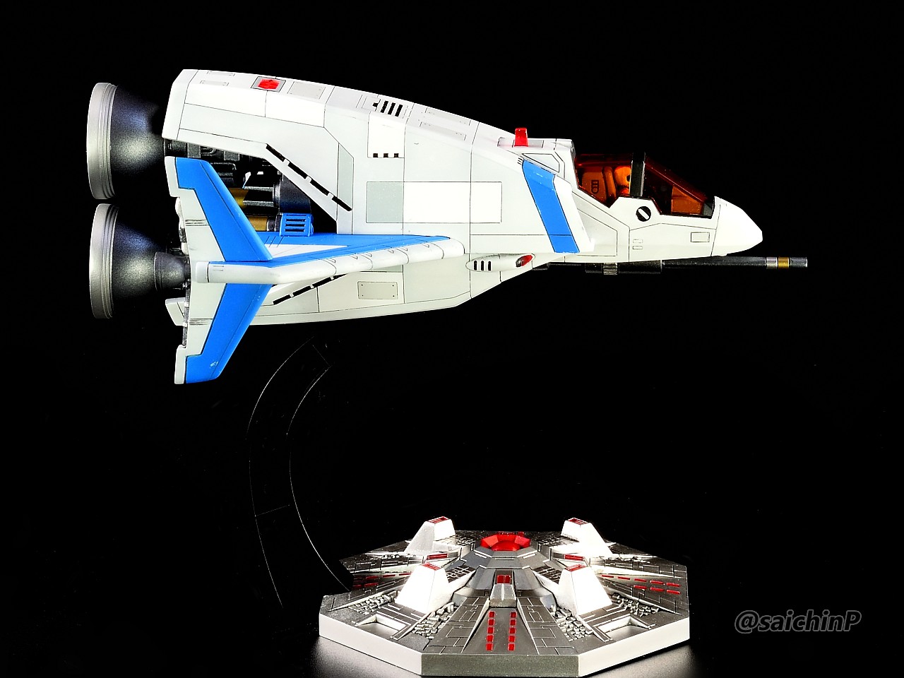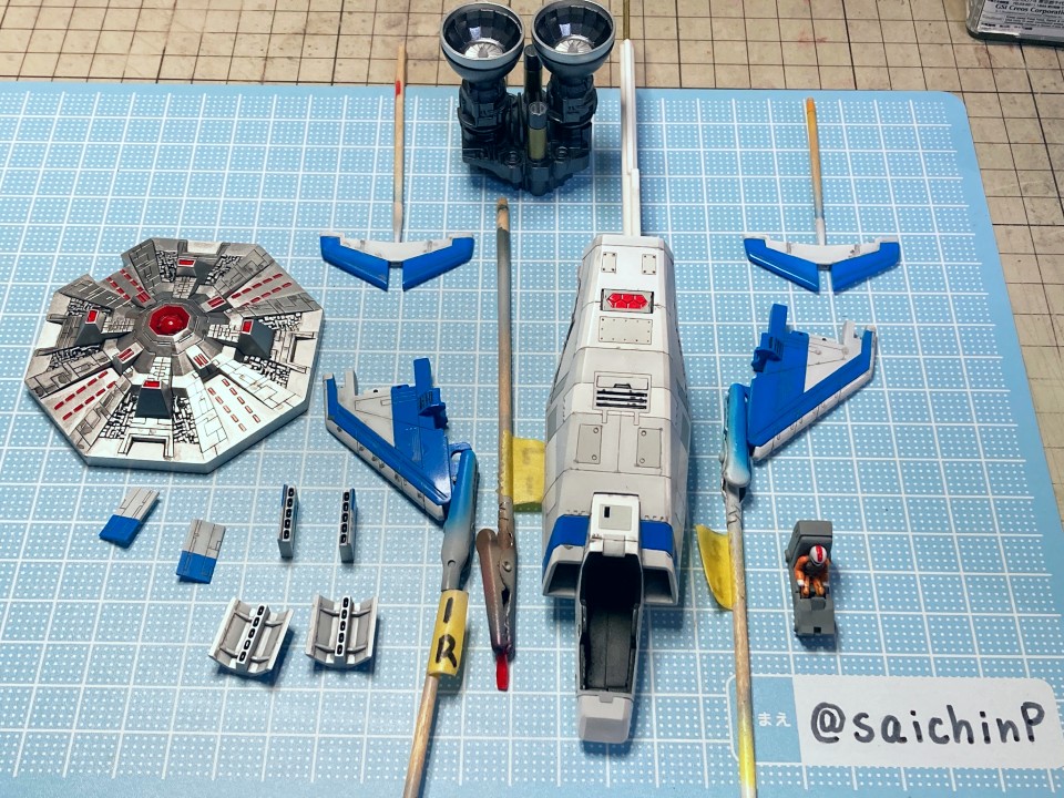 ゼビウスは私が子供の頃にかなり好きだったゲームで『ベーマガ』の付録のスーパーソフトマガジン片手に攻略に勤しんでいましたが、ゲーセンもですがパソコンのX1版のほうが多くやったかもしれません。 そんな思い入れのあるゲームの40周年に自機のプラモデルが存在し、それを作れるのは素晴らしいですね。 キットはノンスケール表記ですがコックピットやパイロットフィギュアのサイズからすると1/72くらいかもしれません。 背景が黄緑色だとゲーム画面みたいなので何枚かはそれで撮影してみました。 あとはいつもの黒背景。 ベースのアンドアジェネシスがなかなか良い出来です。 塗装はパネル単位で白の色味をちょっと変えたりしてみました。 あと、チッピングもしていて普段作るジェット機よりも撮影プロップ的な仕上げにしています。 細部の塗り分けや青ラインの色味などは自分アレンジで雰囲気を楽しんでいます。 エアブレーキは差し替えで開閉させることができます。 ここからは作業の様子。 スナップフィットで色分けプラなのでパチパチ組むだけで3時間でここまでできます。 ただし、スナップフィット故にはめ込み用のピンや受けが裏側に大量にありその部分のキット表面にヒケが出ていたりします。 今回はその辺の整面を重視して作業しました。 エアインテークのフィンはプラ板で作り直してシャープにしています。 (写真向かって左がキットのまま、右が改修したもの) ここと、機体上部の赤いライト(アンテナ?)をクリアーパーツに置き換えたのが改修点となります。 エンジンとかのメタリック部分の塗装。 主翼とエンジンは後ハメ加工しています。 機体はパネル単位でマスキングを繰り返して白~グレーの4色で塗り分けています。 青ラインもマスキングしての吹き付け塗装です。 細部などを塗って、スミ入れしたら組み立てとクリアコートで完成です。 作業期間はWFの準備をしながらで中断がちょくちょくありましたが正味で3週間くらいです。 模型SNSにも投稿しているのでいいね支援よろしくお願いします。