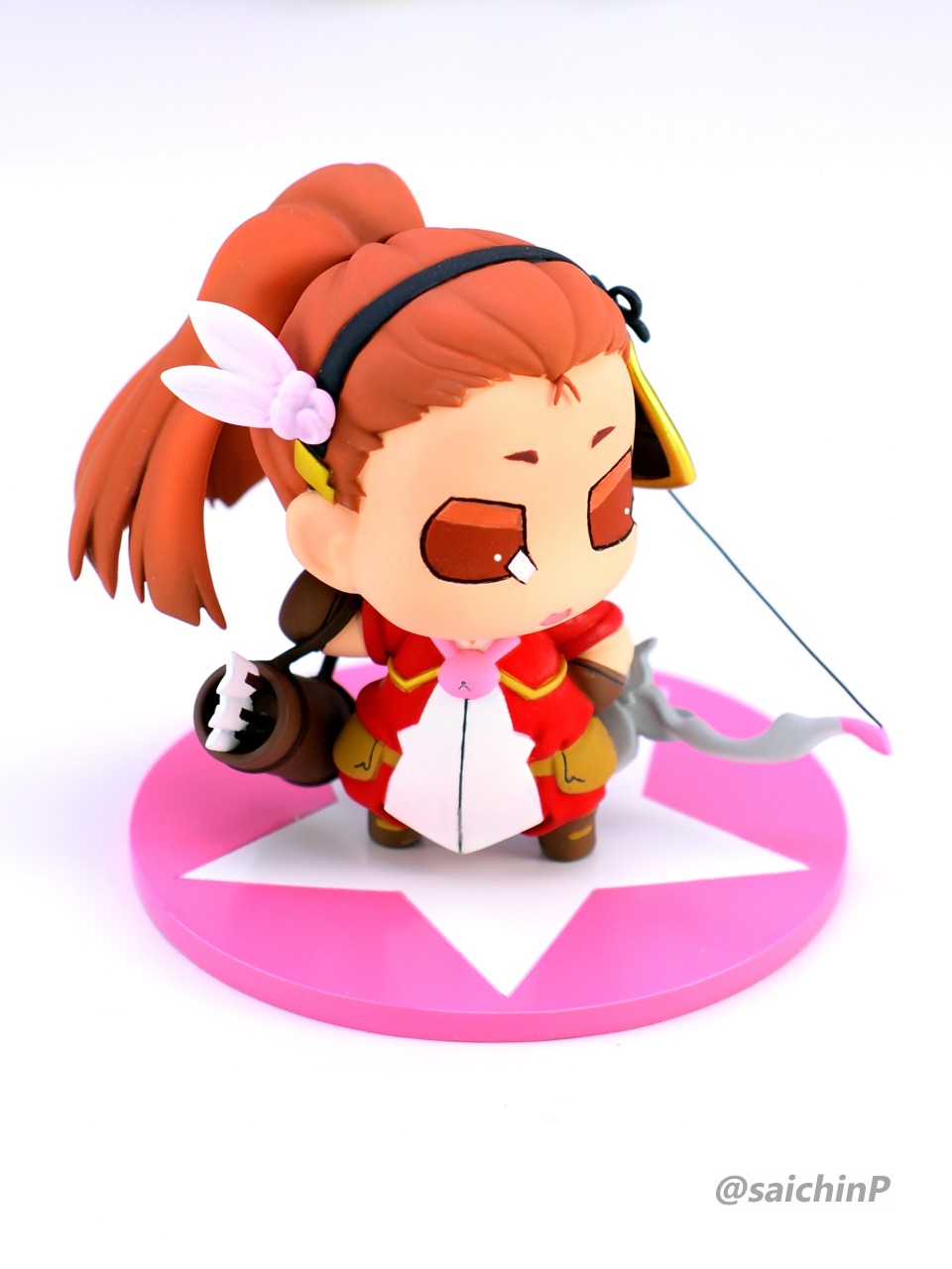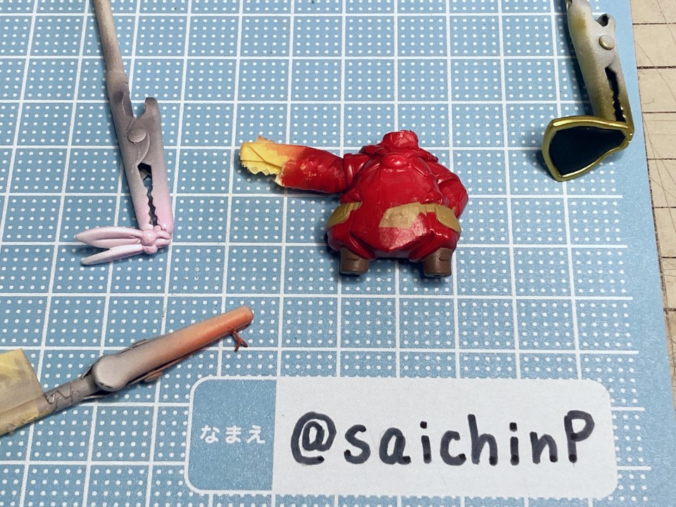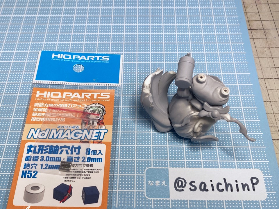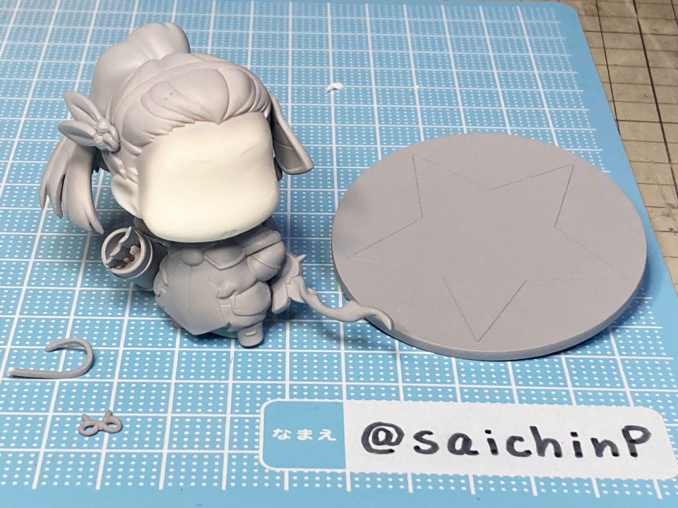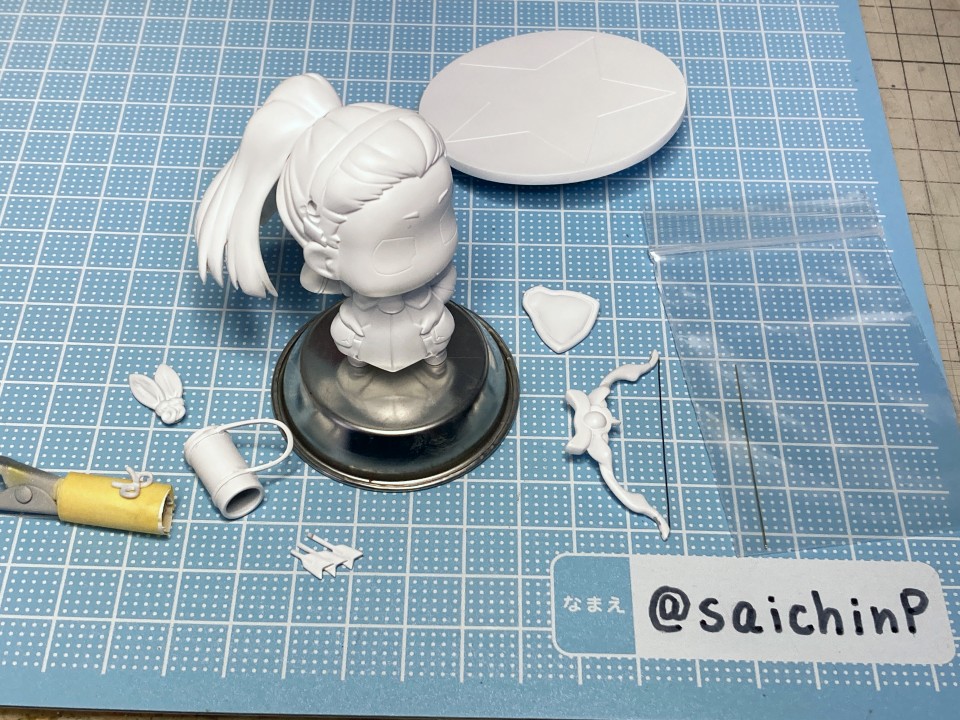 ぷちます!6巻のRPG風キャラ紹介イラストのアーチャーいおです。 ここからは作業中の様子。 キット構成は瞳デカール2枚と弓の弦用の真鍮線が付属したレジン製キット。 細かいパーツは予備が入っているのが嬉しい配慮。 私は矢筒のストラップを折ってしまって予備に救われました。 普通のガレキなので普通に組み立てます。 足裏にはハイキューパーツの軸穴付きマグネットを仕込んで鉄板に自立させるようにしました。 軸穴を利用して真鍮線で台座に固定もできます。 弓の弦は付属の真鍮線は使わずに極細のエナメル線で張りました。 あと、おでこの生え際のチョロ毛をエナメル線を芯に瞬間接着パテを盛って自作しています。(右写真の左下のY字のパーツ) 塗装はマスキングしてエアブラシです。 瞳デカールは2枚付いていましたが2連続失敗のため塗装で塗り分けました。 模型SNSにも投稿しているので支援いいねお願いします。