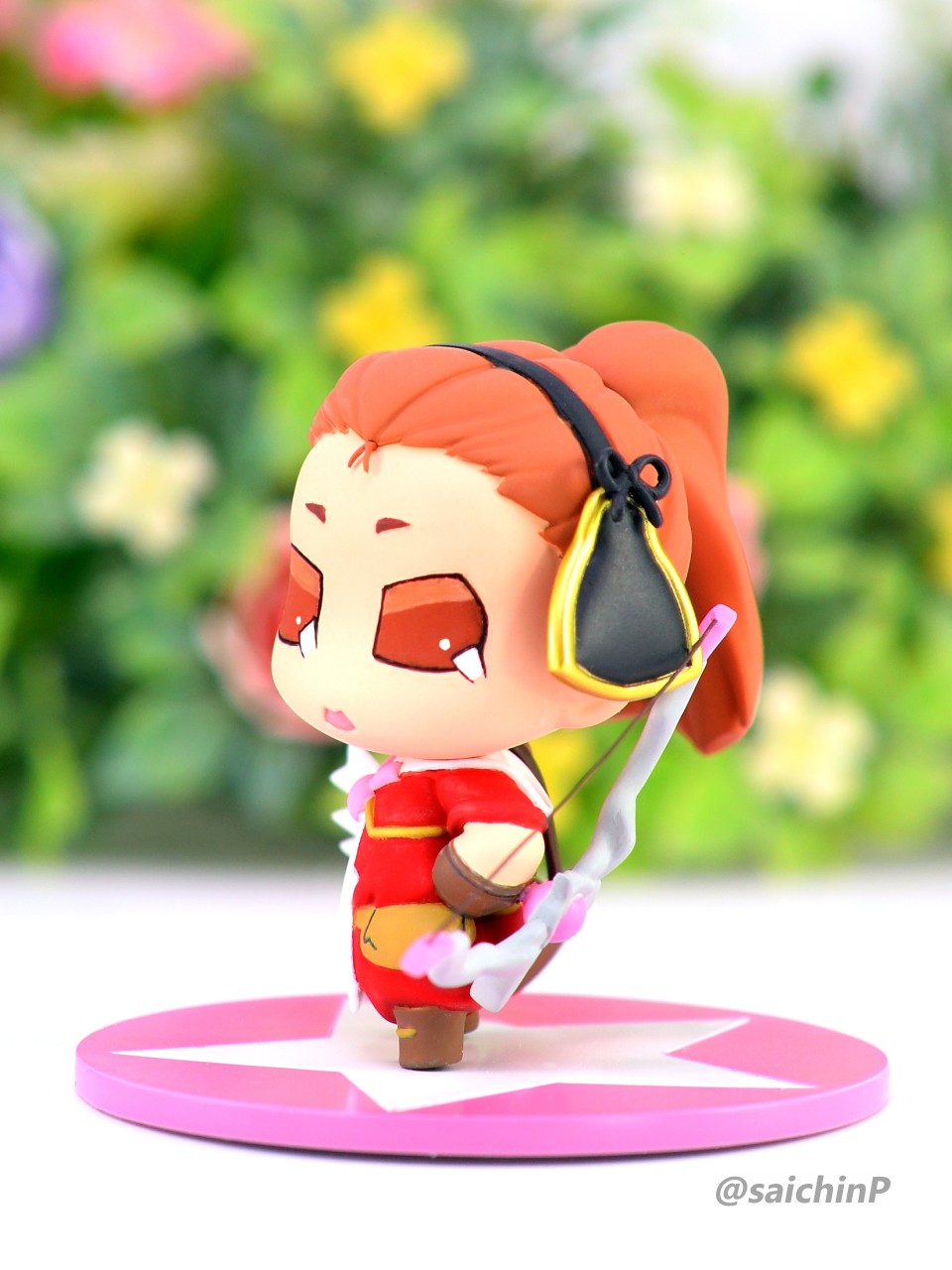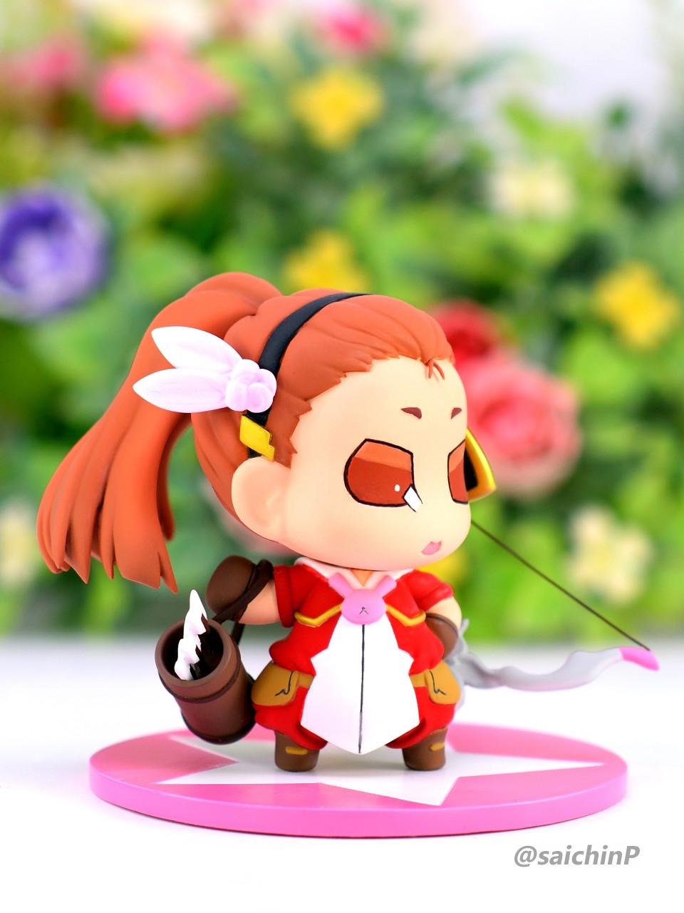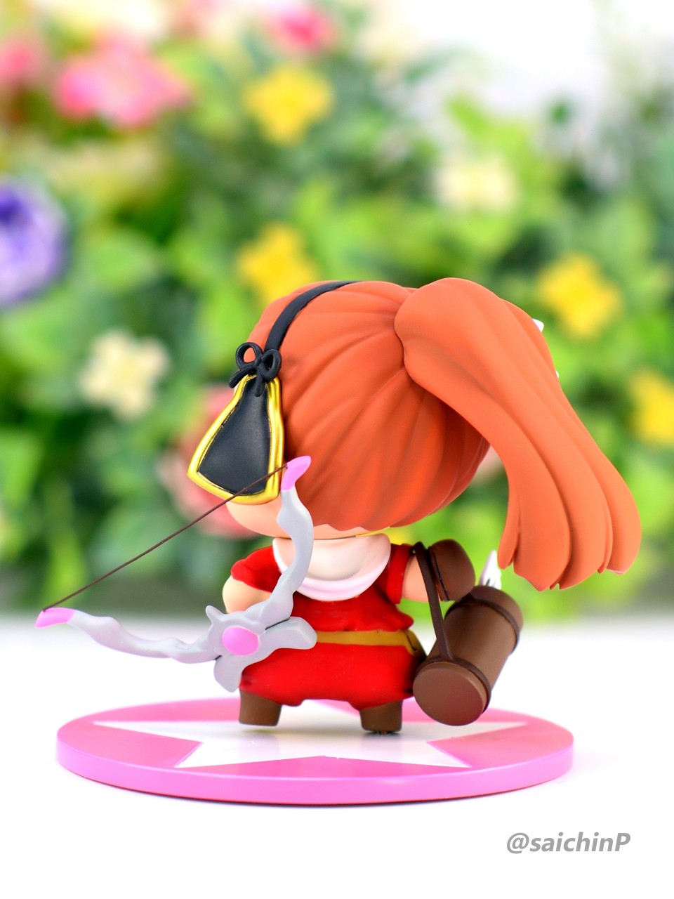 ぷちます!6巻のRPG風キャラ紹介イラストのアーチャーいおです。 ここからは作業中の様子。 キット構成は瞳デカール2枚と弓の弦用の真鍮線が付属したレジン製キット。 細かいパーツは予備が入っているのが嬉しい配慮。 私は矢筒のストラップを折ってしまって予備に救われました。 普通のガレキなので普通に組み立てます。 足裏にはハイキューパーツの軸穴付きマグネットを仕込んで鉄板に自立させるようにしました。 軸穴を利用して真鍮線で台座に固定もできます。 弓の弦は付属の真鍮線は使わずに極細のエナメル線で張りました。 あと、おでこの生え際のチョロ毛をエナメル線を芯に瞬間接着パテを盛って自作しています。(右写真の左下のY字のパーツ) 塗装はマスキングしてエアブラシです。 瞳デカールは2枚付いていましたが2連続失敗のため塗装で塗り分けました。 模型SNSにも投稿しているので支援いいねお願いします。