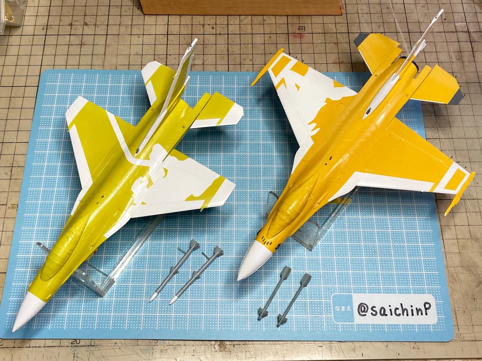 ハセガワの1/72スケール、F-2A "アイドルマスター 双海亜美"とF-16C "アイドルマスター 双海真美"の組み立て作業の解説編です。