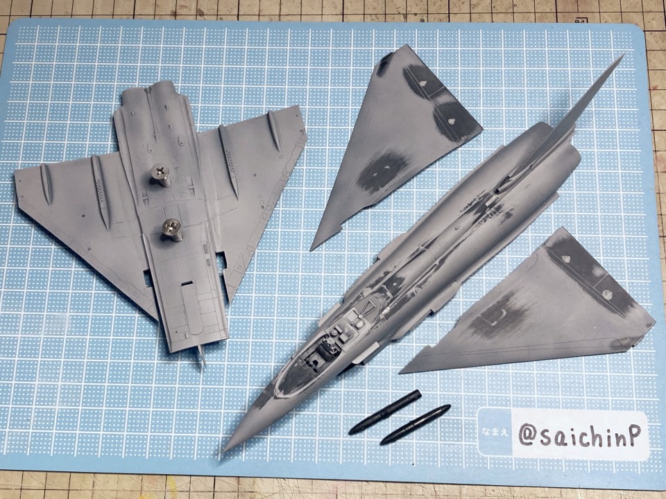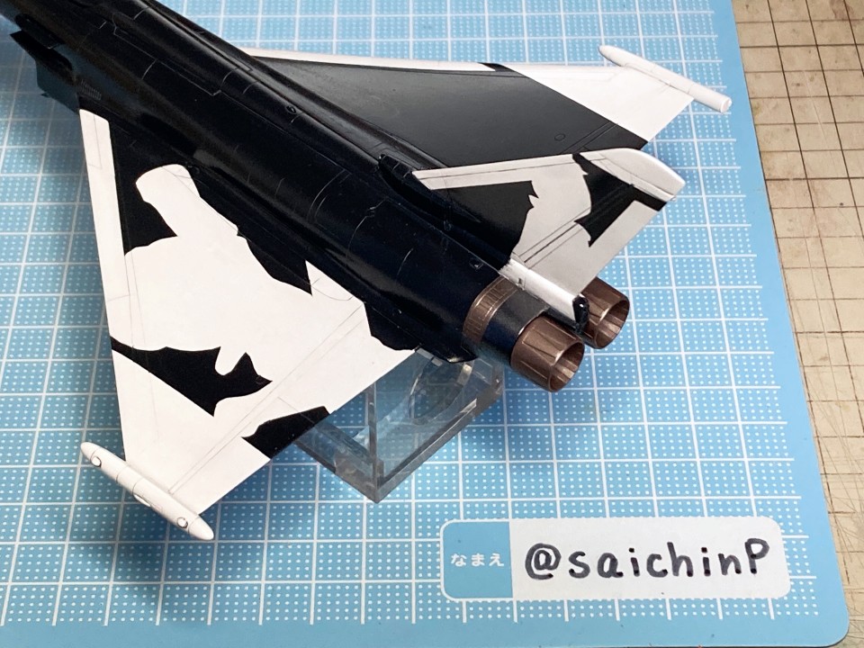完成編の記事はこちら 真誕生日なのでタイフーンを作りました キットは中身がドイツレベル製の物です。 後年にハセガワから新金型で繊細なモールドの素晴らしいタイフーンのキットが出ているのですが、それと比較するとバリ、ヒケ、歪みなど多く組み立てにはそれ相応の手間がかかります。 デカールだけ流用してハセガワのキットを使ったら楽だろうなと考えてしまいますが、私は当時のキットで作ることをコンセプトにしているのでこのままいきます。 下面に額縁取付用のナットを仕込んで、脚カバーは飛行状態に閉じます。 サフ吹いてチェックすると、ヒケ、歪み、段差などがあちこちにあるので国産キットのパチピタというわけにはいきません。 主翼下面がエアインテークと一体なのでここの合わせが一番手間がかかりました。 後から主翼上面を取り付けて形になったらコックピットをジャーマングレーでベタ塗り。 キャノピーも磨いて整えないと表面がでこぼこしています、取り付けたらマスキングして表面処理と消えたスジ彫りの修復とかをしました、ここが一番時間がかかっています。 納得できる表面になったら下地の白を吹き付け。 機体色が黒なので、白ライン以外の部分の胴体とかはサフ地のままです。 いつもな感じに白ラインとアイドル部分のマスキングをして機体色の黒を吹きます。 説明書のレシピに黒を足してより黒っぽくしたものを吹きました。 マスキングを剥がしたらクリアーを吹いてウェザリングカラーのマルチグレーでスミ入れ。 ここまで、白、黒、クリアーを吹いてますが都度、軽く研ぎ出しをしています。 2000番で数回軽く撫でてからメラミンスポンジで擦る感じです。 ノズル部分の金属色をマスキングして塗り分けました。 ちなみにノズルは開状態、閉状態の選択式でしたが、閉状態は湯が回って無くて欠けていて使えなかったので選択の余地なく開状態を使用しています。 デカール貼りは最初に主翼のハの字のラインデカールを貼ります、白を塗装にしているとデカールをカットする必要があるのでやや難易度高いです。 薔薇の花びらデカールを重ねて貼っていきます。 今回からデカール用のぬるま湯の為にカップウォーマーを導入しました。 朝から晩まで作業しててもぬるま湯状態がキープされて便利でした。 花びらの後にロゴやらコーションデカールを貼って、最後にアイドルを貼ってデカールは終わり。 このあと乾燥させてからぬるま湯で拭いてデカールの糊などを拭き取ってから半光沢クリアを吹いて完成です。 作業期間は約4週間。 関連 真誕生日なのでタイフーンを作りました F-2A 双海亜美&F-16C 双海真美 制作編 Su-33 星井美希 制作編 PR |