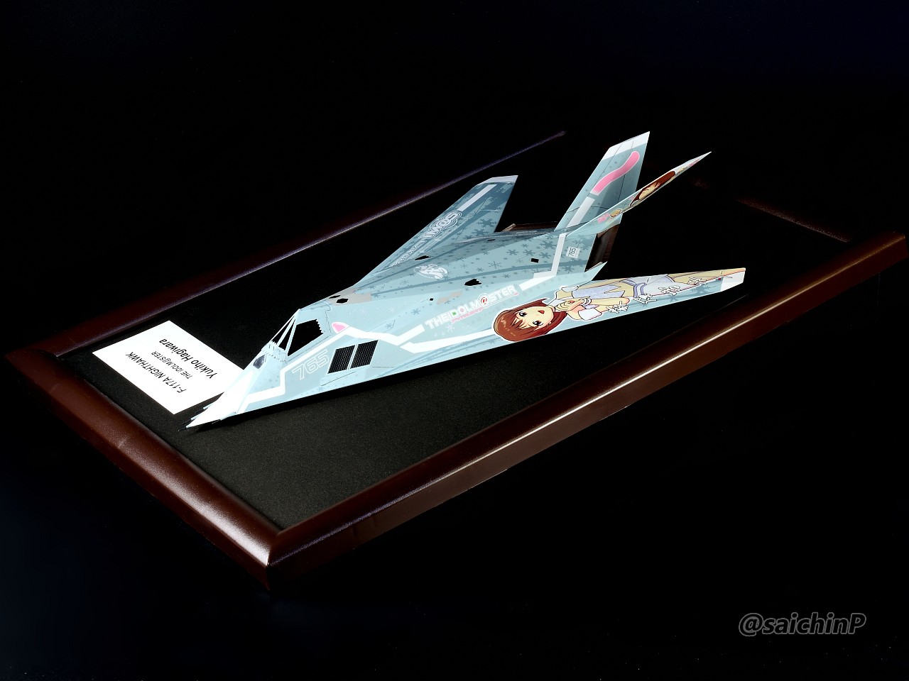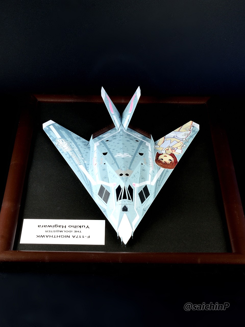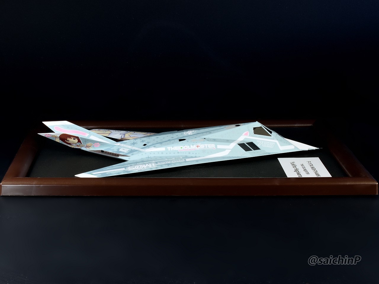 ハセガワの1/72スケール、F-117A ナイトホーク "アイドルマスター 萩原雪歩"を作りました。 アイマス機を全部作ろうシリーズの今年4機目、通算だと6機目です。 作業の様子は別記事でどうぞ。 F-117A 萩原雪歩 制作編 ここからは各アングルでのギャラリーです。 垂直尾翼の角度の都合で雪歩が見えにくい。 作業期間は途中の放置を除いて約4週間。 パーツ数が少なくてステルス機なのでパネルラインも皆無で組み立ては楽な方でしたが、デカールは割れやすくて大変でした。 模型SNSにも投稿しているのでいいね支援よろしくお願いします。