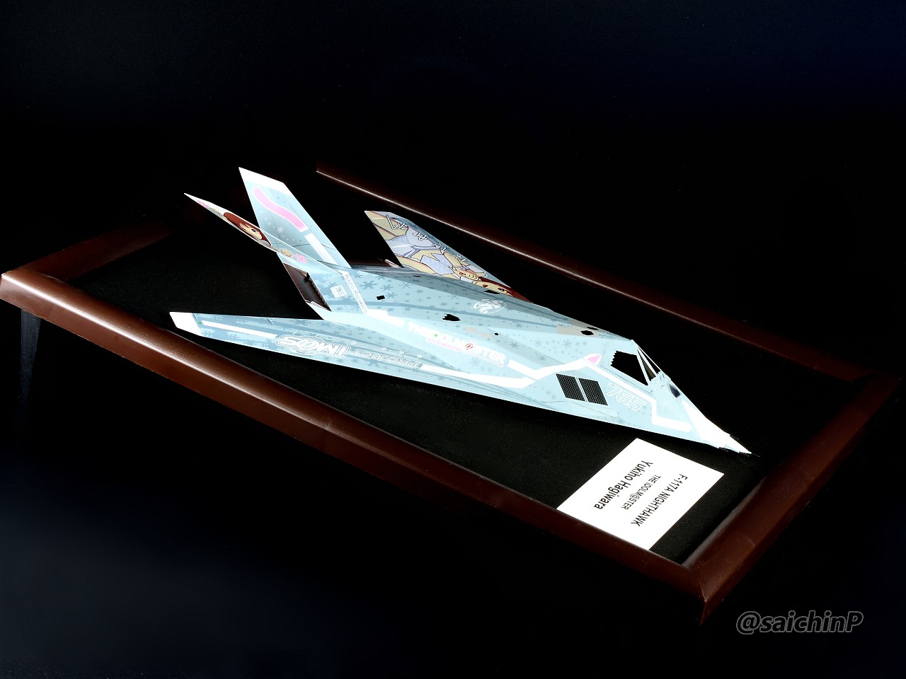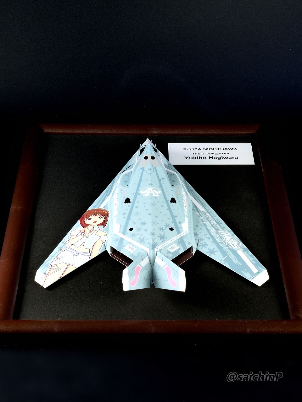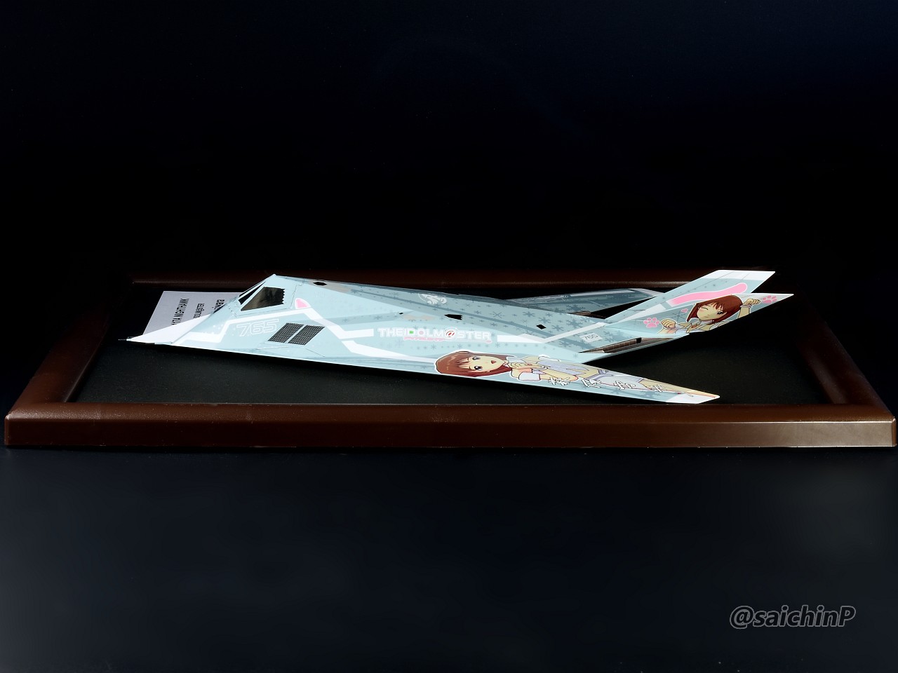 ハセガワの1/72スケール、F-117A ナイトホーク "アイドルマスター 萩原雪歩"を作りました。 アイマス機を全部作ろうシリーズの今年4機目、通算だと6機目です。 作業の様子は別記事でどうぞ。 F-117A 萩原雪歩 制作編 ここからは各アングルでのギャラリーです。 垂直尾翼の角度の都合で雪歩が見えにくい。 作業期間は途中の放置を除いて約4週間。 パーツ数が少なくてステルス機なのでパネルラインも皆無で組み立ては楽な方でしたが、デカールは割れやすくて大変でした。 模型SNSにも投稿しているのでいいね支援よろしくお願いします。