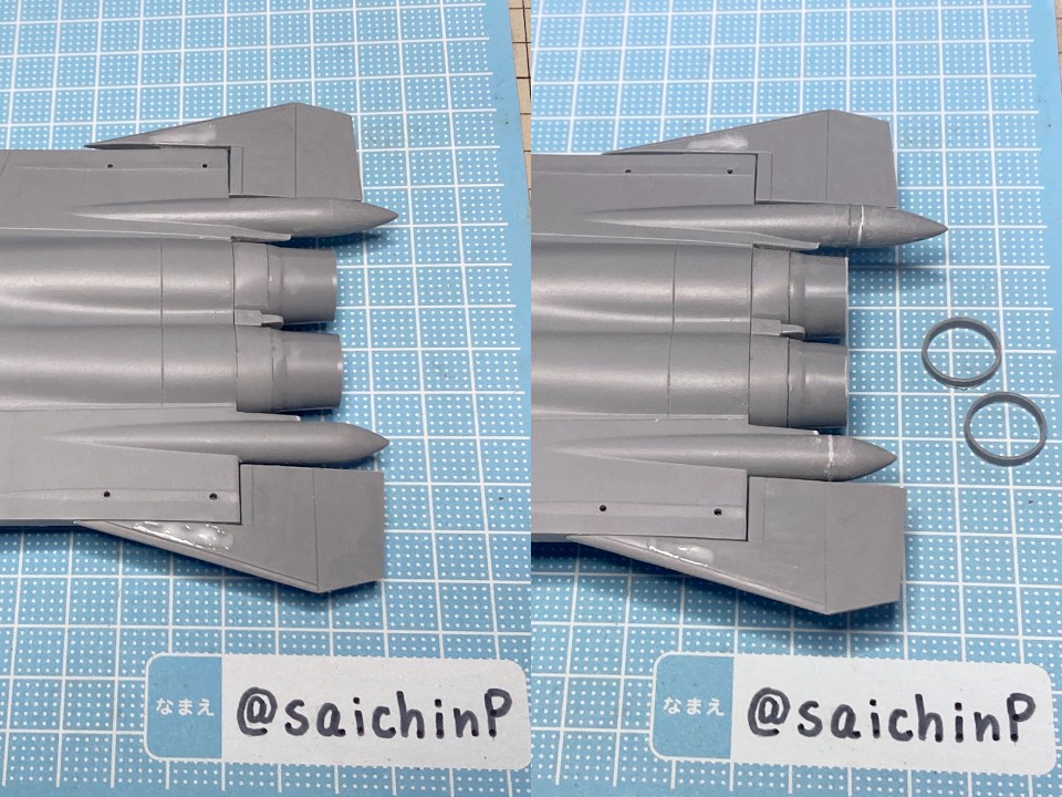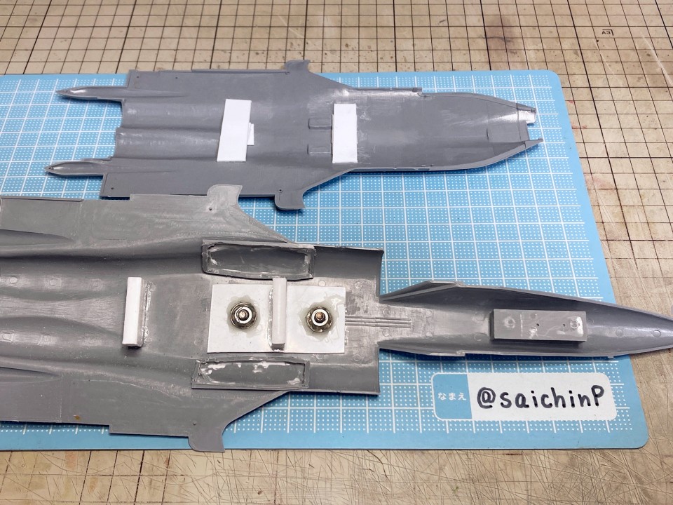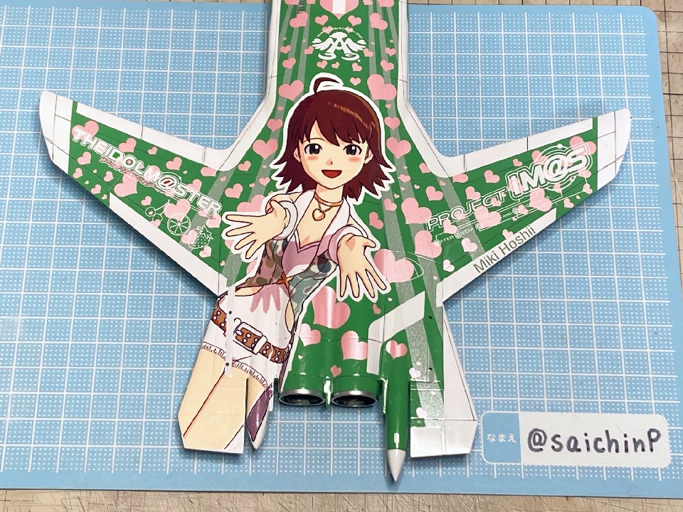 完成編の記事はこちら 美希の誕生日なのでSu-47を作りました キットの元はズベズダ製の物になります、国産キットのようなパチピタな組み立てやすさは期待できません。 実機は試作機だけでお蔵入りしているため、ゲームの仕様との違いも多々あります。 プラがすごく柔らかい(透明パーツも)のでヤスリがけの後は毛羽立ちを抑えるために速乾セメントを塗布して均すなどの工夫も必要です。 脚カバーを閉じて飛行状態にして額縁取付用のナットを仕込んでいます、これはいつもの。 胴体部に補強用の桁を追加しています、これやらないと作業中に胴体がベコベコになります。 主翼、カナード、垂直尾翼なども接着部は真鍮線などで要補強です。 改修点その1 エンジンのノズルを短縮。 左のテールコーンを短縮。 右のテールコーンを延長。 実機写真、ゲームCGと比較して各部の長さのバランスが明らかにおかしいので修正しました。 右のテールコーンはもう少し長くても良かったかも。 改修点その2 主翼前縁付け根にフィン(境界層板?)を追加。 でもこれは写真によっては太い凹モールドにも見えるので自信なし。 改修点その3 翼端灯(左右)のモールド追加。 改修点その4 機首左側に空中給油プローブを追加。 これは実機にはないゲームCGでのモールド。 改修点その5 機首下面(左右)にアンテナ(センサー?)を追加。 改修点その6 垂直尾翼後端の切り欠きの修正(左右) 左にライト追加。 ※写真左が改修後、右が改修前。 改修点その7 キャノピー後方、背中部分のアクセスパネルの位置修正。 これは塗装後にデカールとの位置関係がおかしくて気づいて修正。 や、やることが多い…… ゲーム内のCGに寄せるように各部にディテールを追加しています。 無改造だと他のアイマス機と並べた時にディテール密度の差が出てしまうので。 その他、パネルラインが左右や裏表でずれているということも多いので修正しています。 パネルラインが太いのは細めのラインチゼルで深く掘り直してごまかしています。 塗装はいつもの感じです。 下地に白を吹いてラインとアイドルデカール部分をマスキング。 基本色は以前にSu-33を作った時に混色したものをそのまま使用。 ノズルや細部の塗り分けと、マルチグレーでのスミ入れ。 クリアコートをしておけばメラミンスポンジで擦るだけで拭き取りが出来て楽です。 アイマス機で最長のキラキラなハの字デカールは分割して貼り付け。 ハートマークの貼り付けとアクセスパネルの四角モールド(改修点その7)の修正。 美希のデカールも最大級です。 私は破いてしまったので分割することをおすすめします。 この後、最終組み立てと半光沢クリアーを吹いての仕上げをして完成となります。 おそらく1/72アイマス機では難易度が一番高いかなと思います。 作業期間は約2ヶ月でした。 関連 美希の誕生日なのでSu-47を作りました Su-33 星井美希 制作編 A-10A 音無小鳥 制作編 PR |