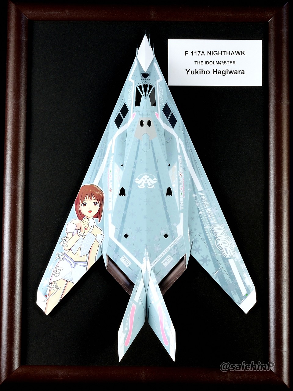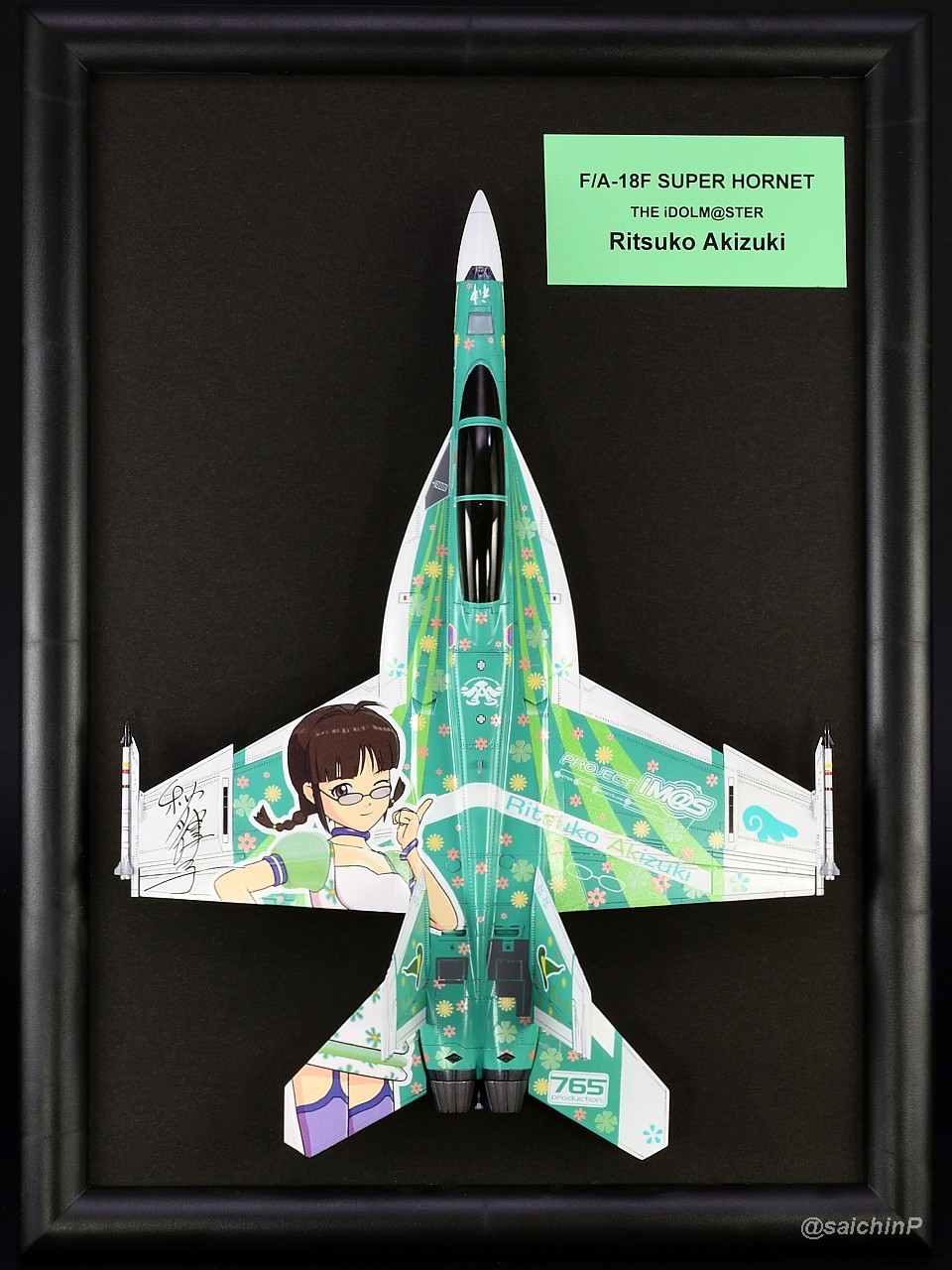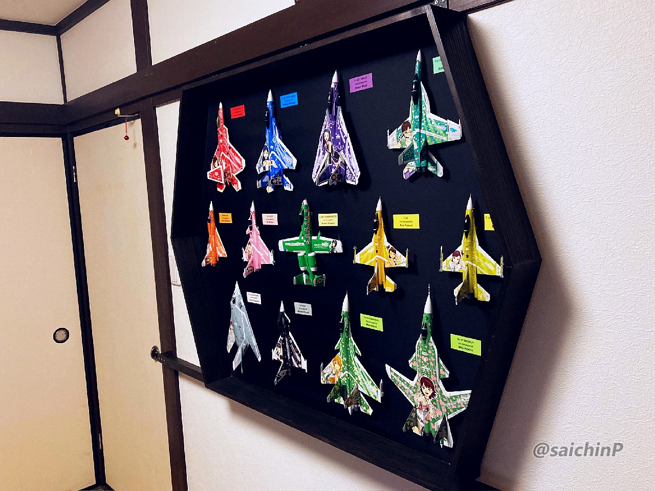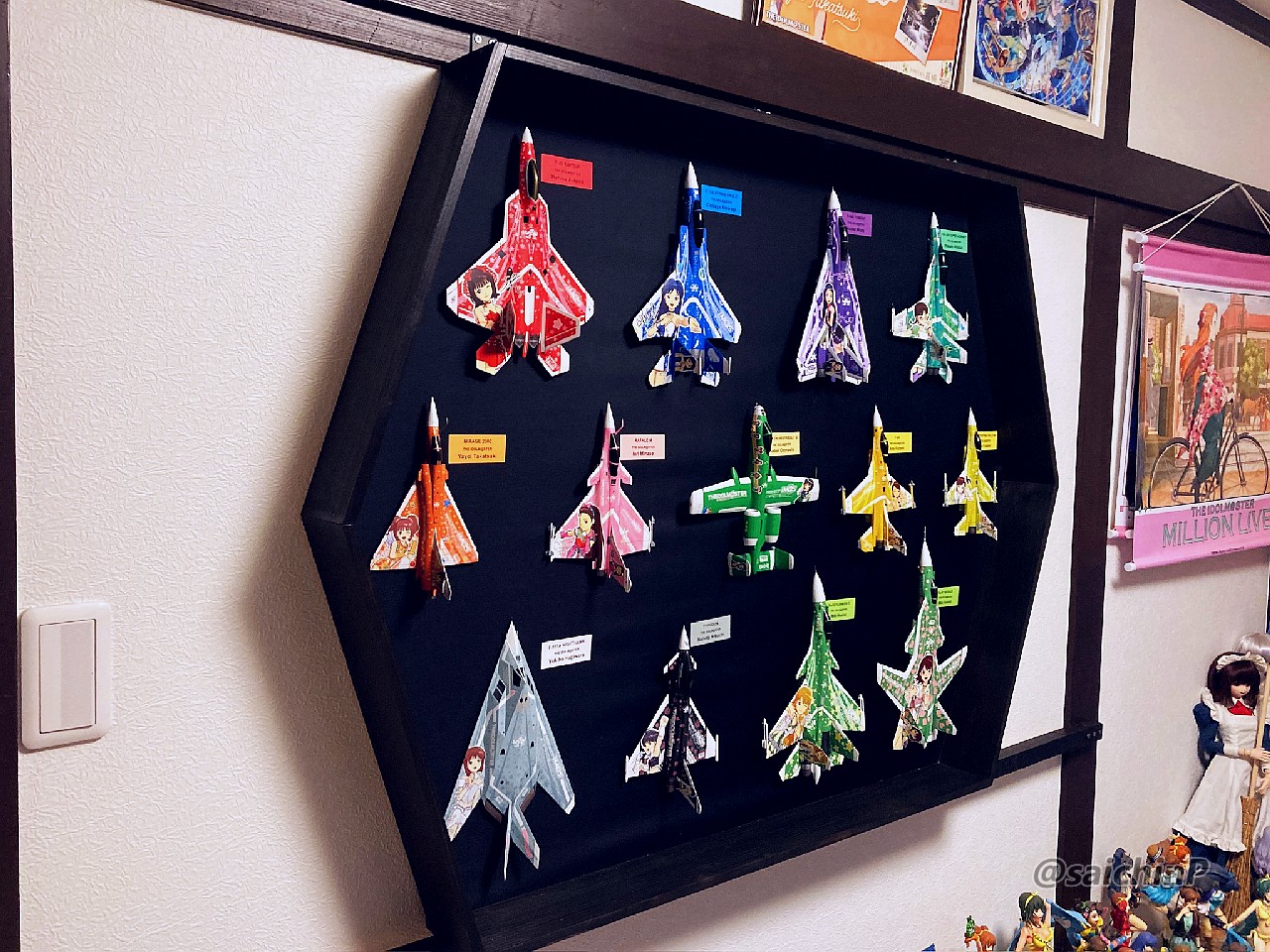 個別に額縁に取り付けて展示していた各機を専用の展示ケースを作りまとめて自宅の壁に固定しました。 自宅の壁にこれがドドンと飾られているのはなかなかのものです。 ケースは自作して壁にネジや釘で完全に固定しています。 一戸建ての持ち家なのでここまで趣味に走ってやることができました。 数機ならともかくアイマス機を全部作ったという人はそんなにいないと思いますのでその視点でまとめておきたいと思います。 ・額縁仕様について 前提としてアイマス機は主翼部の大きなアイドルイラストが要素の7割くらいを占めていると思っているので、それを一番見やすい状態で展示したいと考えていました。 そのために飛行状態で組む。だけど大抵のキットにはパイロットフィギュアがついていない。 なのでキャノピーはスモークグレーで黒塗りとしました。 これで、機体下面は作らない、脚とコックピットを省ける、となってかなりの省力化となりました。 外部搭載兵装類は基本的に省略でクリーンな状態、ただし翼端ランチャーは『下面ではない』ので省略せずにミサイルを搭載するように統一しました。 おかげで、WF参加の原型作業などに時間を取られつつも3年で全機完走できました。 ・塗装かデカールか アイマス機でデカールの透け防止に白で塗るのはある種定番的な作業です。 私は雪歩機は機体色が白に近いので白ラインはデカールを使用しました。デカールの透け防止の白塗装もなしです。 あとは亜美機の翼端はデカールで白帯を貼りました。 それ以外はすべてマスキングで白ライン等を塗装しています。 個人的には機体の縁に沿うような白ラインはデカールよりも塗装のほうが楽です。 ただしキラキラハの字は塗装では無理かなと思ったのでそのままデカールです。 あと、デカール貼りはヒートガンで熱して軟化させるのと、ハイキューパーツのデカールスキージーで押さえつけて密着させるのが最強かなと。 ソフターやセッターといったケミカル類はほとんど使っていません。 ・代替キット? 私が組んだのは発売当時に購入してそのまま押入れに十数年寝かしていた当時物です。 デカールの劣化は特に感じなかったですね、白ラインは割れやすい印象があります。 私は今回はポリシーとして当時のキットを使って作ることに決めていましたが、そう言うこだわりがなければ難易度ランキングで下の方にある手間がかかりそうなキットはその後に出た新金型の新キットを使用するのもありだと思います。 タイフーンなんかはハセガワ純正で新金型キットが出ましたからね。 ただし別キットにしたらデカールのサイズが合わない可能性があるのでその修正とどっちが楽かは私は未検証です。 ・成形色と染み上がり ハセガワ製と中身レベル製はアイドルのイメージカラーが成形色になっていて、中身がその他メーカー製のものは成形色がグレーです。 組む前に色つきのものはランナーを薄め液につけて確認しましたが染料が染み出したのはピンク色のF-22だけでした。 なのでF-22だけは対策として下地を銀サフとアクリジョンの白で塗っています。 検証用に春香F-22のランナーに塗って2025年2月から放置して観察しているのですが何もしてないサンプルも特に染み上がりは確認できません。 F-22の増槽のピンクランナーに クレオスグレーサフのみ ガイア銀サフのみ アクリジョンベースホワイトのみ 銀サフ+アクリジョンベースホワイト をそれぞれ吹いて、その上にクレオスGX1白を吹いて2025年2月1日から放置しています。 これが2025年4月21日の状態です。 特に変化なし。 これだと普通にグレーサフだけで良かったのかとなりますが…… ここからは各機のレビューですが記載順は作るのが楽で簡単な順です。カッコ内の数字は完成日(年.月)です 上ほど簡単で一番下が最難関です。(かなり個人的な主観で、なおかつ下面を作らない額縁固定での難易度です) F-117A 萩原雪歩 (2023.12) 特異な形状のステルス機故に、パーツが少なくてあっという間に形になり、パネルラインもほぼなしで複雑な曲面もない平面の組み合わせなのでとても作業がしやすいです。 さらに機体色が薄い青灰色なのでデールの下地を白で塗り分けずそのまま貼り付けています。 各部の白ラインも白塗装ではなく付属デカールで仕上げました。 関連:雪歩誕生日なのでF-117Aを作りました F-2A 双海亜美 (2023.5) 通常版とパールデカール版があります。 ハセガワスタンダードといった感じで癖のない作りやすいキットでした。 アイマス機としては初期に製品化されていたため、翼端の白帯デカールや亜美の肌色の色味など、こなれていない部分もありますが単体としてみると問題なしでしょう。 関連:亜美誕生日なのでF-2Aを作りました F/A-18F 秋月律子 (2022.6) 最初に作った物ですがこれも新しめのハセガワ製なので組むのは問題ないです。 ただこの後に出てくる機種もそうですが、双発機はどの機もエアインテーク周りの嵌合やすり合わせなどの調整